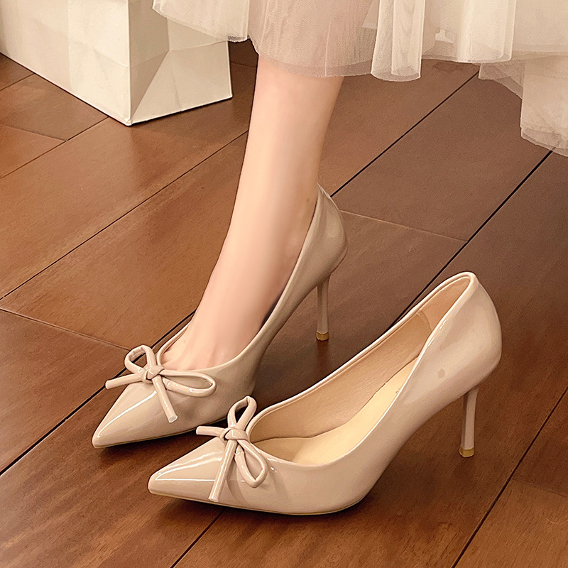 2025 새로운 가을 스타일 누드 보우 하이힐 여성 달콤한 요정 스타일 여성 뾰족한 발가락 기질 스틸레토 힐 틈새 신발스토어 가기