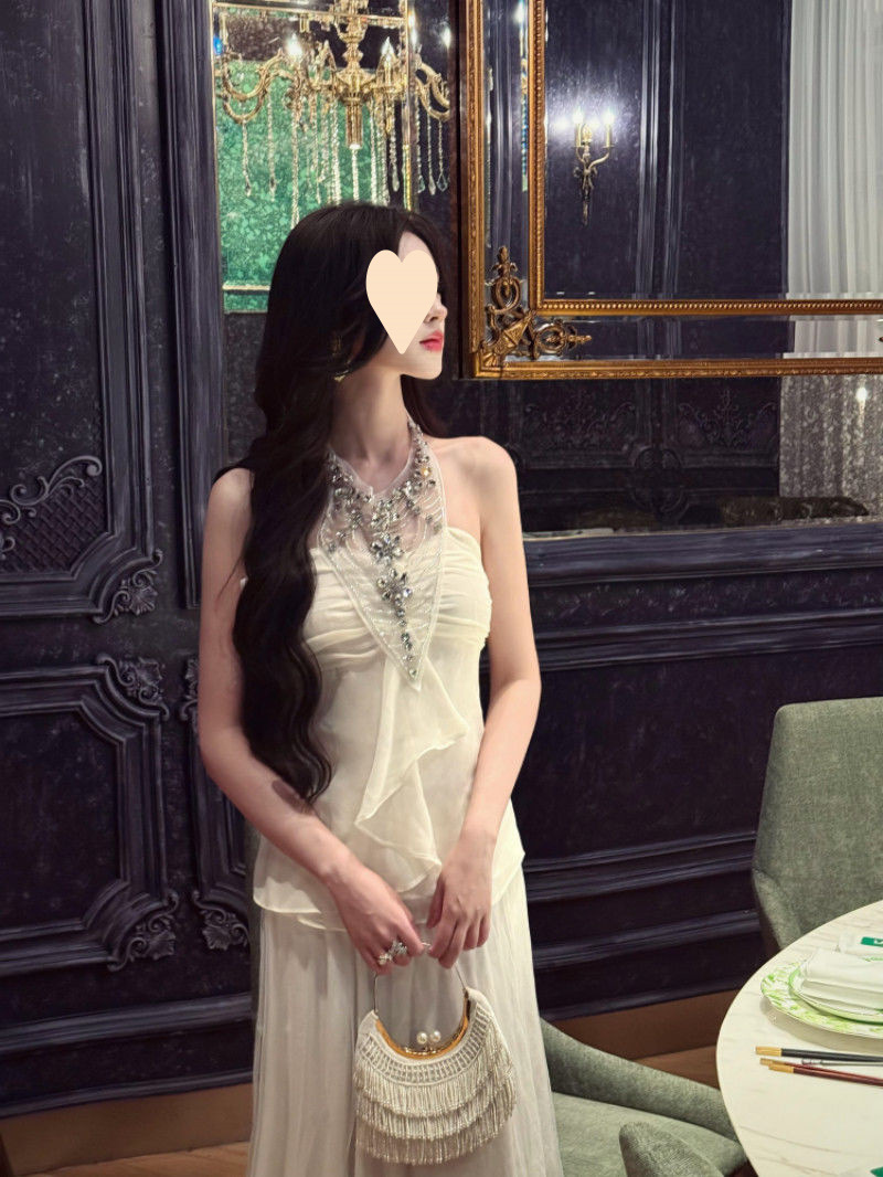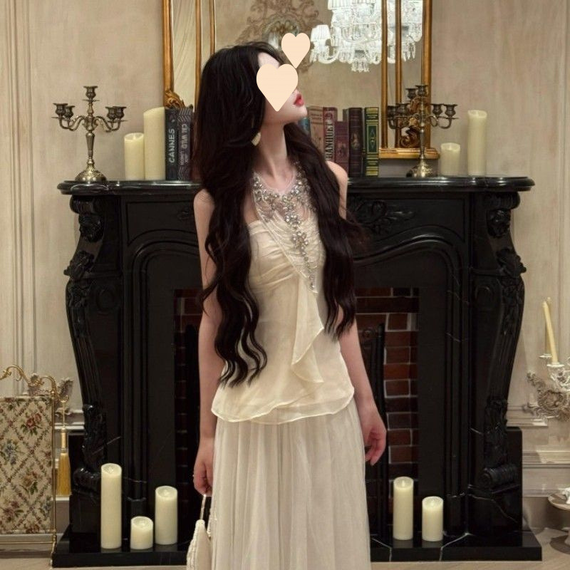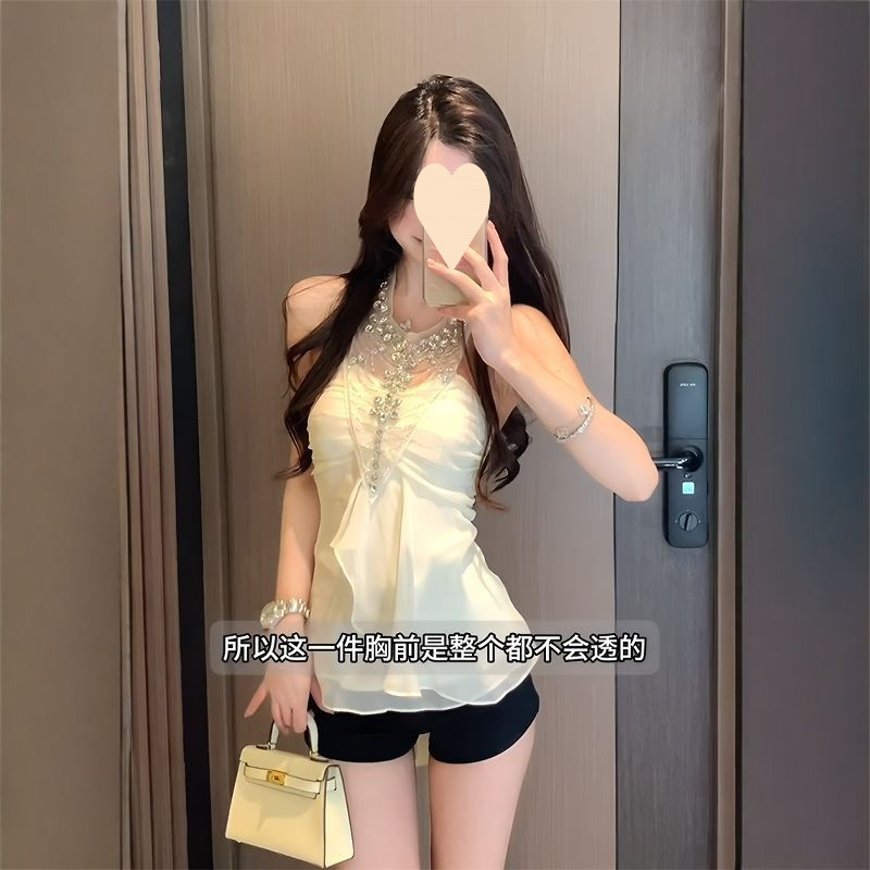 여름 아우터로 착용할 수 있는 다이아몬드가 박힌 홀터넥 튜브탑 민소매 조끼, 순수한 욕망, 섹시한 핫걸 기질, 여성용 쉬폰 셔츠 탑
