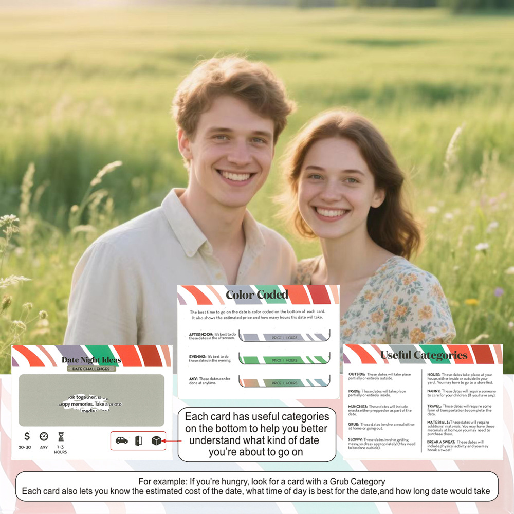 • KEEP DATE NIGHTS EXCITING: There's a good chance you remember the exact moments that led you to going on your first date with your partner. Remember the excitement & happiness that you felt that day? As your relationship matures it's very important to keep things fresh and exciting. The purpose of these cards is to do exactly that. To bring excitement and happiness into your relationship with these fun and adventurous date ideas.