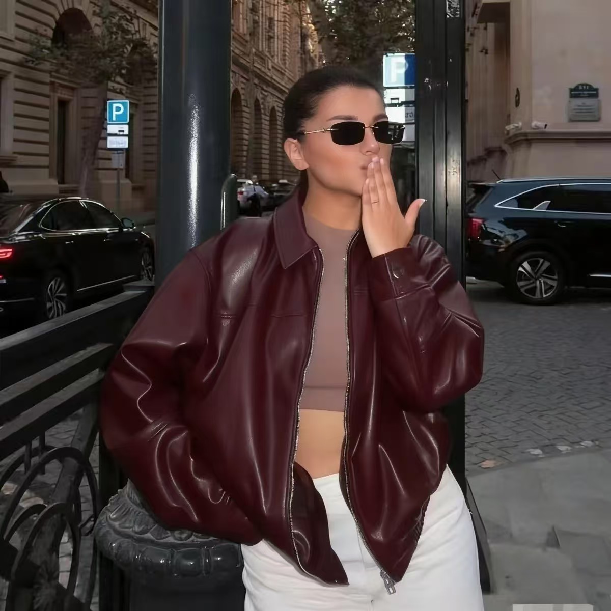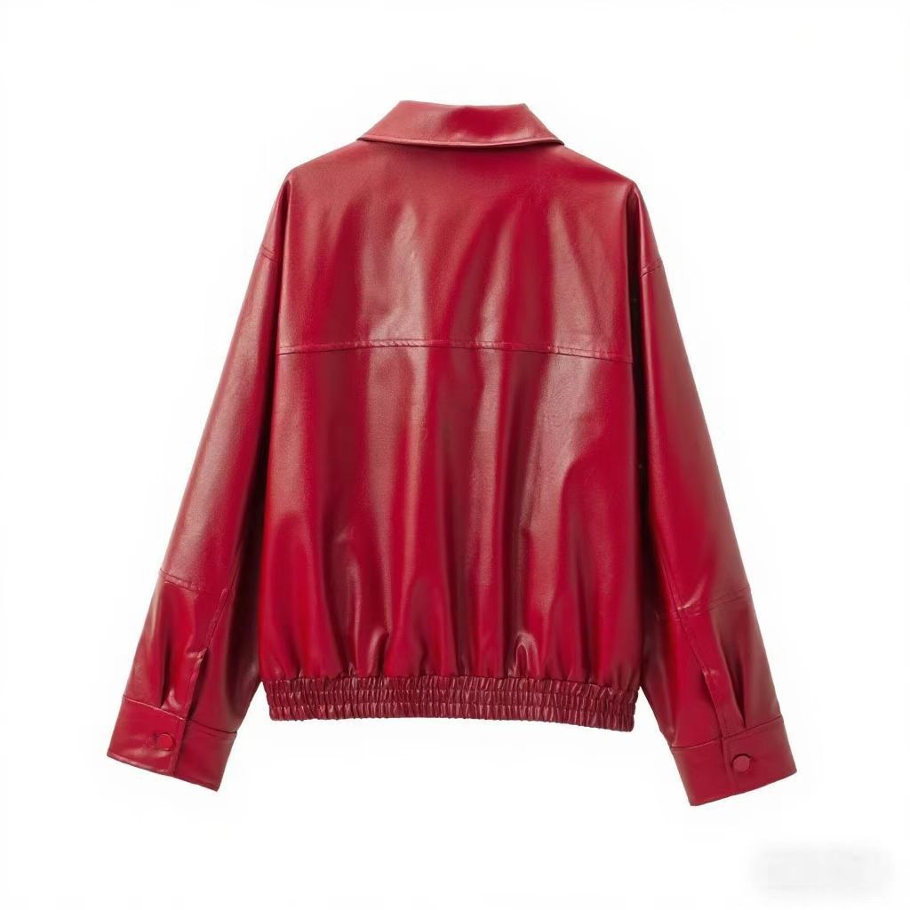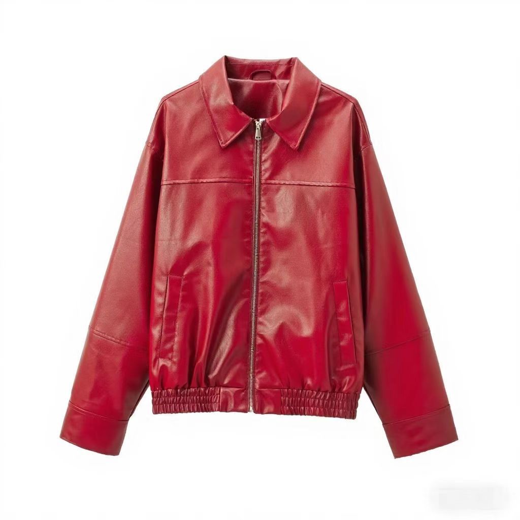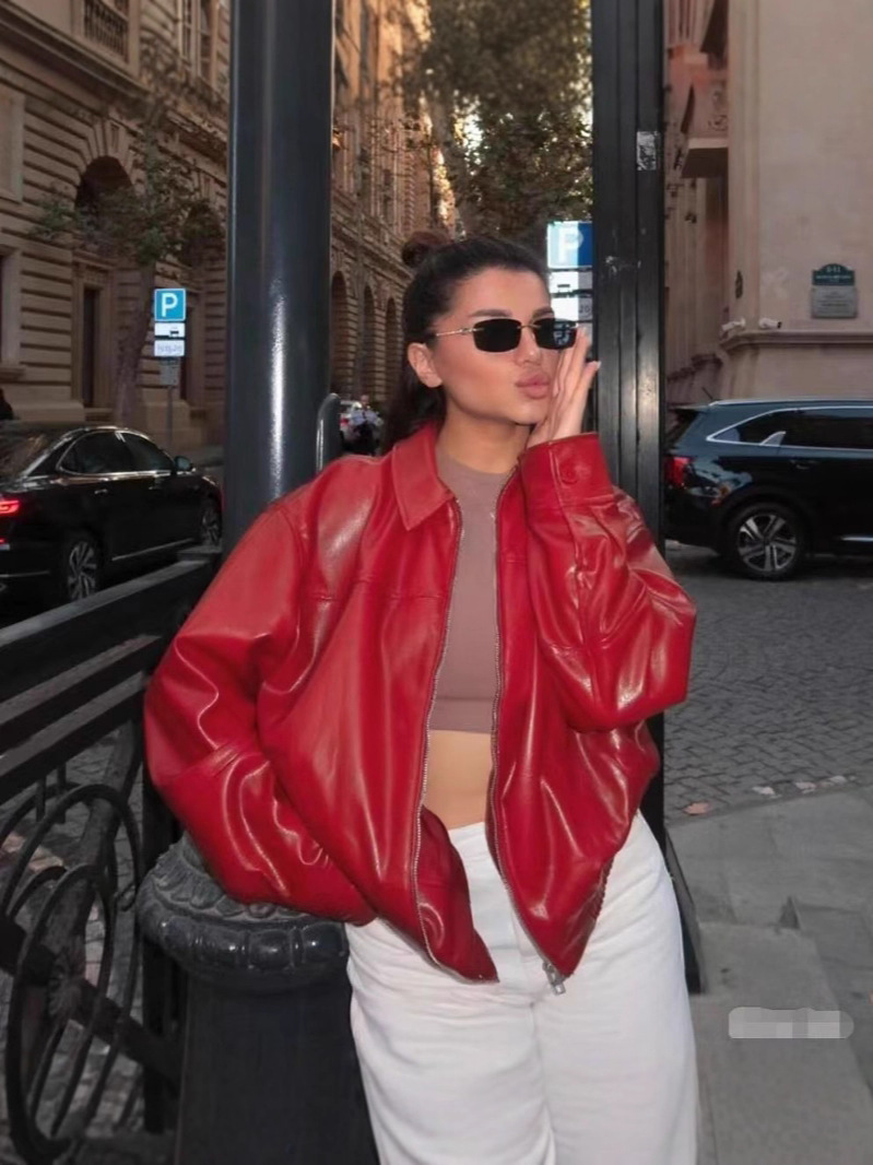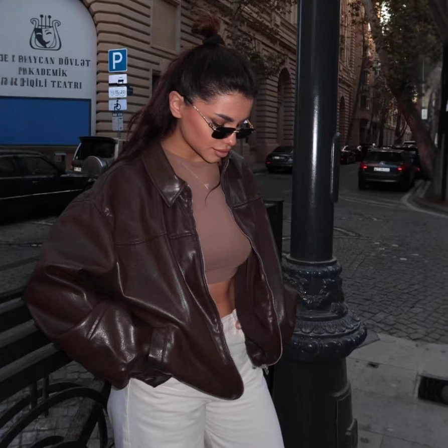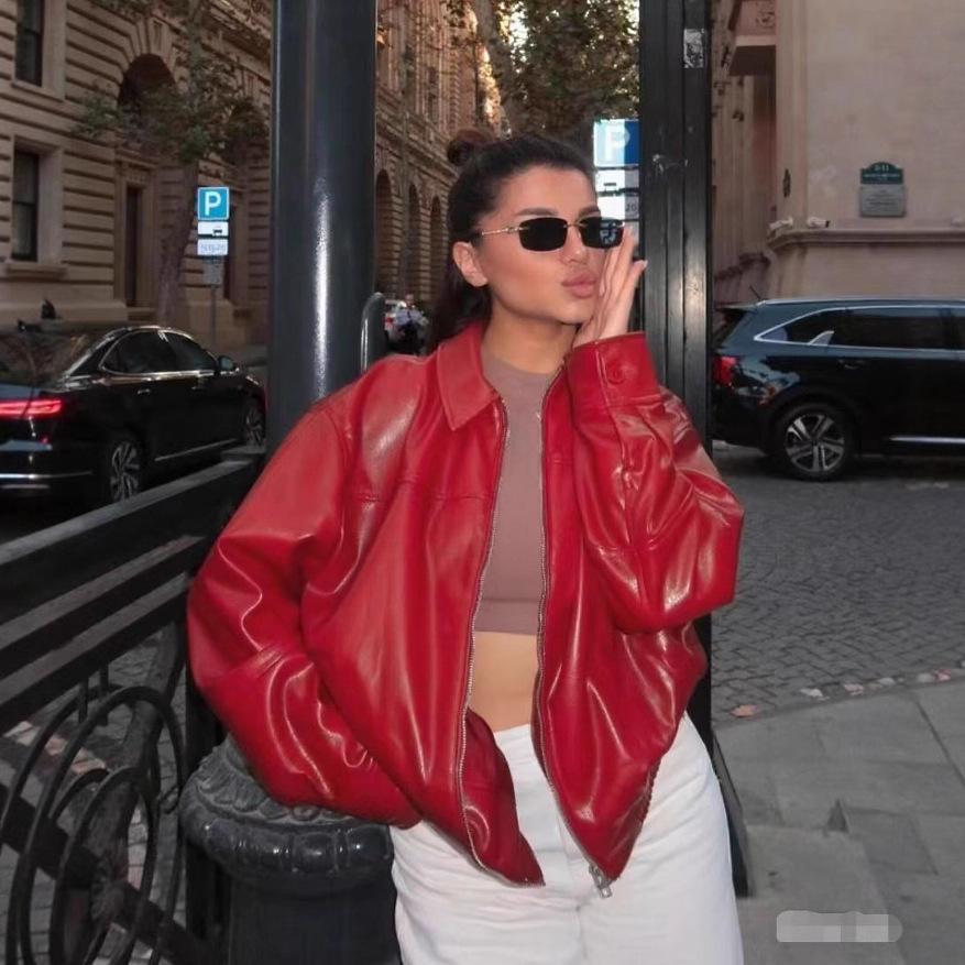 유럽과 미국 의류 도매 2025 봄 신작 캐주얼 질감 폭격기 재킷 느슨한 버전 여성 가죽 코트스토어 가기