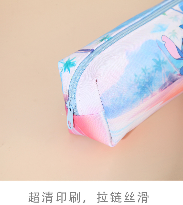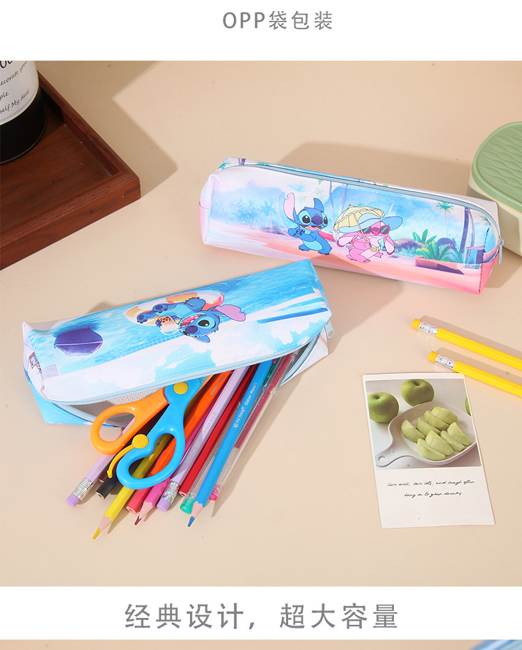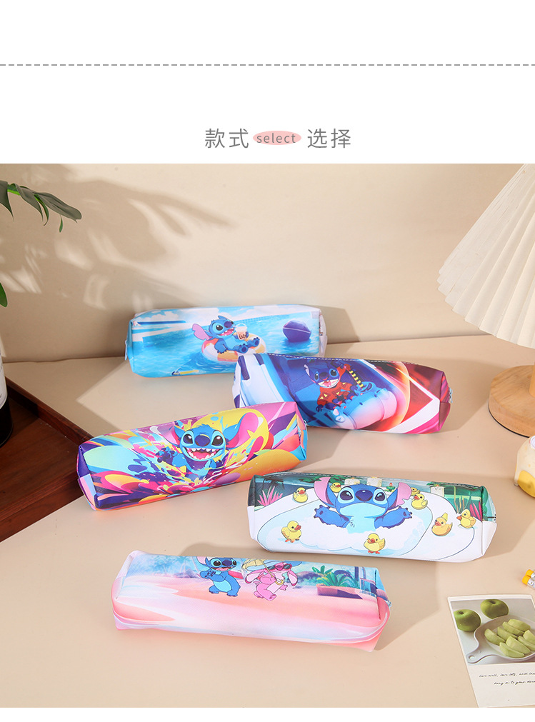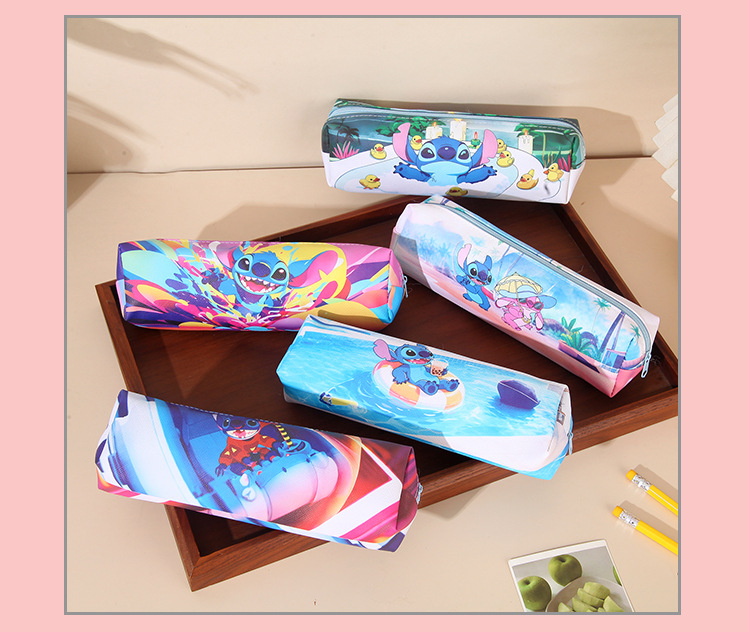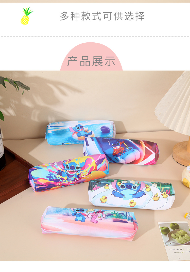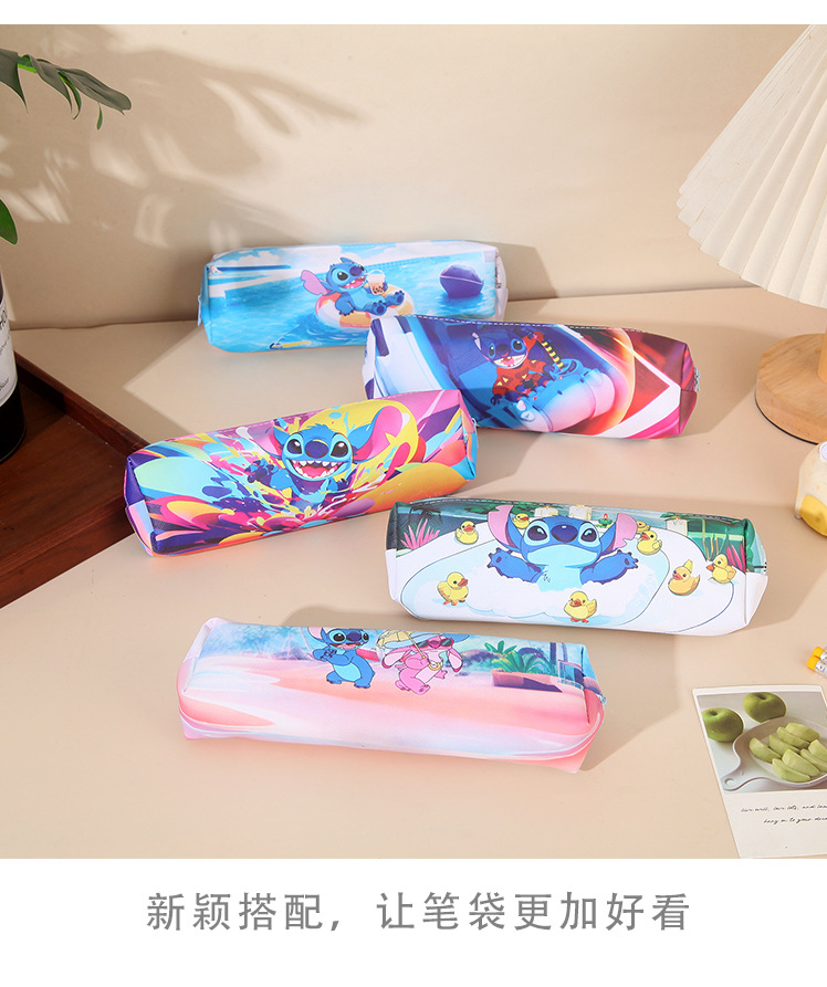 새로운 만화 스티치 어린이 연필 가방 pu 양면 전체 인쇄 연필 가방 대용량 학생 문구 보관 가방
