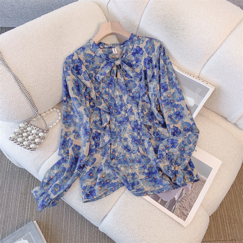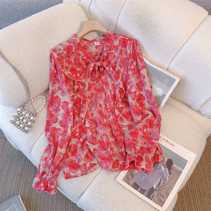 2025 봄 쉬폰 셔츠 여성 긴팔 리본 프릴 프린트 보우 셔츠 탑 트렌디 다용도 슬리밍 새로운 스타일