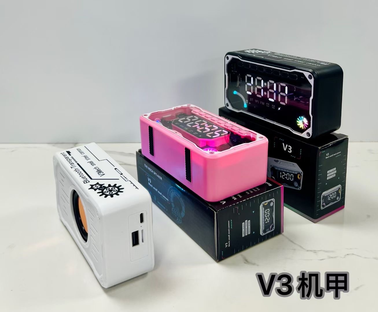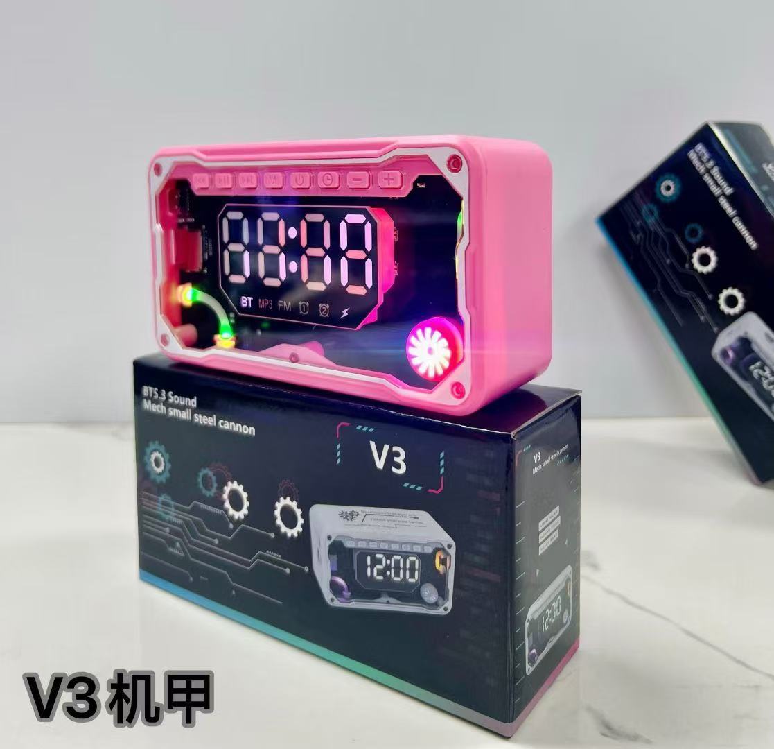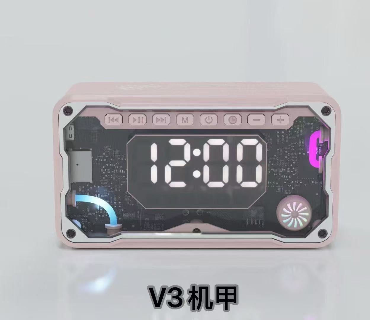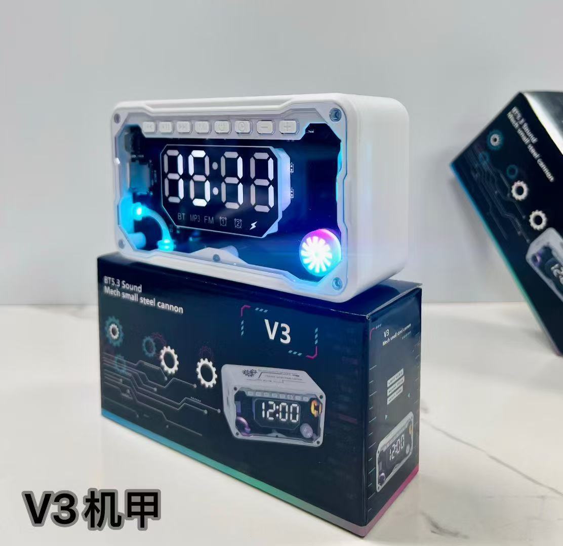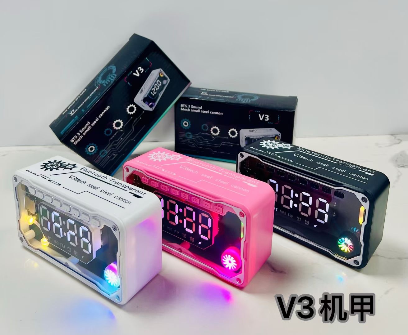 跨境爆款v3闹钟蓝牙音箱透明机甲小钢炮便携式桌面低音炮插卡礼品小音响