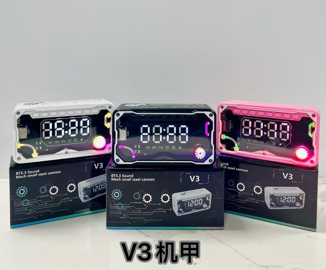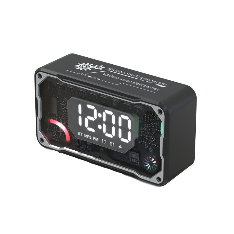 국경 간 인기 v3 알람 시계 블루투스 스피커 투명 메카 소형 강철 총 휴대용 데스크탑 카드 선물 소형 스피커