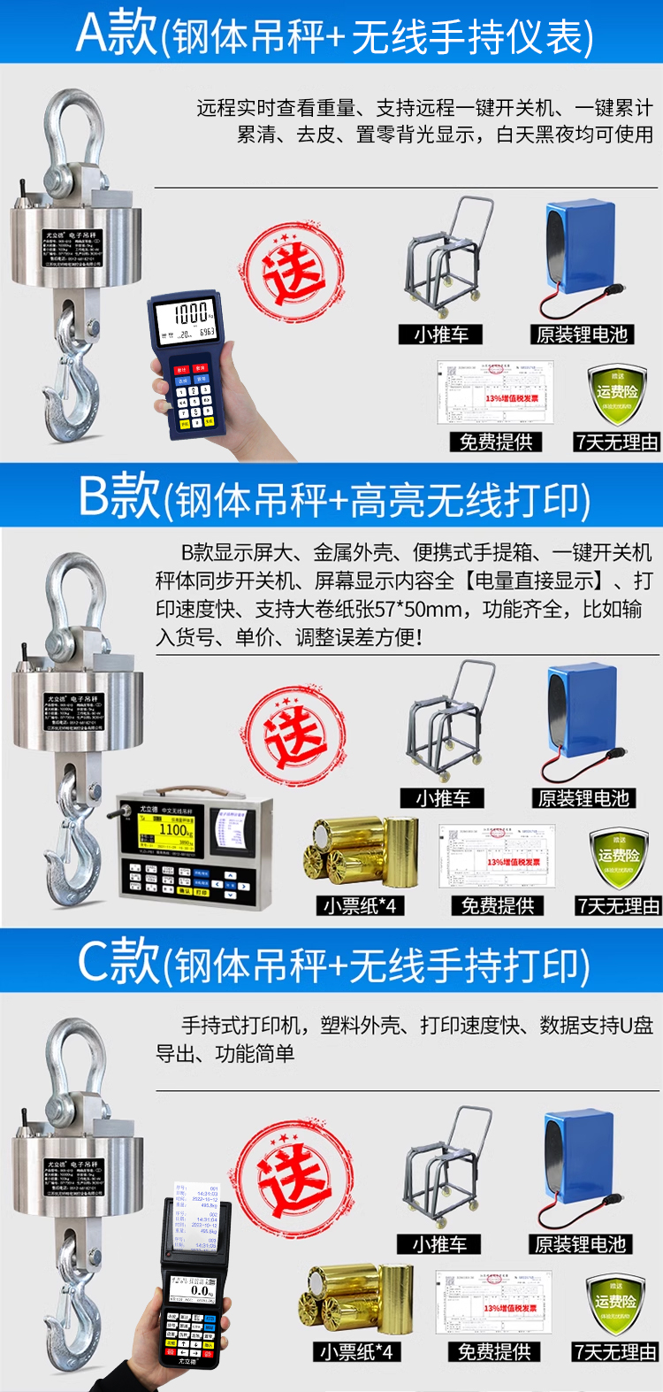 • [3톤] 스테인레스 스틸 크레인 스케일 + 무선 휴대용 인쇄/공장 직영, 트롤리 포함, 듀얼 배터리