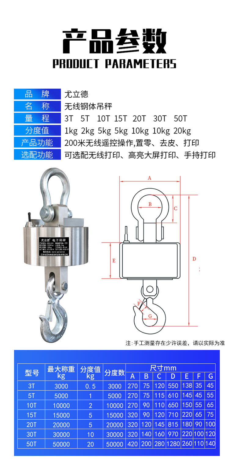 • [50톤] 스테인레스 스틸 크레인 스케일 + 무선 인쇄 장비/공장 직영, 트롤리 포함, 듀얼 배터리