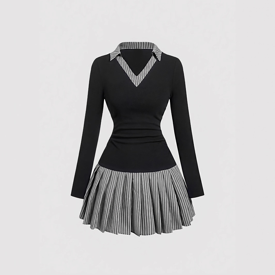 한국 대학 스타일 가짜 투피스 스트라이프 스플리싱 긴팔 초가을 새로운 스타일 슬리밍 및 연령 감소 소녀 드레스스토어 가기