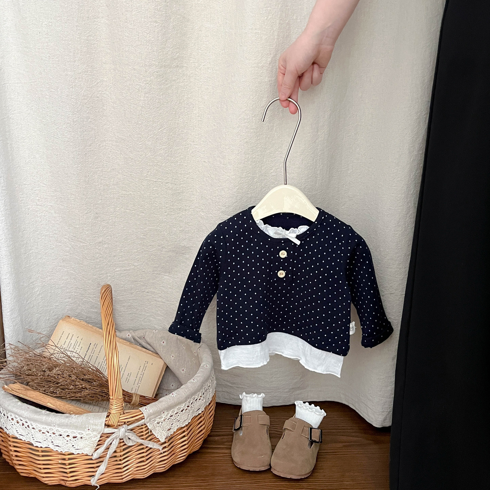 여아 긴팔 면 티셔츠, 여아 가을옷, 2025 신작 폴카 도트 바닥 셔츠, 페이크 투피스 다용도 탑, 봄스토어 가기