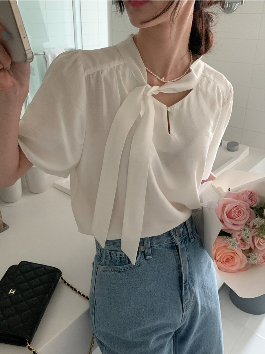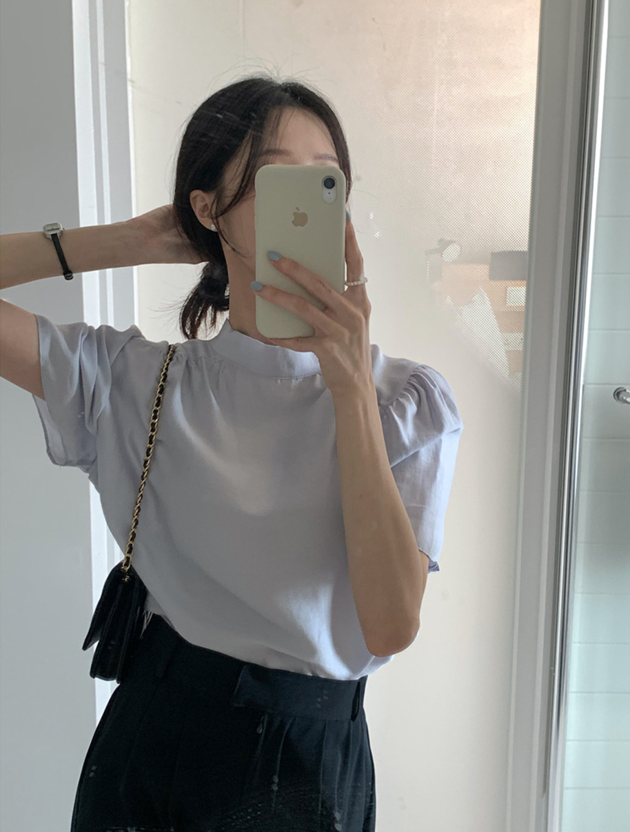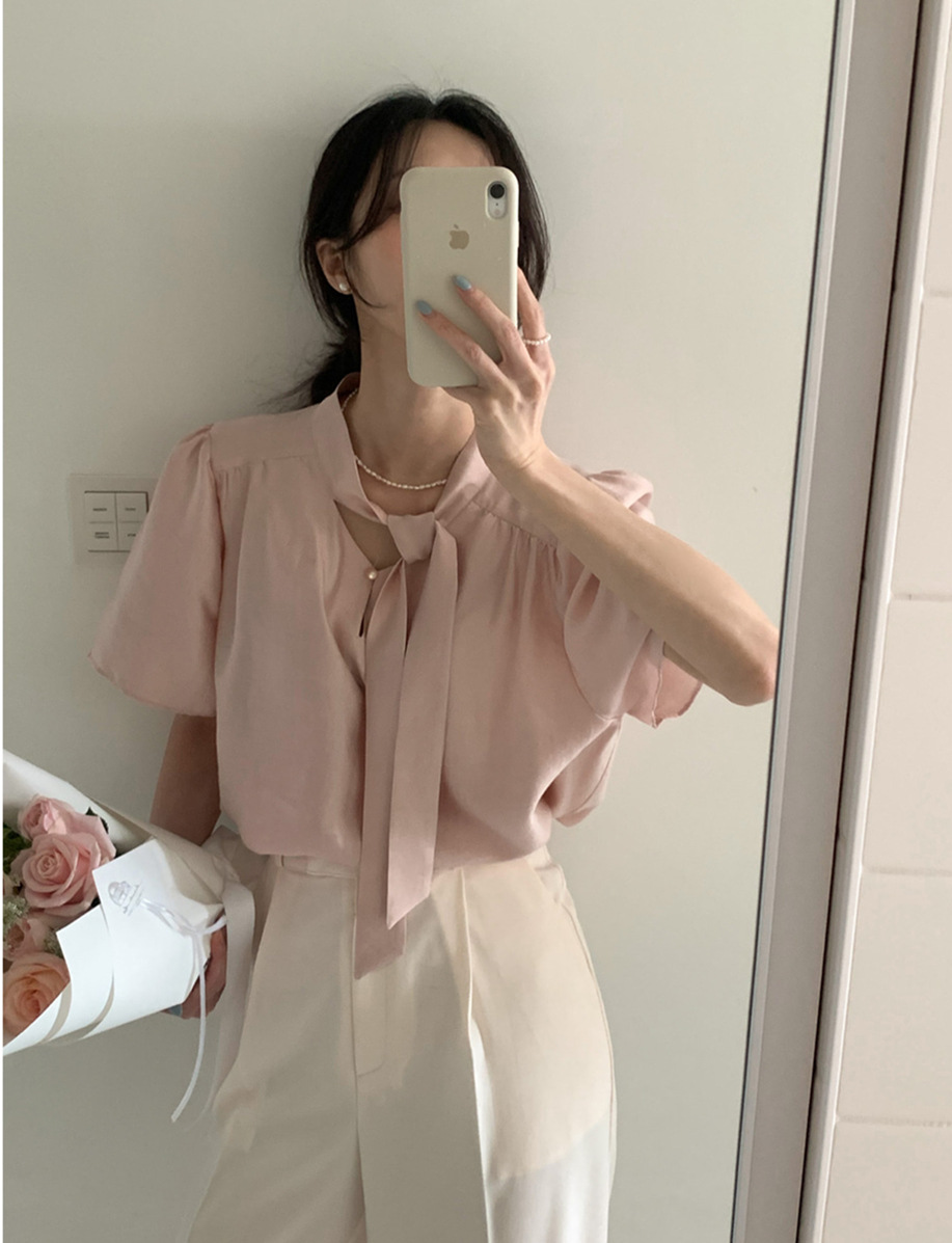 한국 시크 프렌치 젠틀 스타일 플라잉 칼라 앞뒤 디자인 루즈 슬리밍 퍼프 슬리브 쉬폰 셔츠 여름 드레스스토어 가기