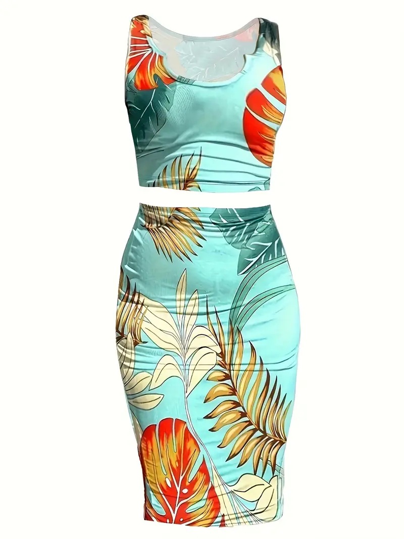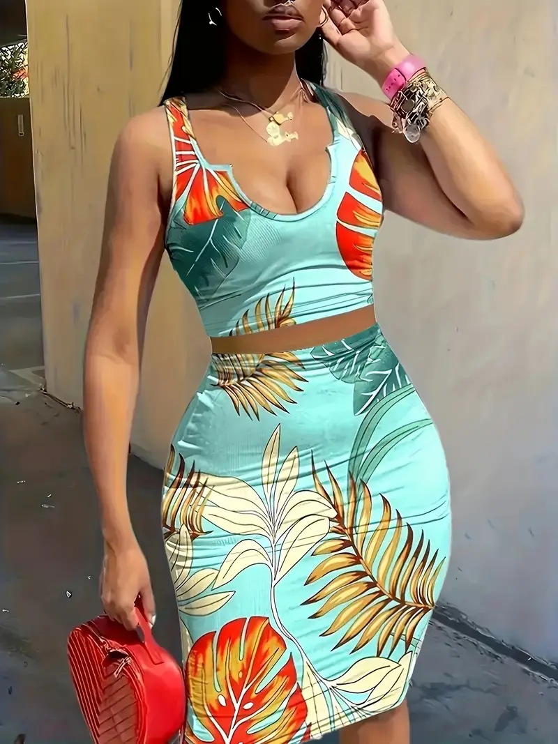 2025 유럽 및 미국 해외 직구 아마존 패션 우아한 여성 조끼 식물 프린트 스커트 세트