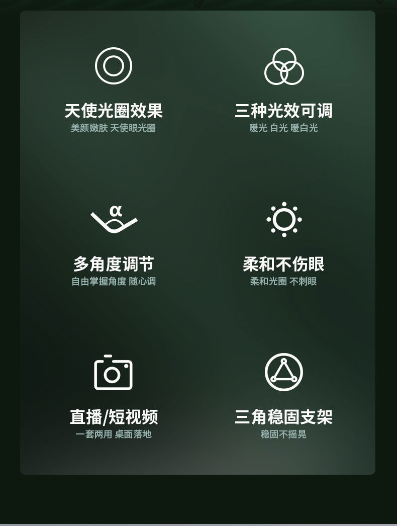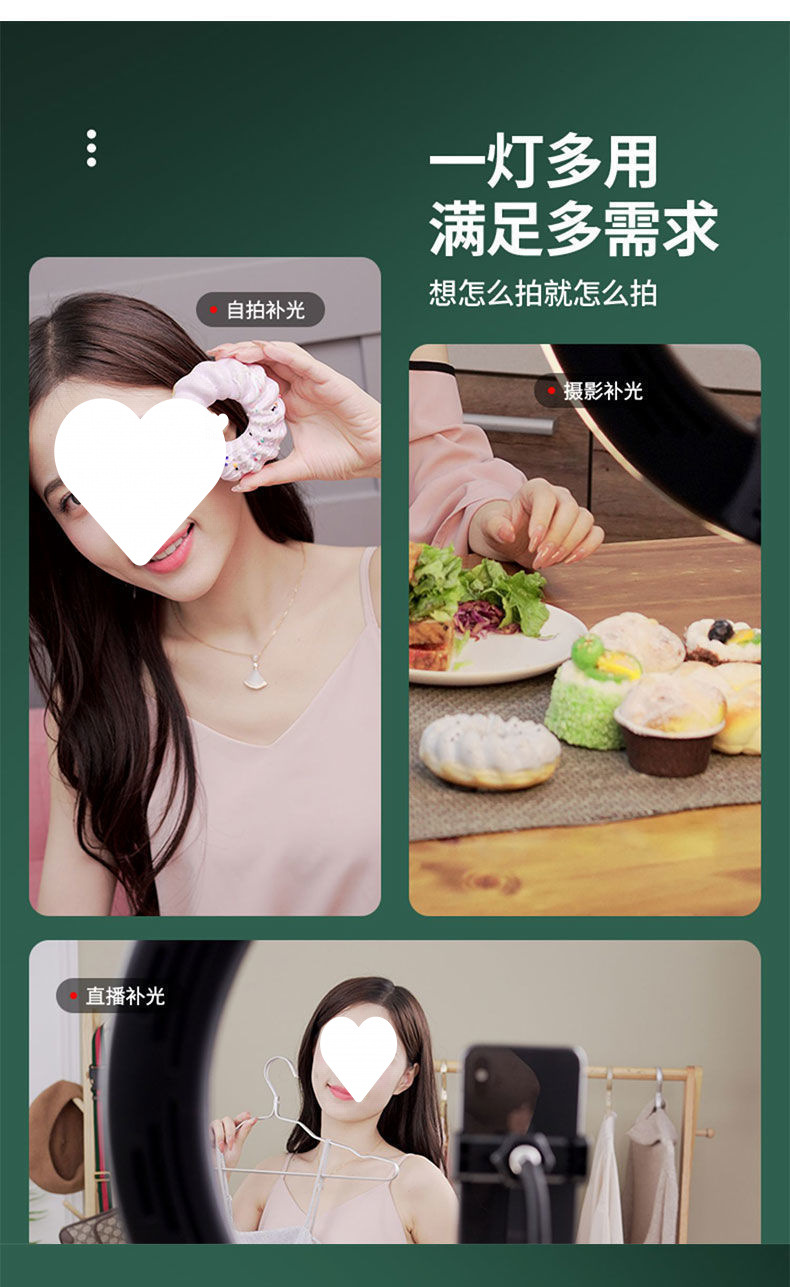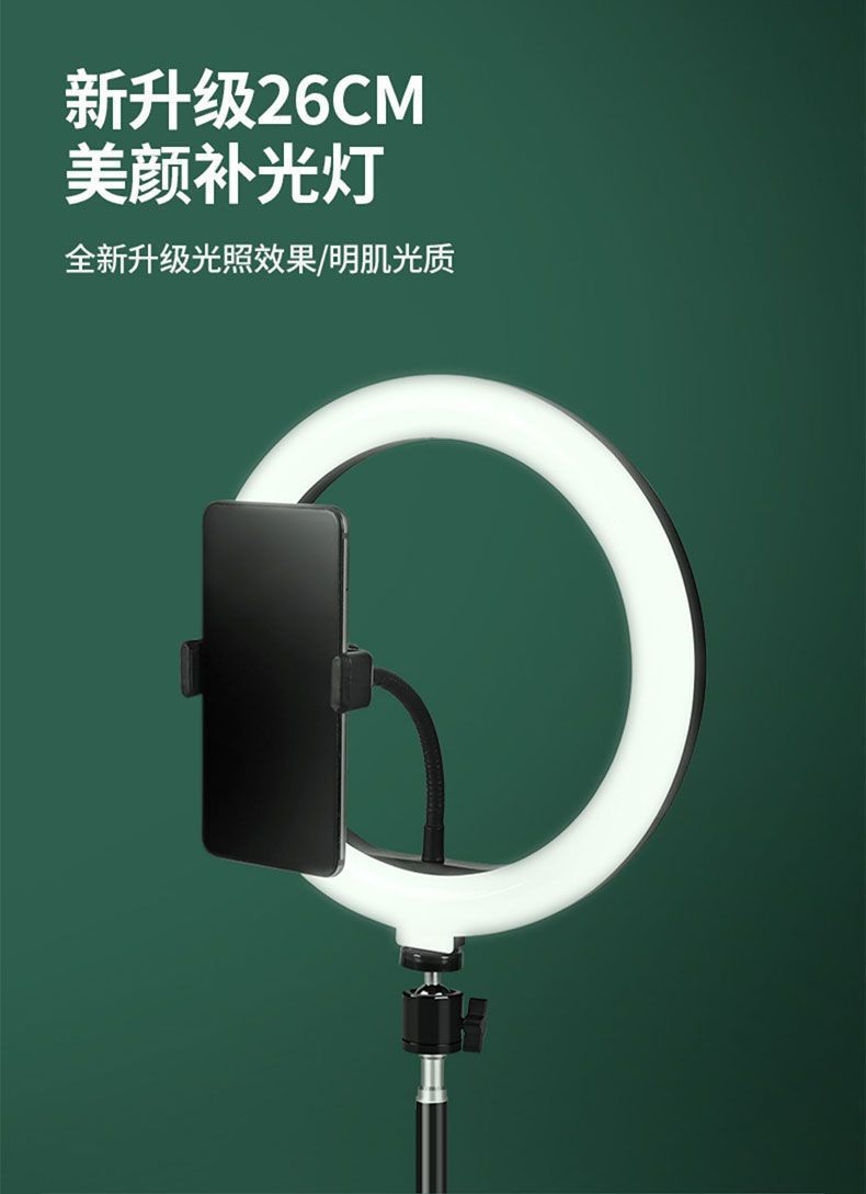 • 2m 삼각대 [다각도 가로 및 세로 촬영] + 휴대폰 클립 + 팬/틸트 + 보관 가방 + 26cm 필 라이트 + 추가 카메라 위치