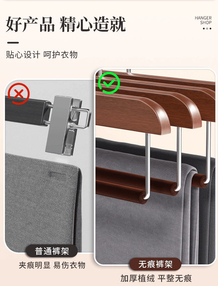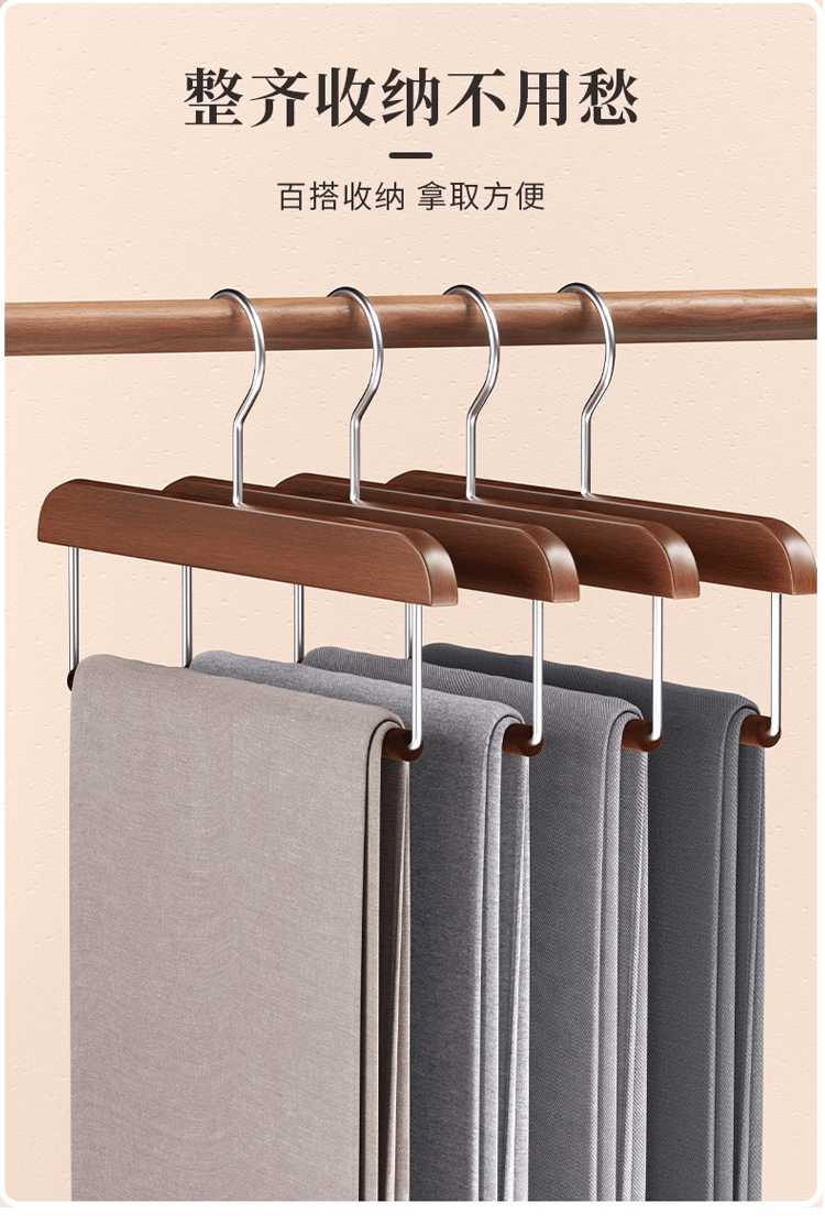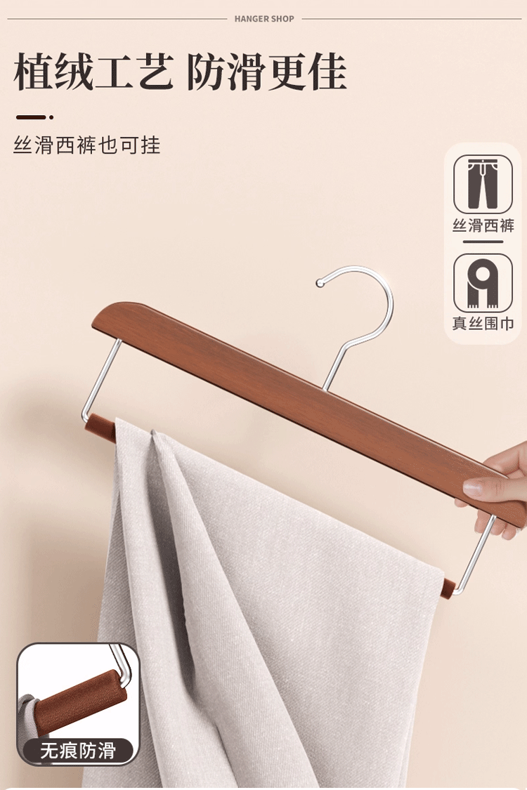 단단한 나무 플록 바지 걸이, 흔적 없는 미끄럼 방지 바지 걸이, 가정용 나무 바지 보관 걸이, 옷장 바지 걸이 도매스토어 가기