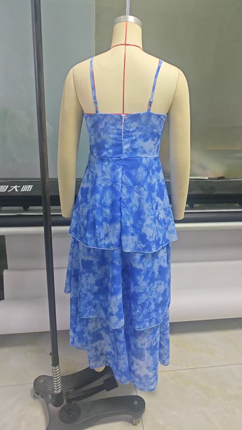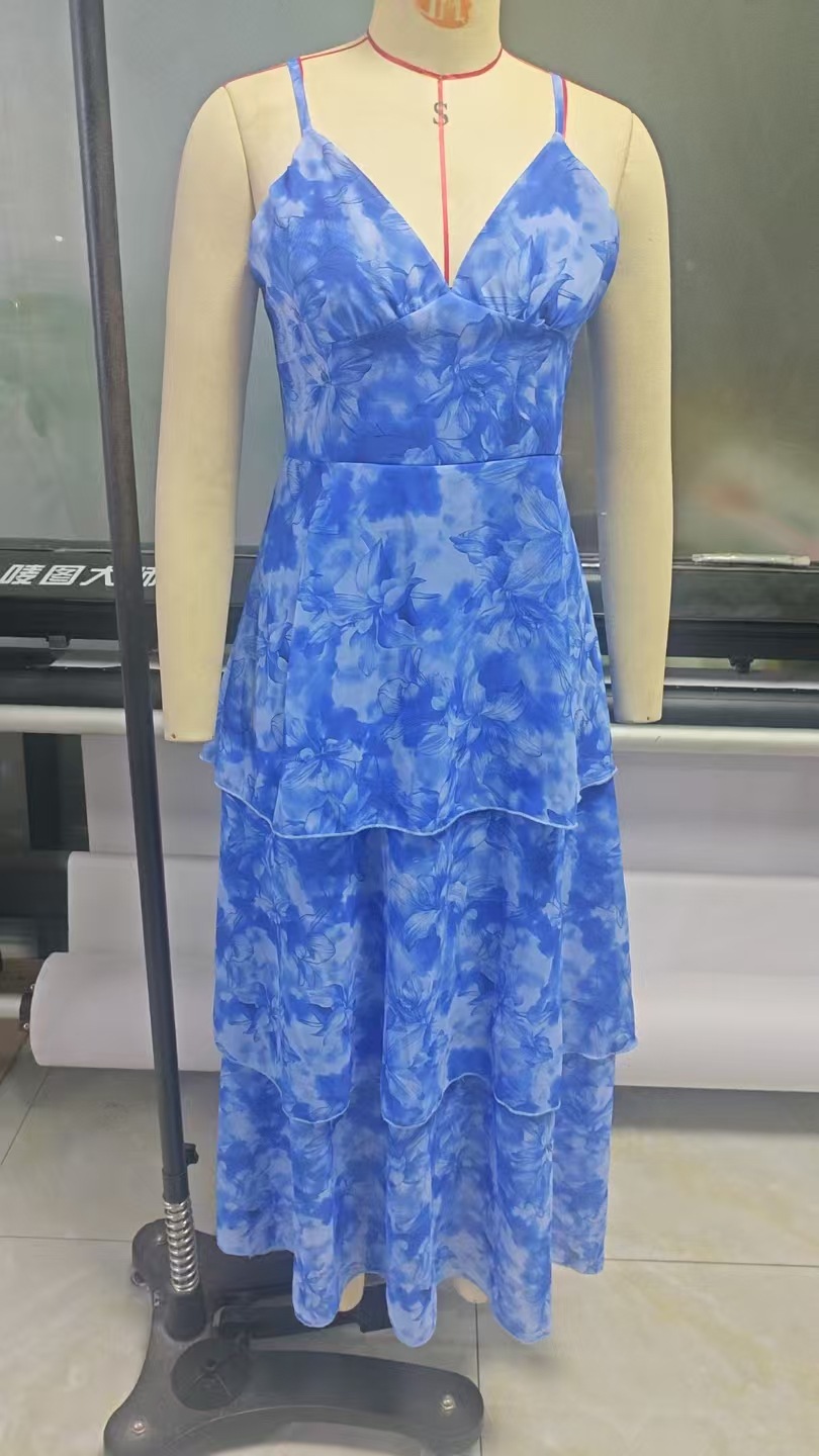 유럽과 미국의 국경 간 2025 Amazon 독립 스테이션 프린트 쉬폰 여성용 V 넥 서스펜더 케이크 드레스