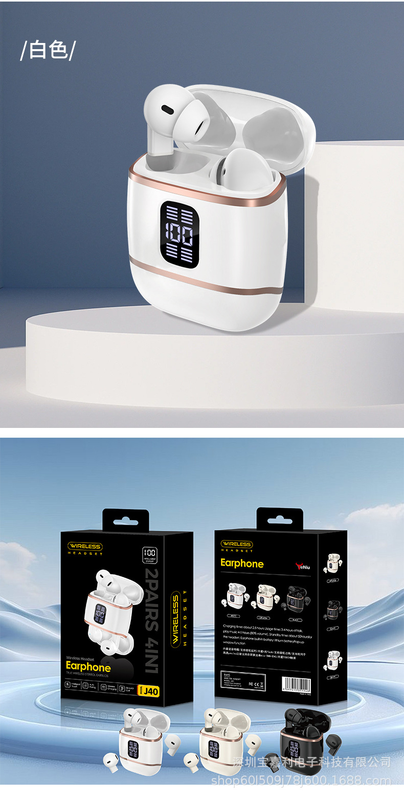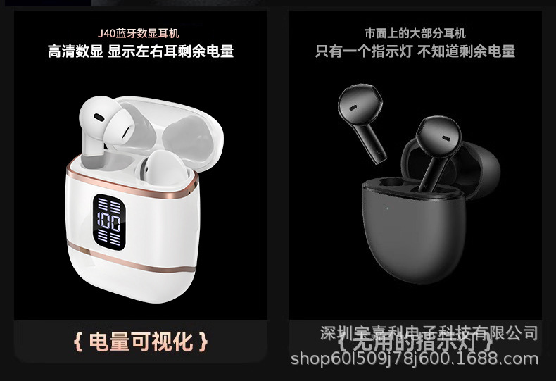 국경 간 인기 J40 블루투스 헤드셋 TWS 무선 귀 장착형 초장기 배터리 수명 디지털 디스플레이 전원 스테레오 4 헤드셋스토어 가기