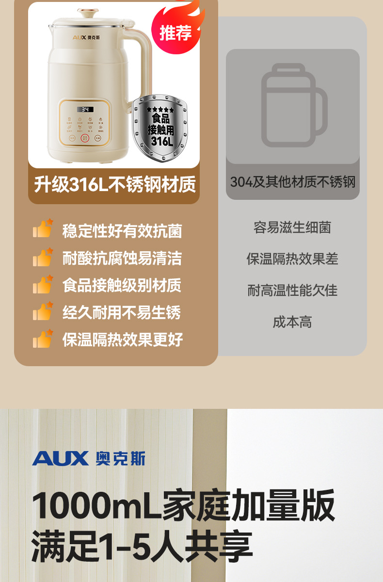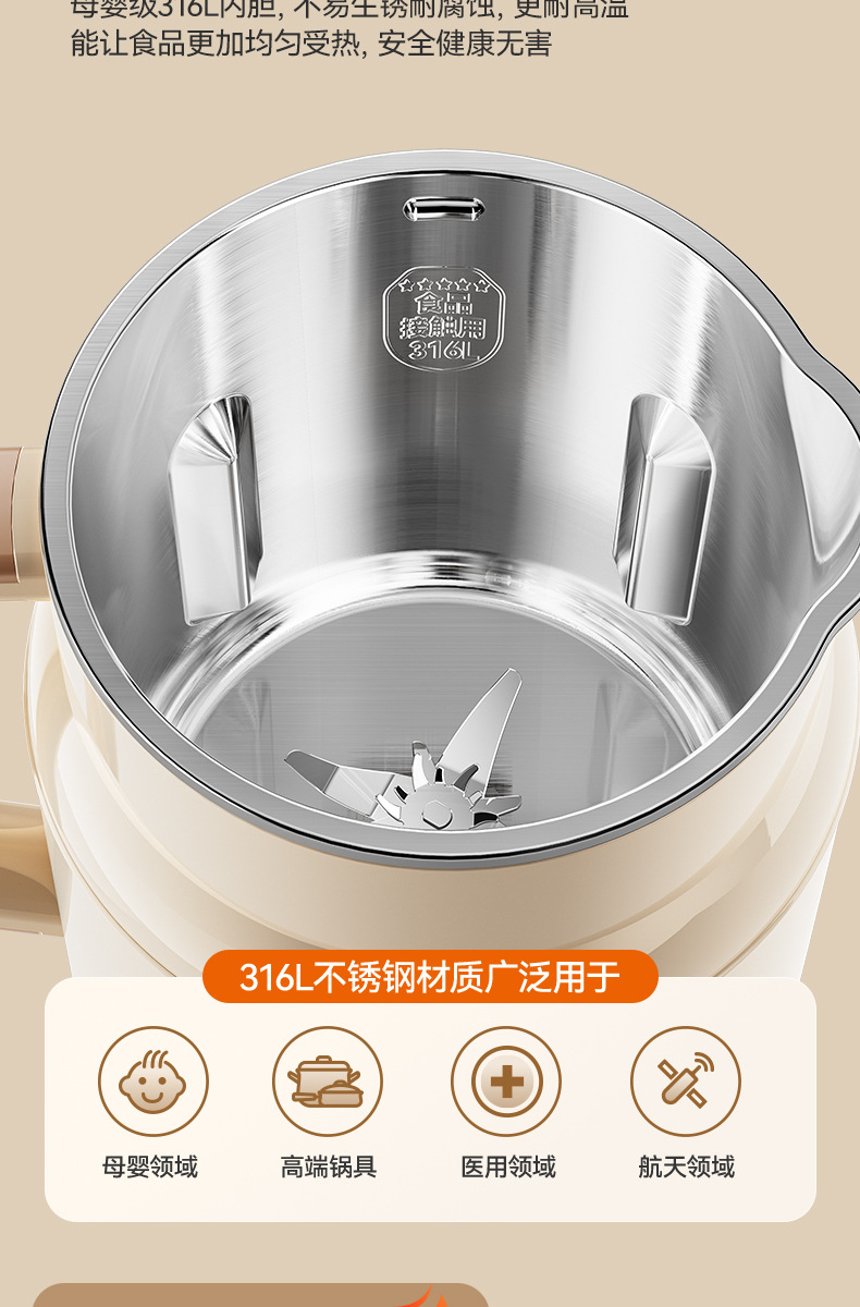 • [1~5인용으로 업그레이드된 316L 스테인리스 라이너] 1000ml 대용량 + 34분 빠른 슬러리 제조 + 건조콩을 직접 담그지 않고 직접 블렌딩