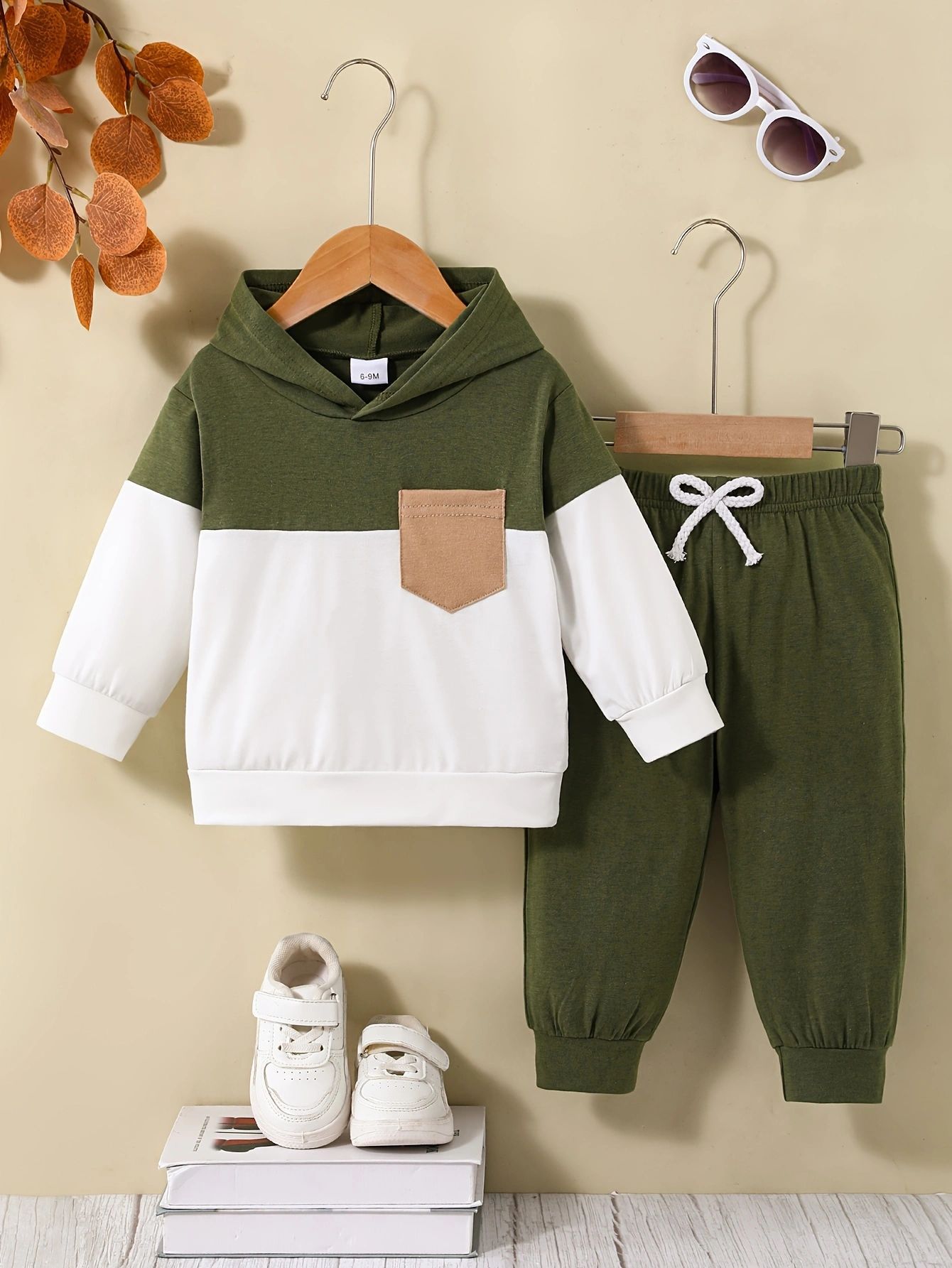 아기 소년 가을, 겨울 새로운 스타일, 긴 소매 탑 3 색 스티치 스타일 후드 스웨트 실제 포켓 + 가짜 Drawstring
