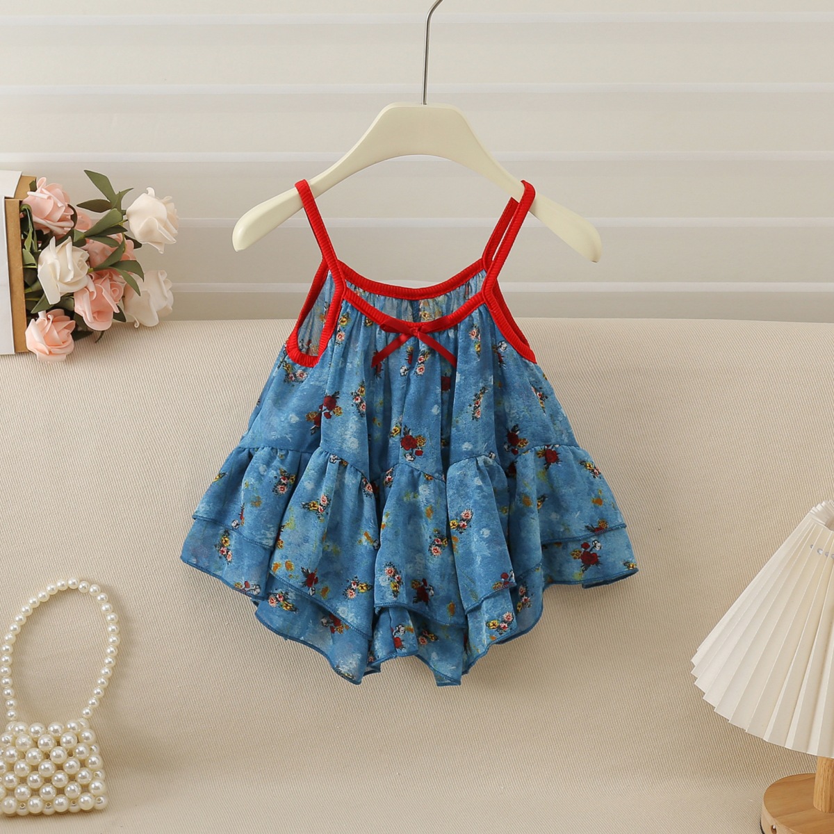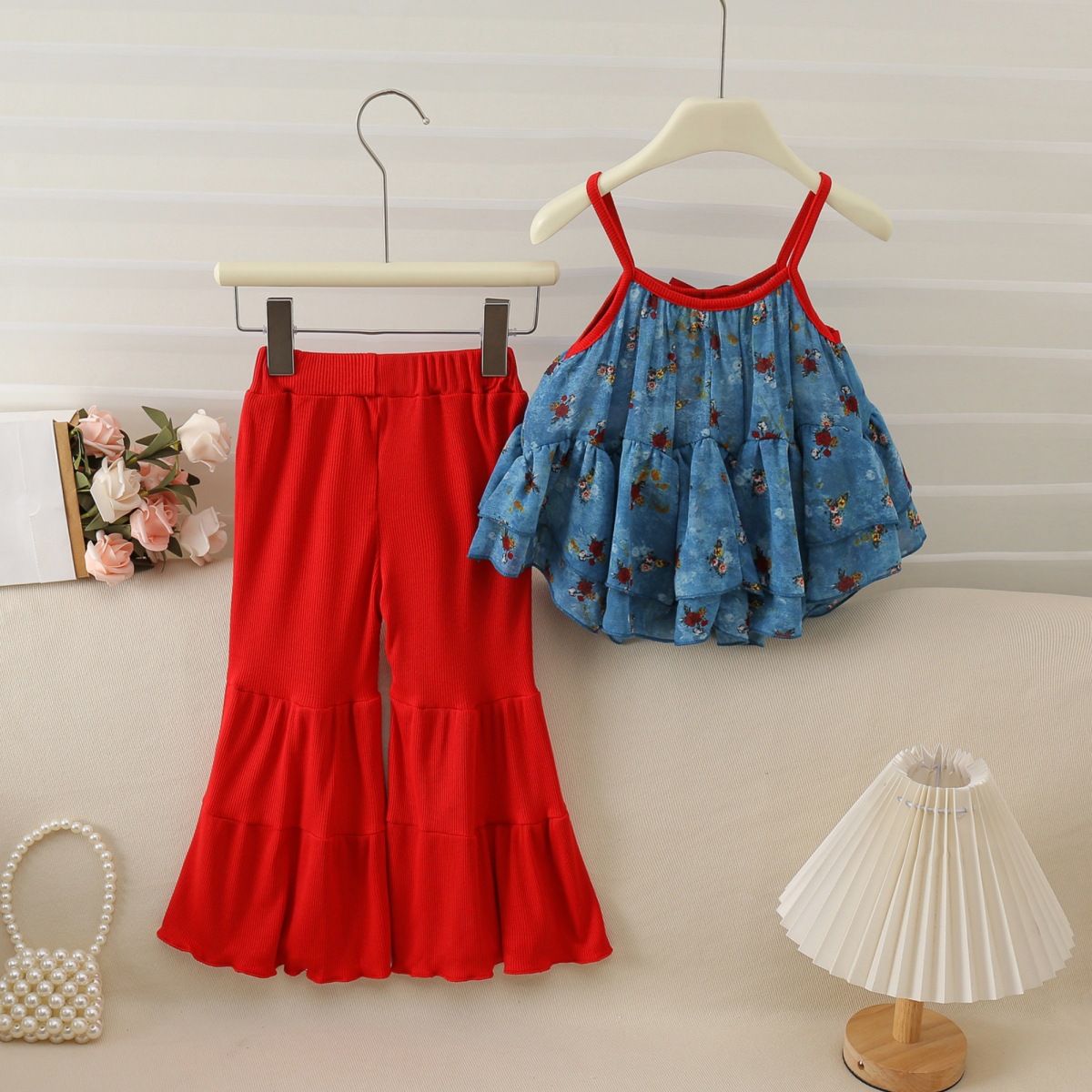 6750 여아 여름 휴가 스타일 서스펜더 새로운 스타일 아동용 베이비 쉬폰 러플 탑 + 부츠컷 팬츠 세트