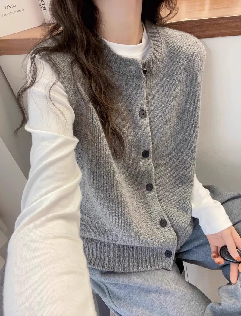 여성을위한 섹시한 회색 라운드 넥 니트 조끼 2025 봄, 가을 패션 스타일 레이어드 카디건 스웨터 조끼 민소매 탑
