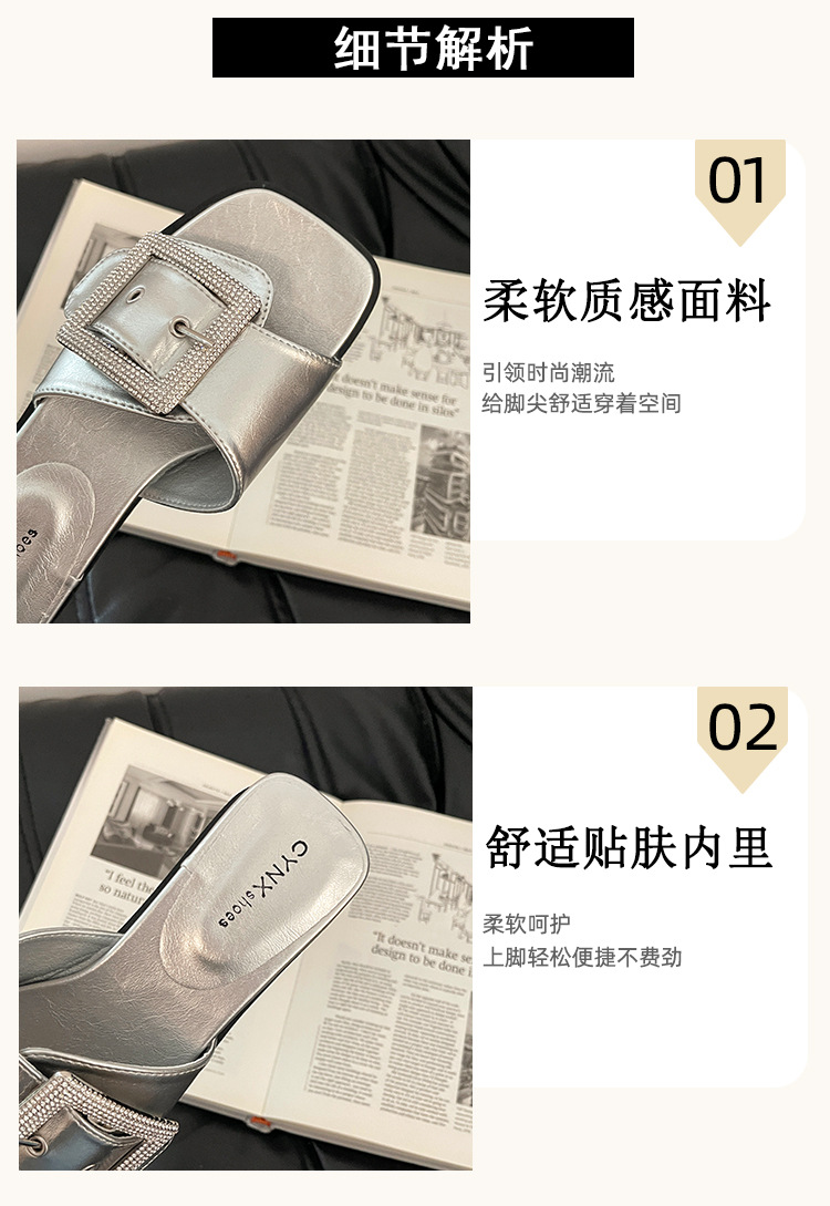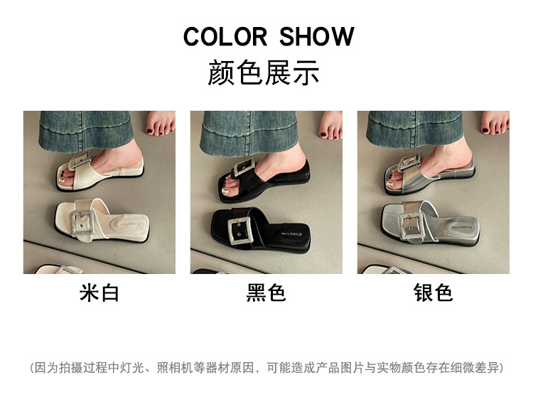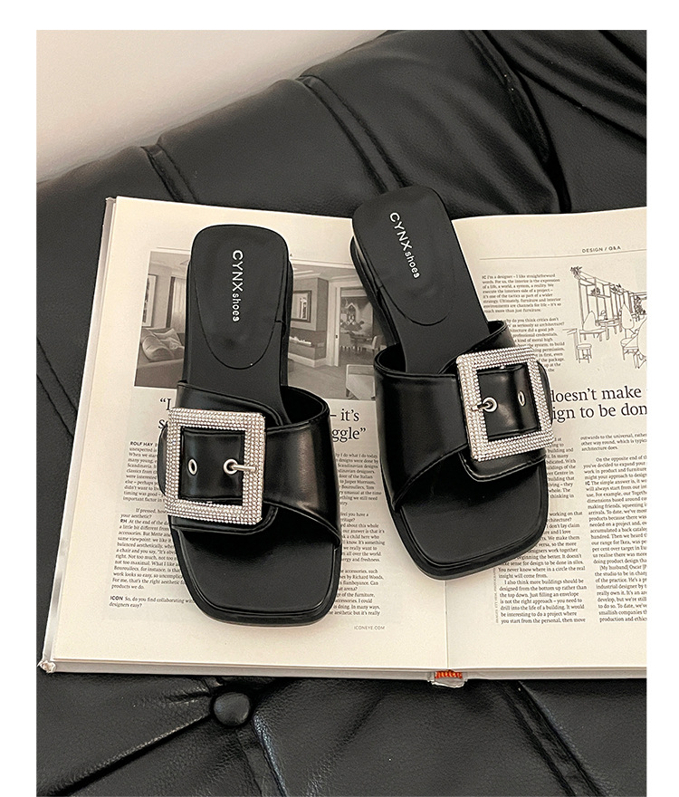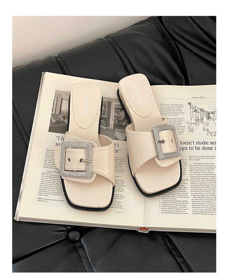 패셔너블하고 다재다능한 샌들, 솔리드 컬러 라인스톤 스퀘어 버클 슬리퍼, 여성 여름 패션 아우터웨어 웨지힐 비치 샌들