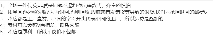 1,全场一件代发,非质量问题不退和换尺码款式,介意的慎拍