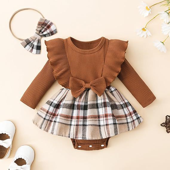 아기 소녀 가을 의류 세트 격자 무늬 점프 슈트 긴팔 겨울 의류 프릴 보우 머리띠 드레스