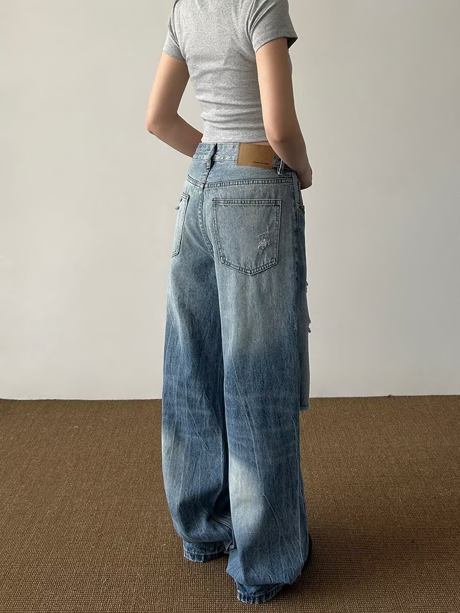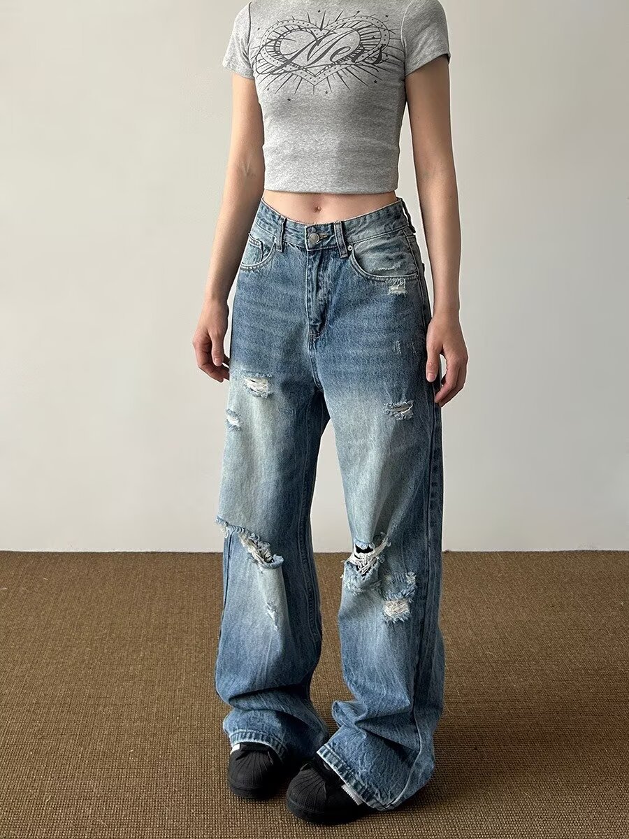 남성용 아메리칸 스트리트 워싱 디스트레스드 찢어진 청바지 봄, 가을 스트레이트 루즈 유럽 및 미국 하이 스트리트 바이브 스타일 롱 팬츠스토어 가기