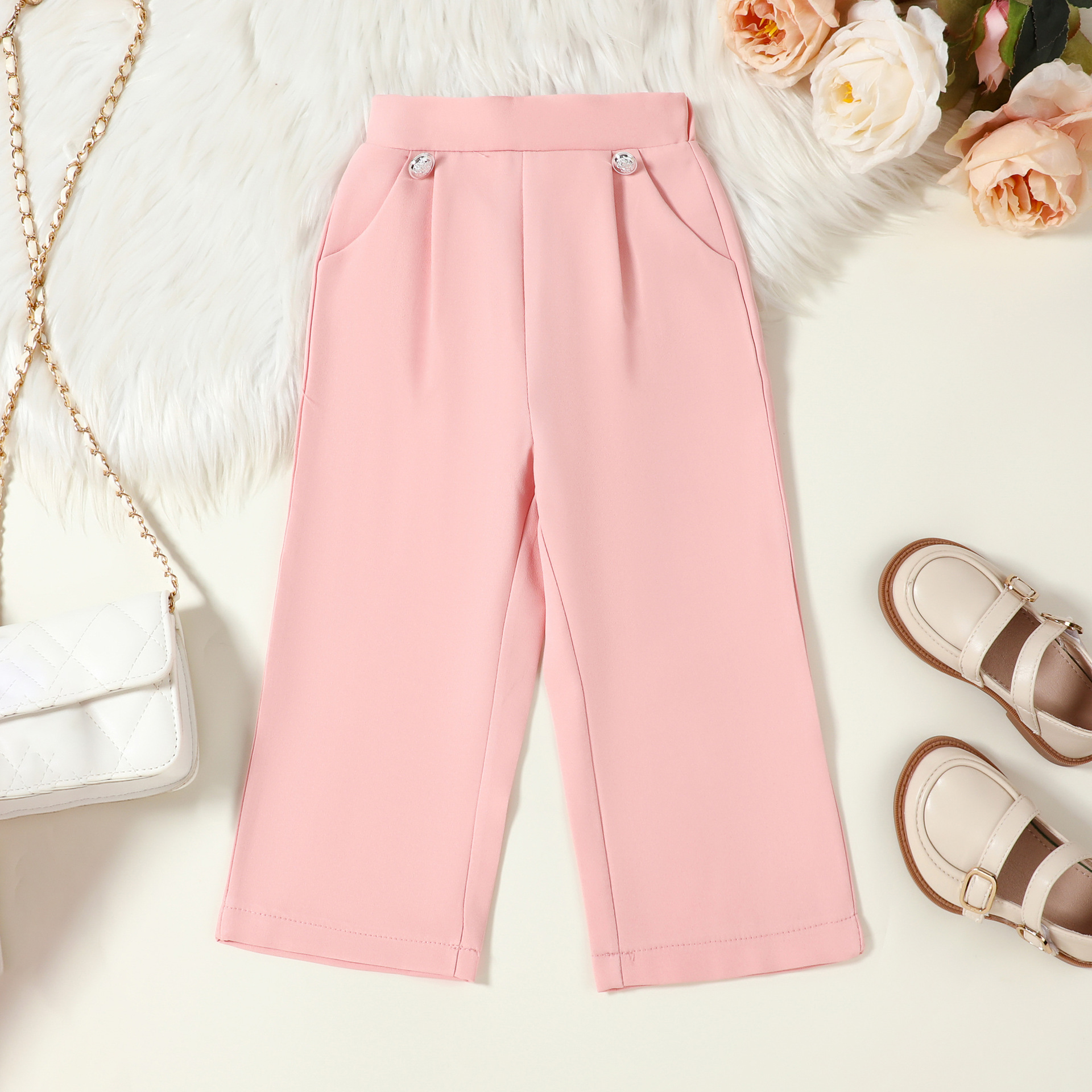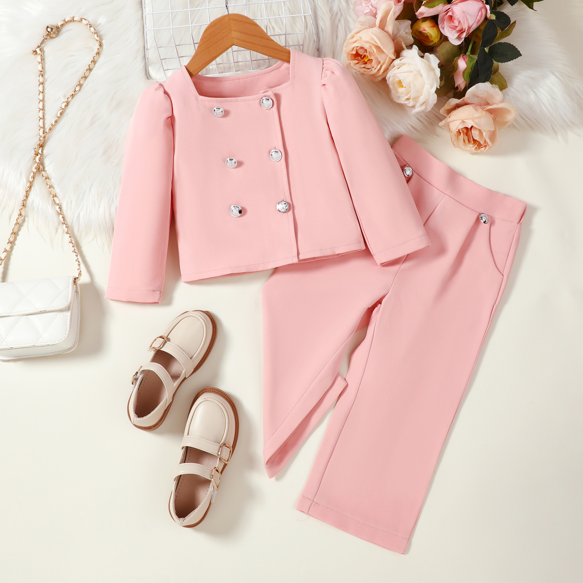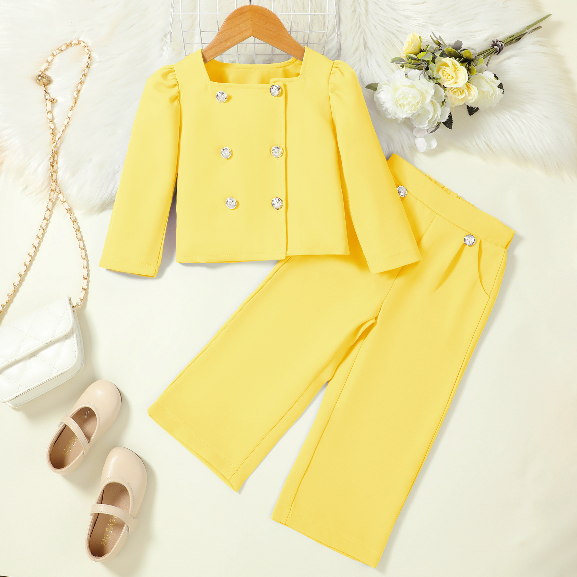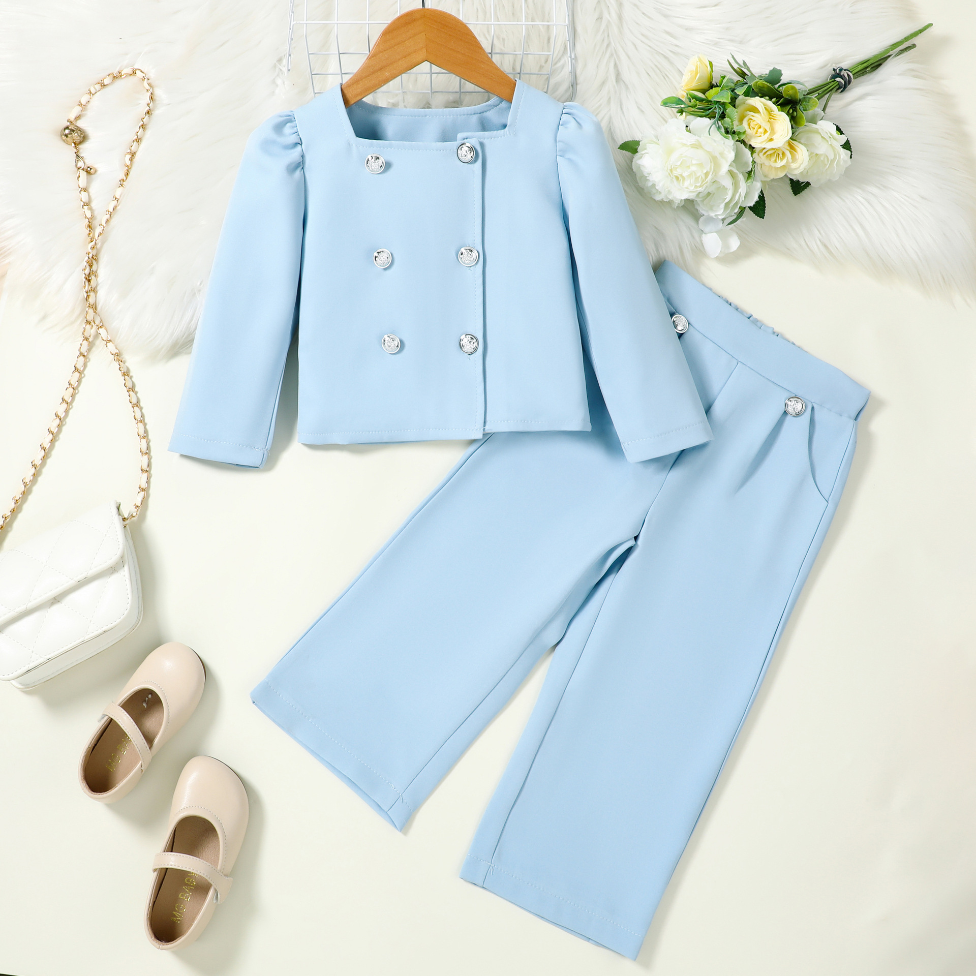 유럽과 미국의 봄, 가을 솔리드 컬러 소녀 스퀘어 넥 버블 긴팔 더블 브레스트 코트 탑 정장 와이드 레그 바지 투피스 세트스토어 가기