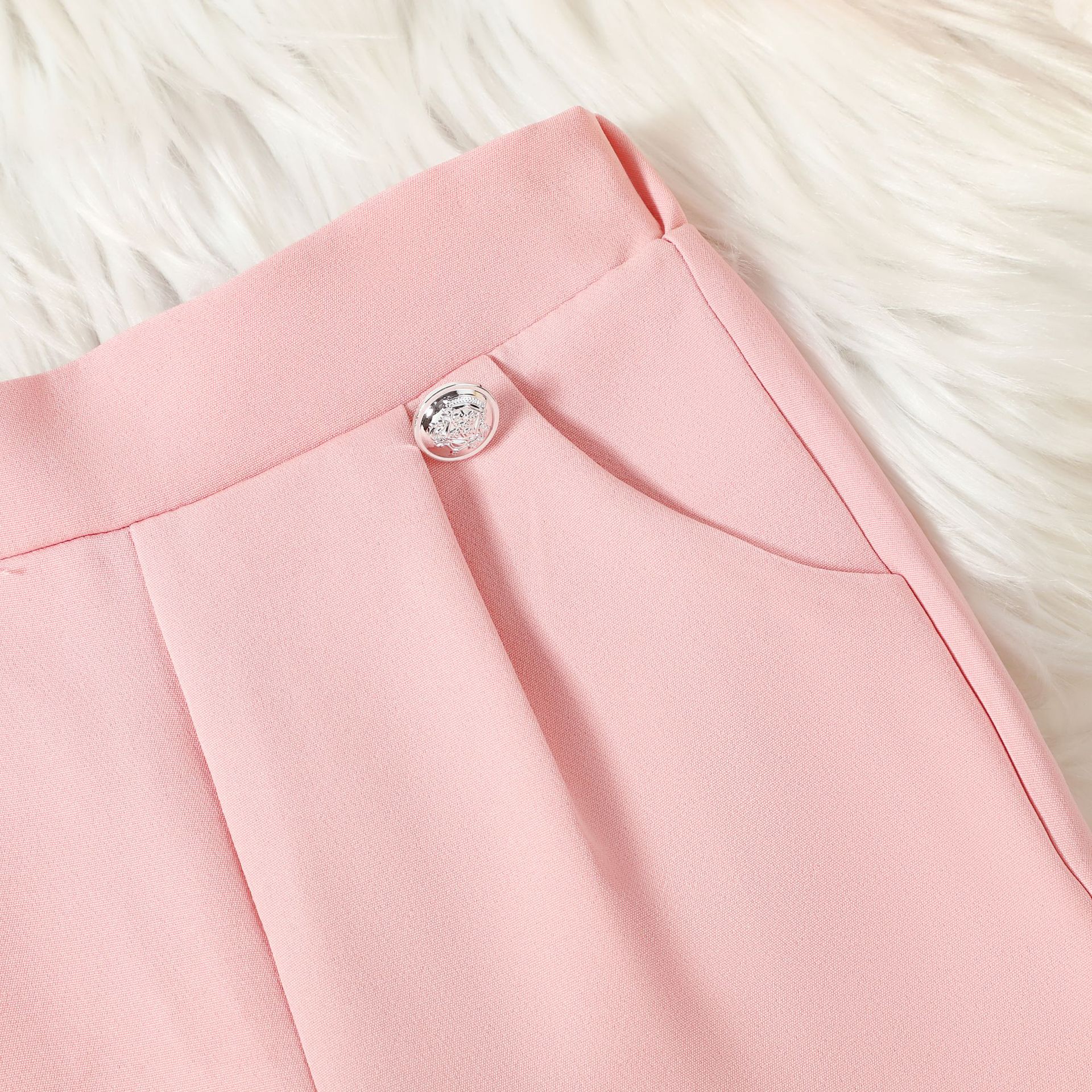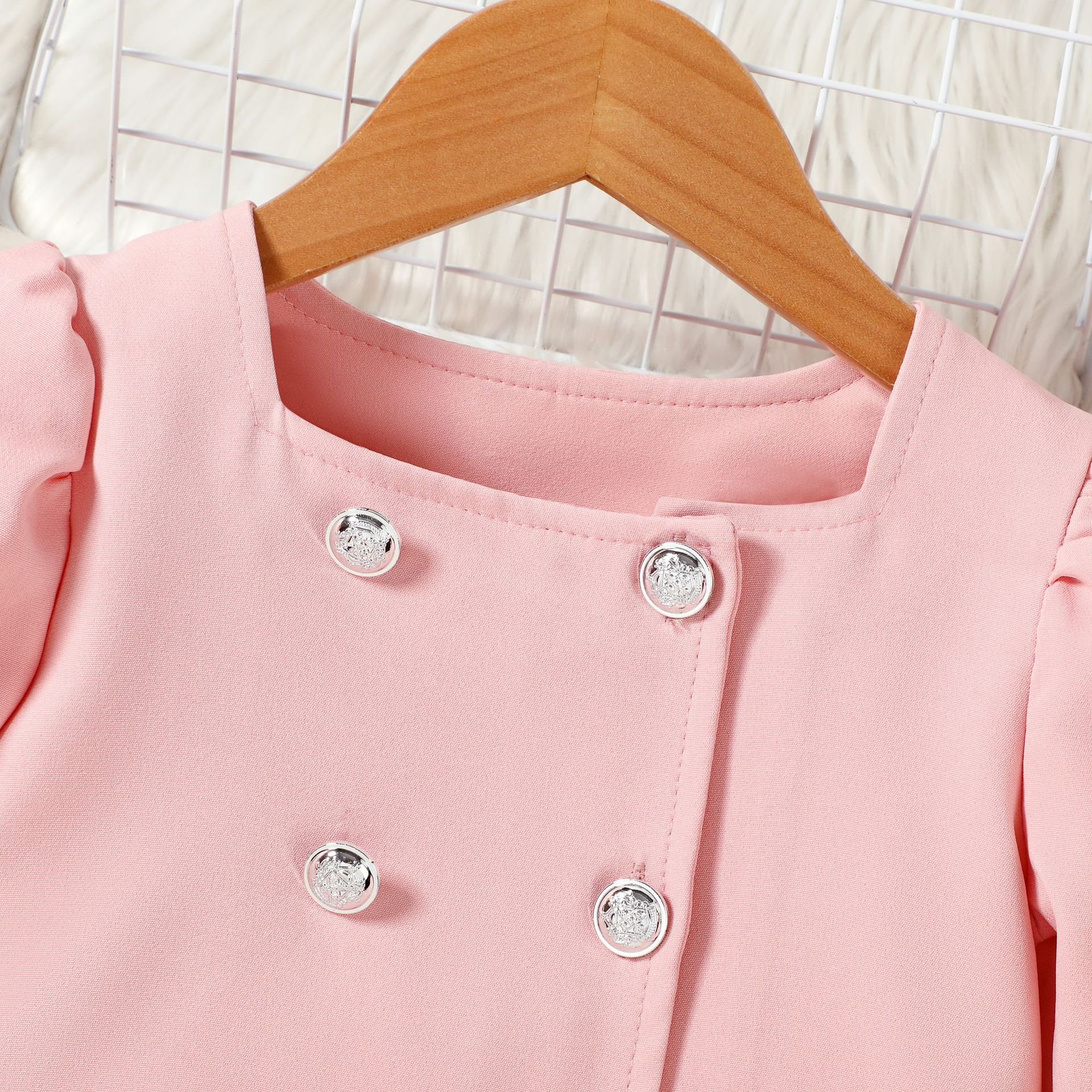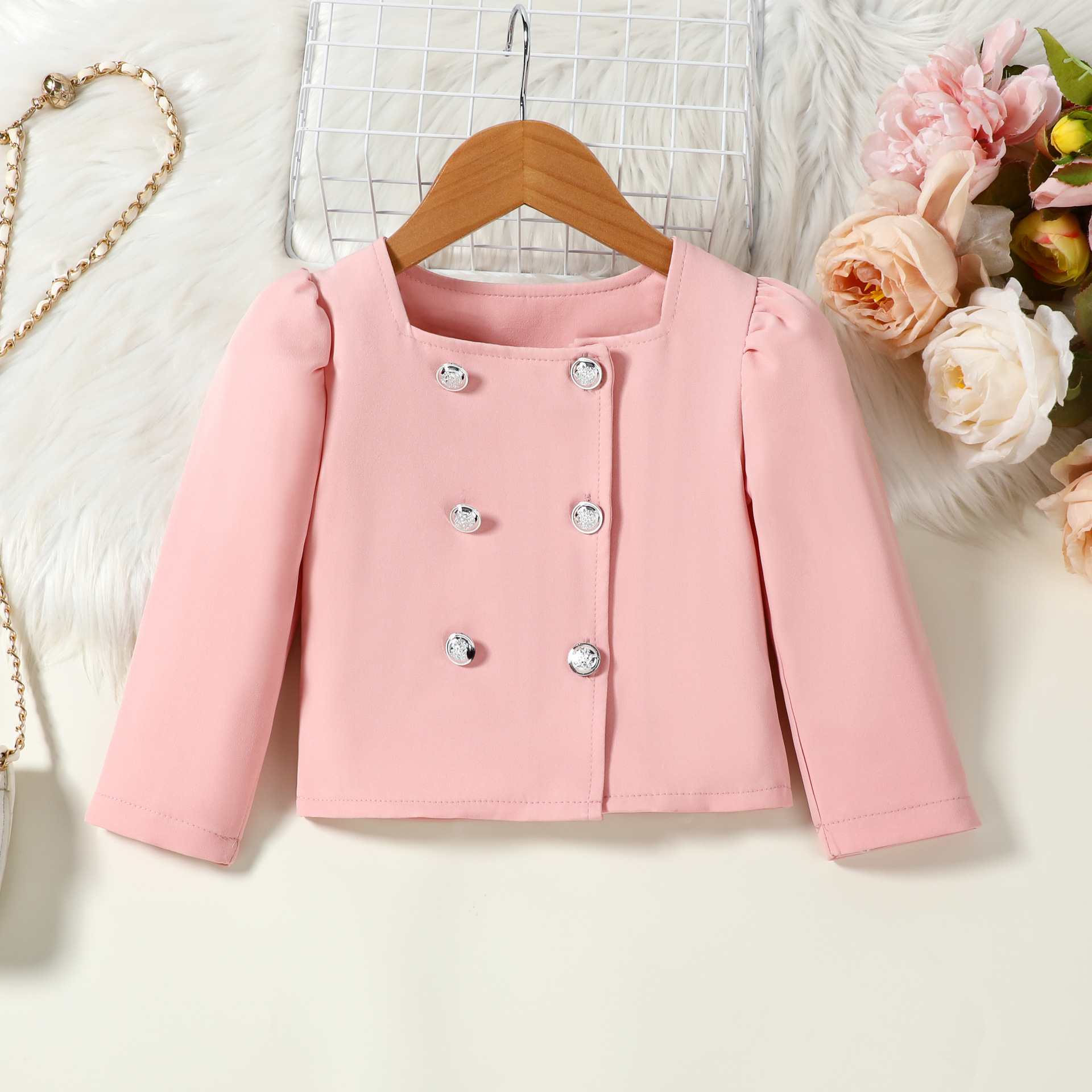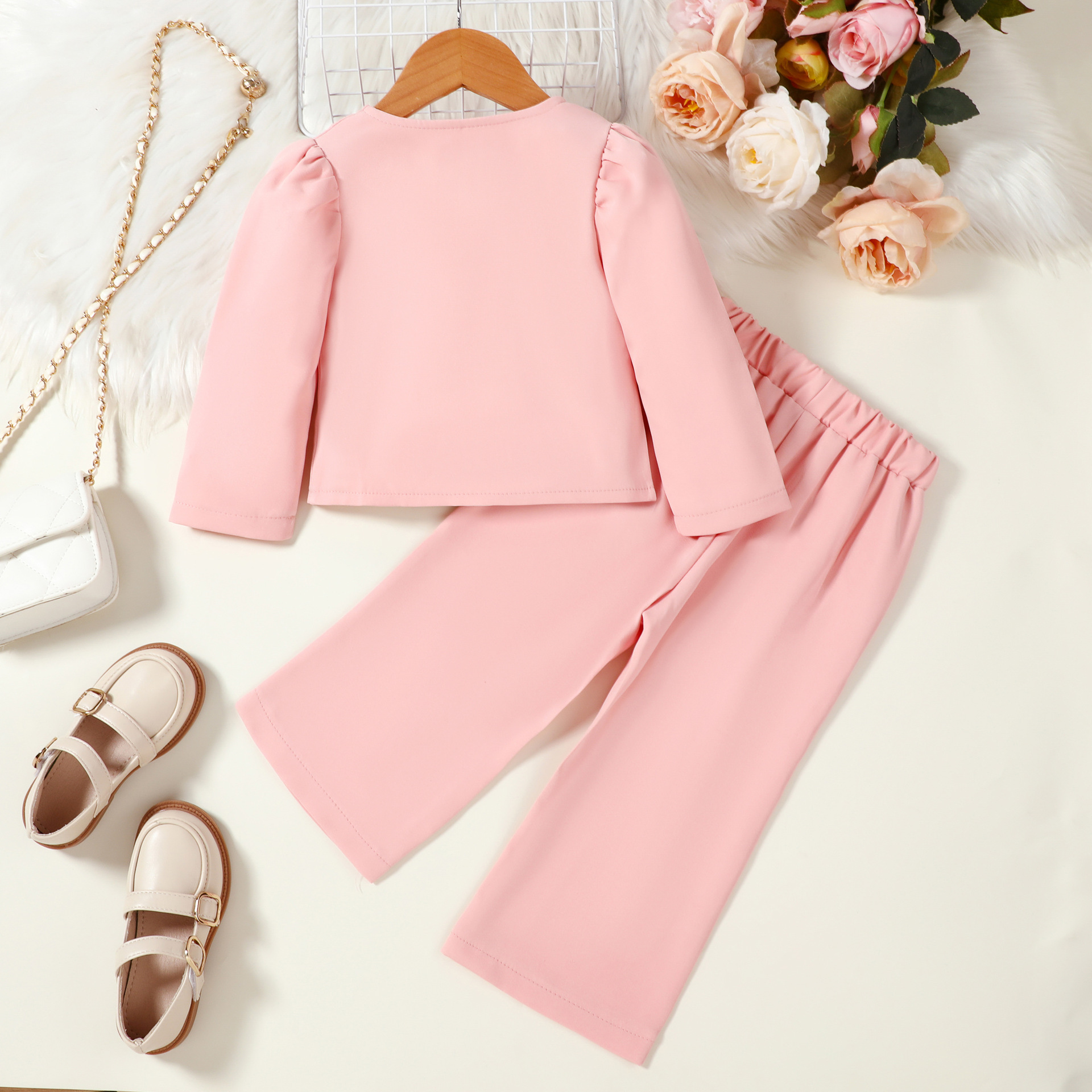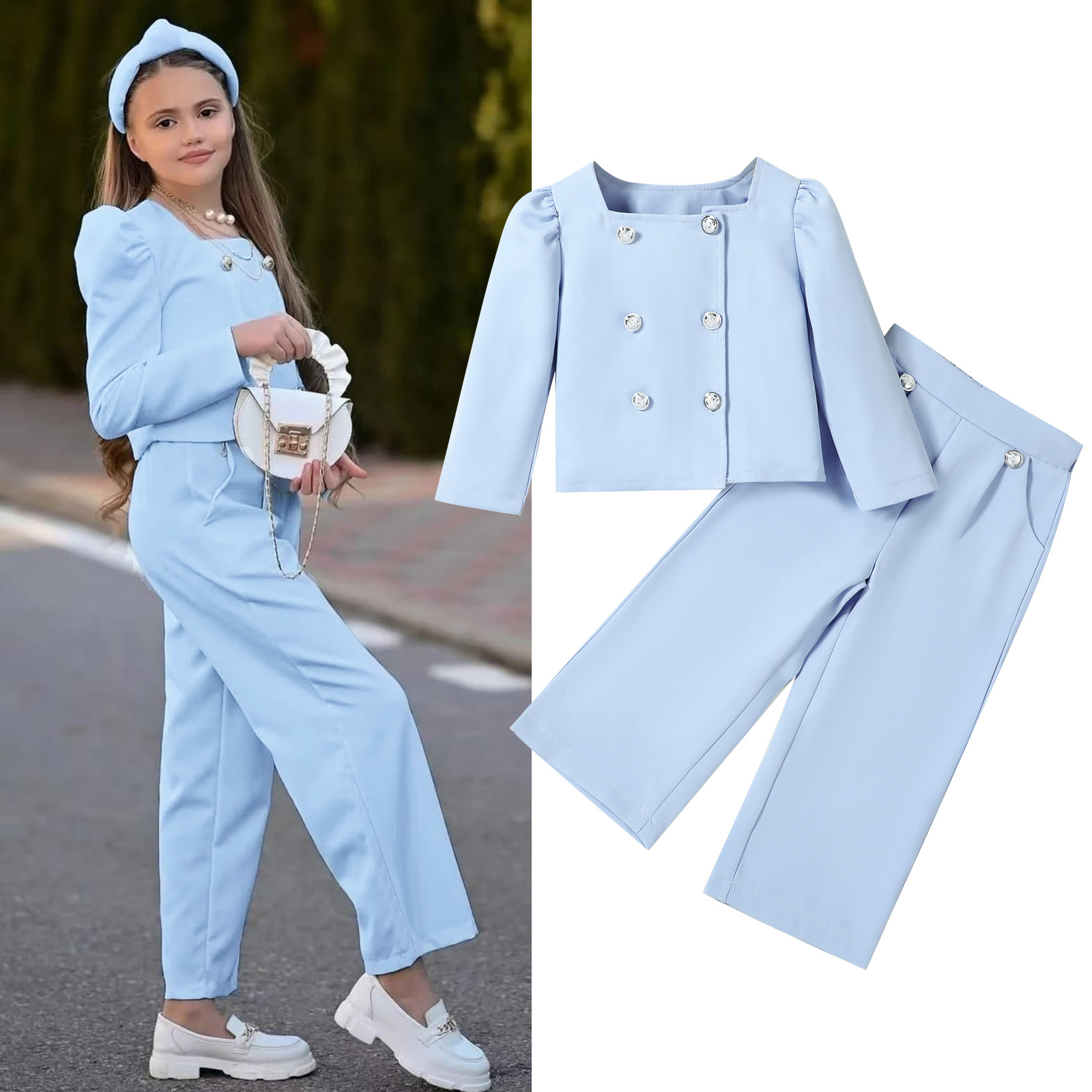 유럽과 미국의 봄, 가을 솔리드 컬러 소녀 스퀘어 넥 버블 긴팔 더블 브레스트 코트 탑 정장 와이드 레그 바지 투피스 세트