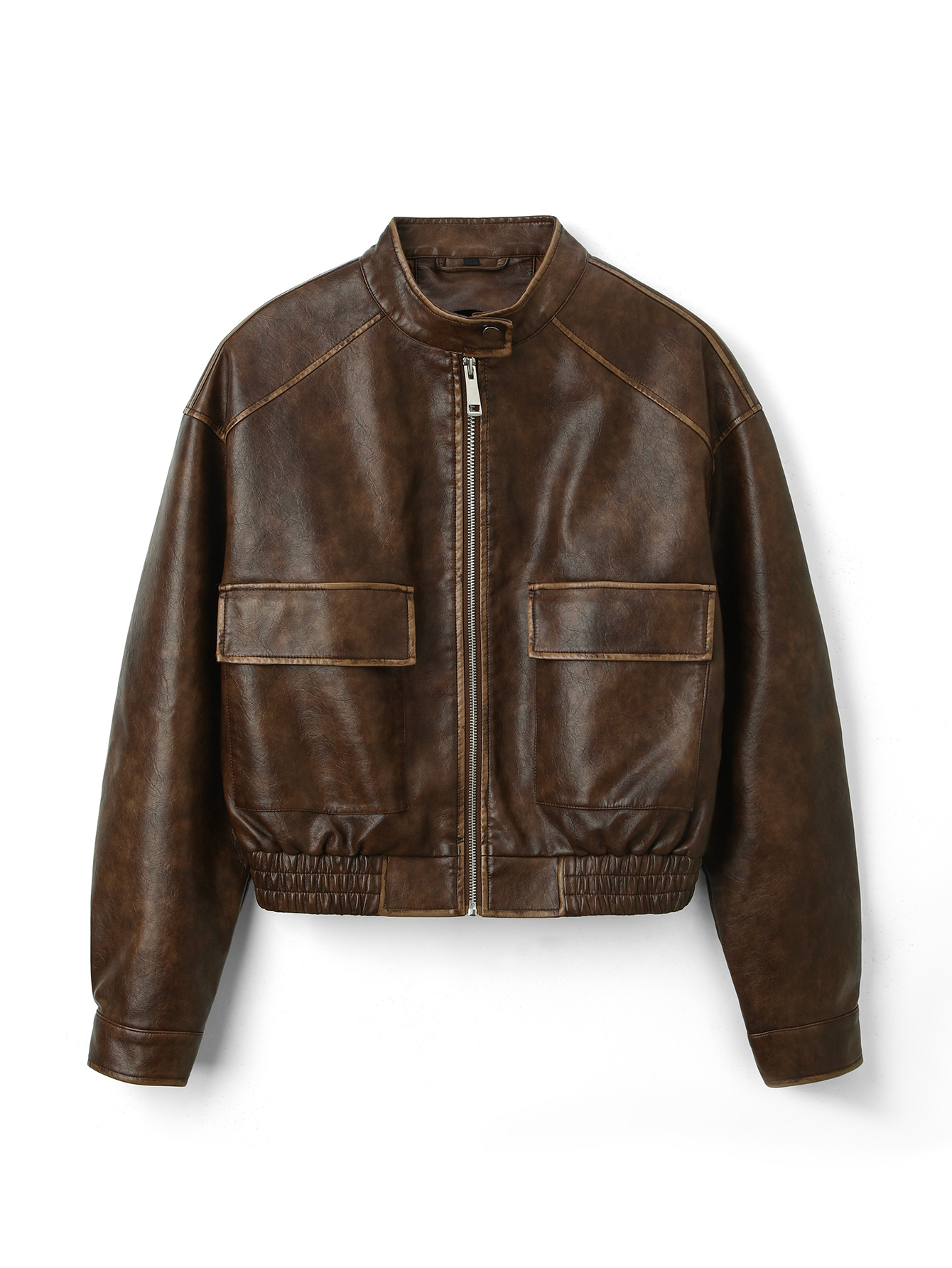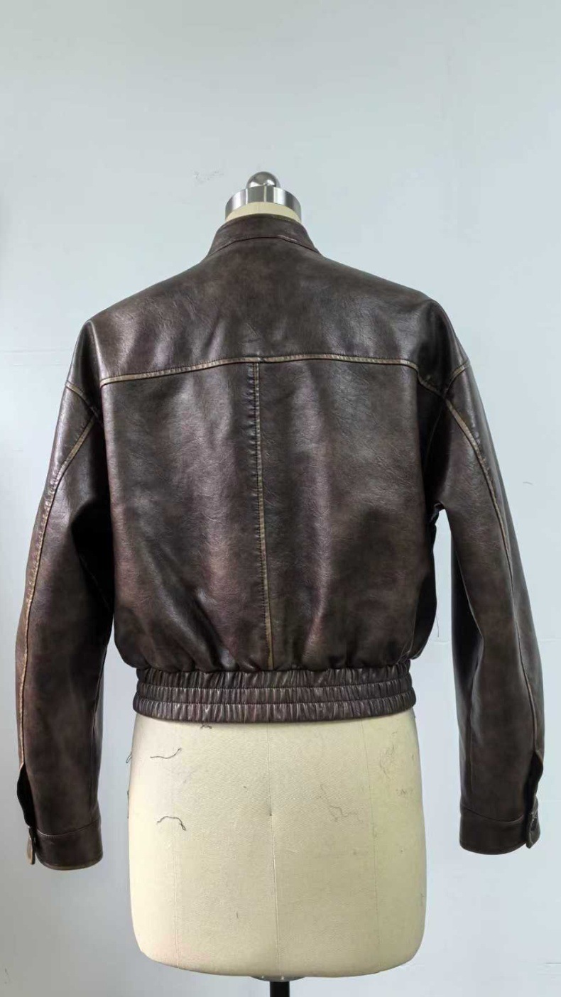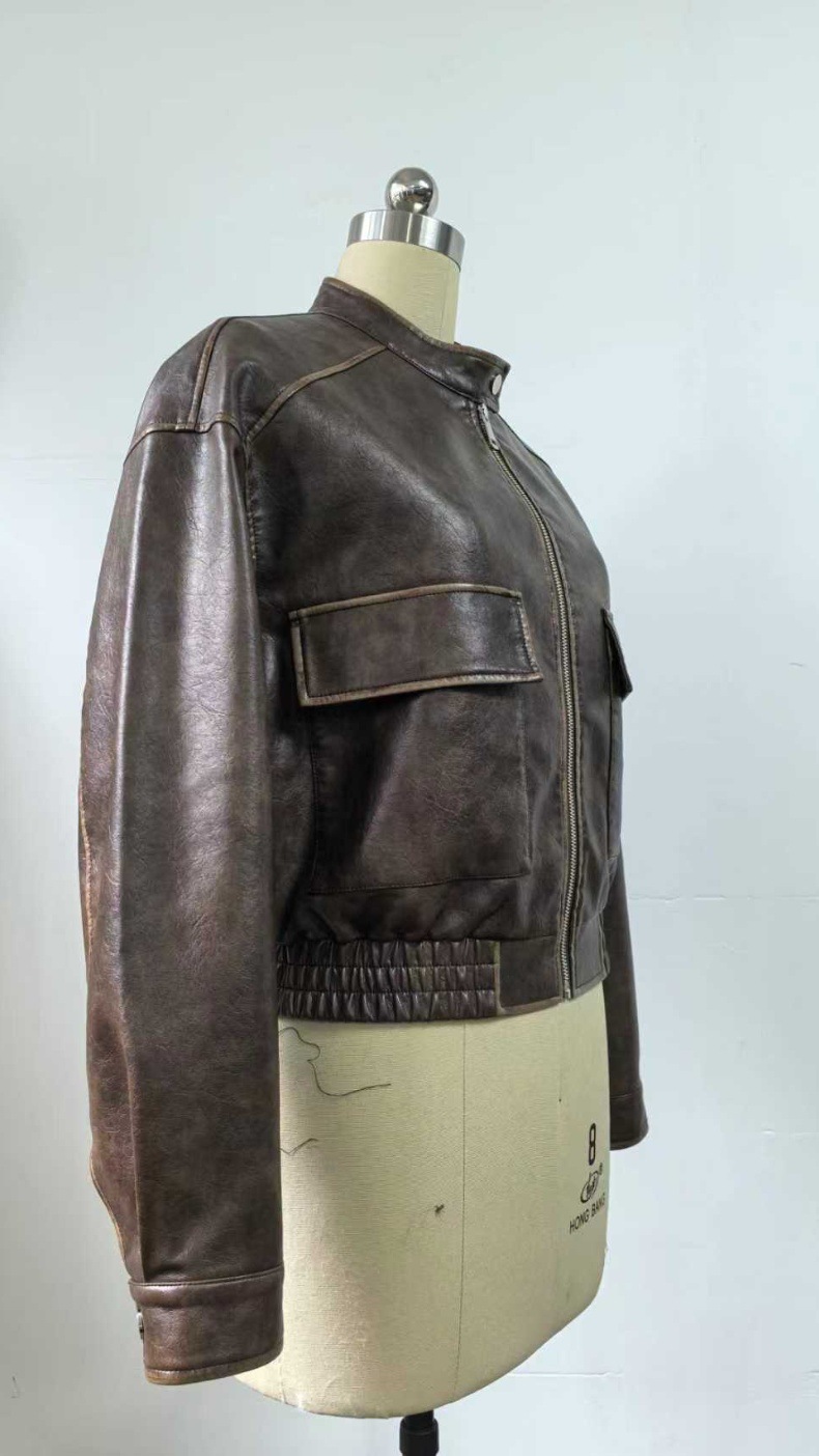 크로스보더 브라운 PU 가죽 재킷, 여성용 레트로 빈티지 스타일, 루즈핏 워크웨어, 스탠드 칼라 지퍼 재킷, 유럽 및 미국 스타일스토어 가기