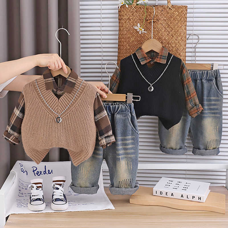 2025 새로운 어린이 스웨터 조끼 복고풍 꽃 셔츠 소년 베이비 블루머 3 피스 세트 공장 도매스토어 가기