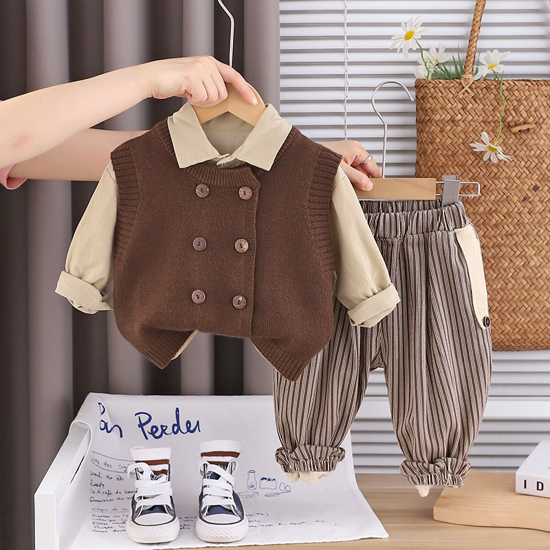 소년 봄, 가을 조끼 정장 2025 새로운 아기 한국어 스타일 어린이 니트 캐주얼 셔츠 3 피스 세트