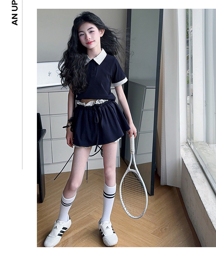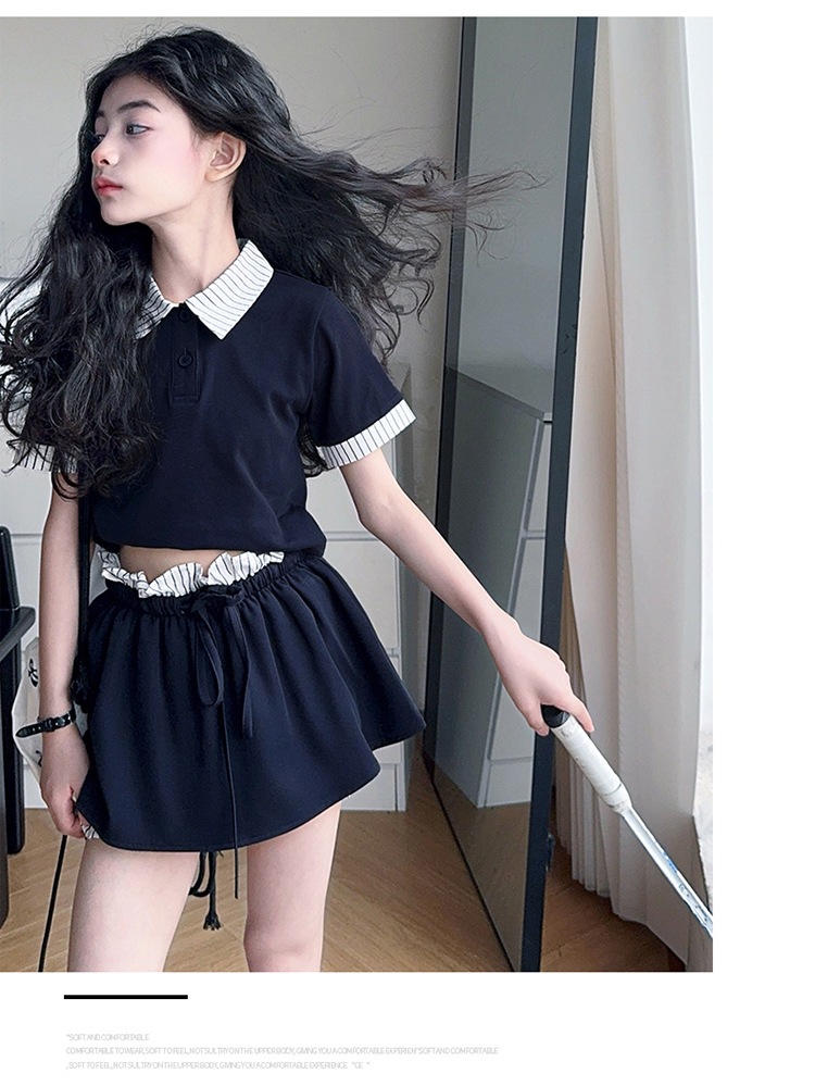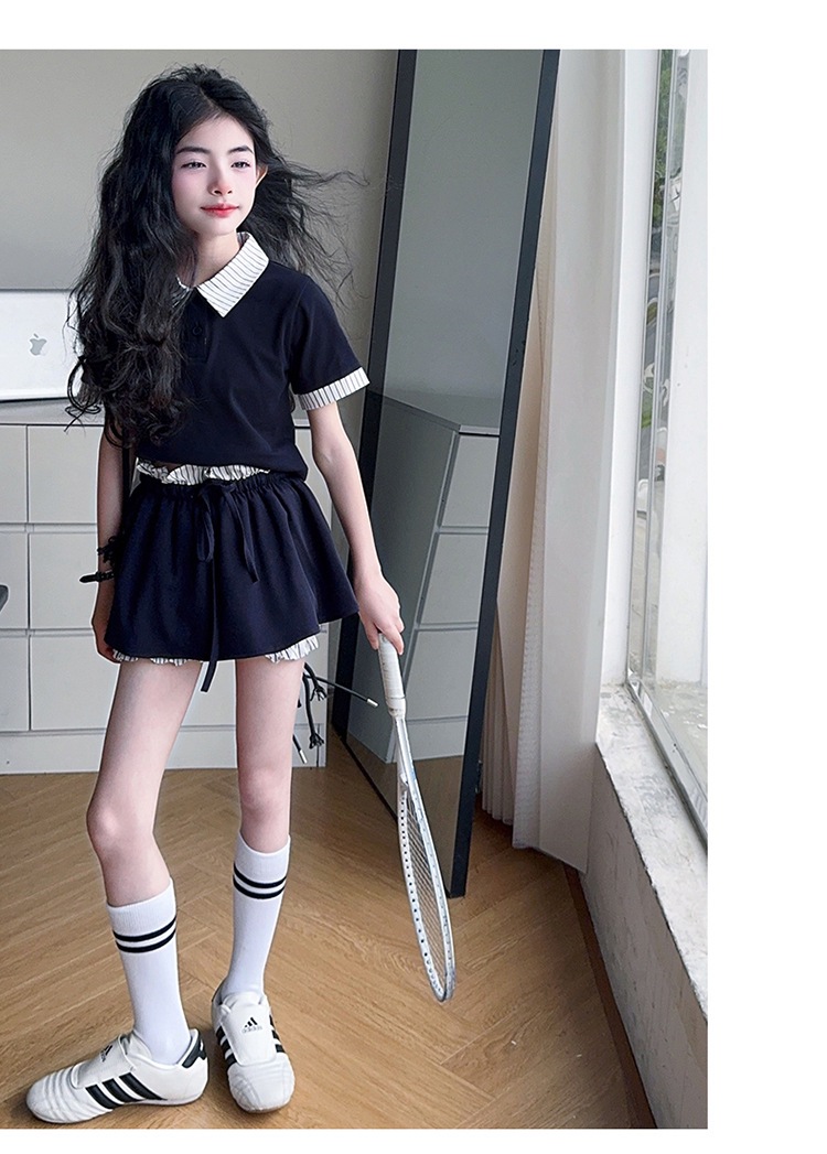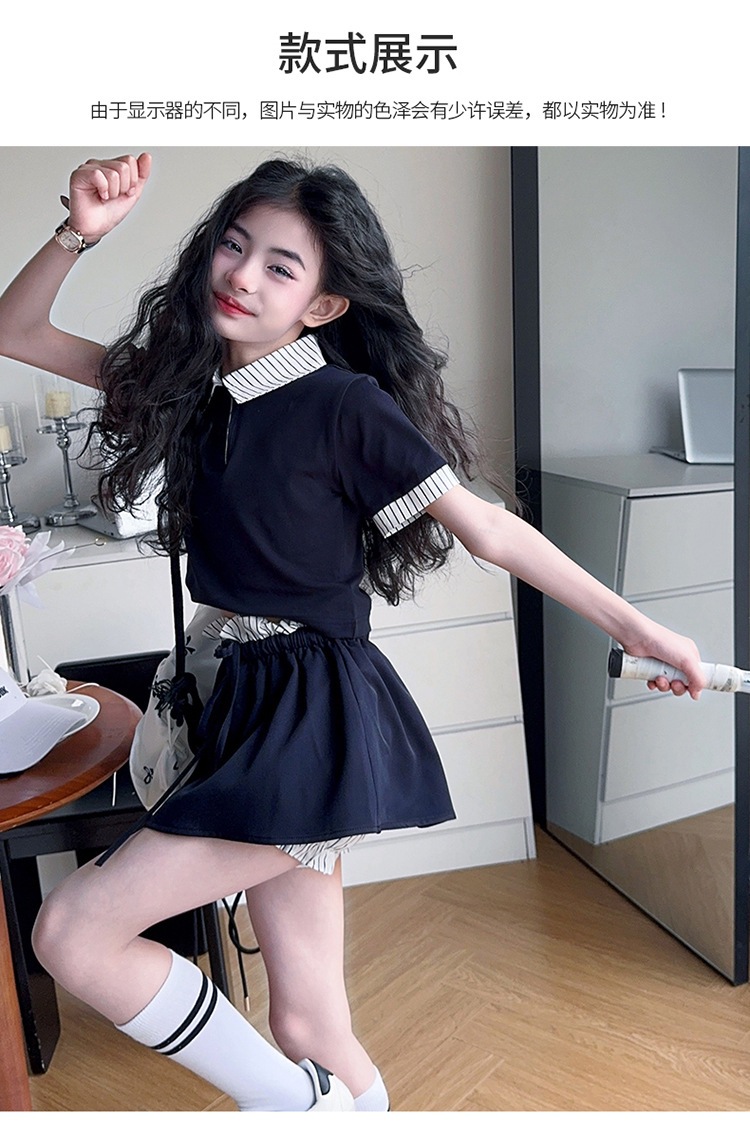 여자 폴로 셔츠와 치마바지 정장 여름 옷 2025 새로운 여름 스타일 아동복 아동용 가짜 투피스 반팔 치마바지