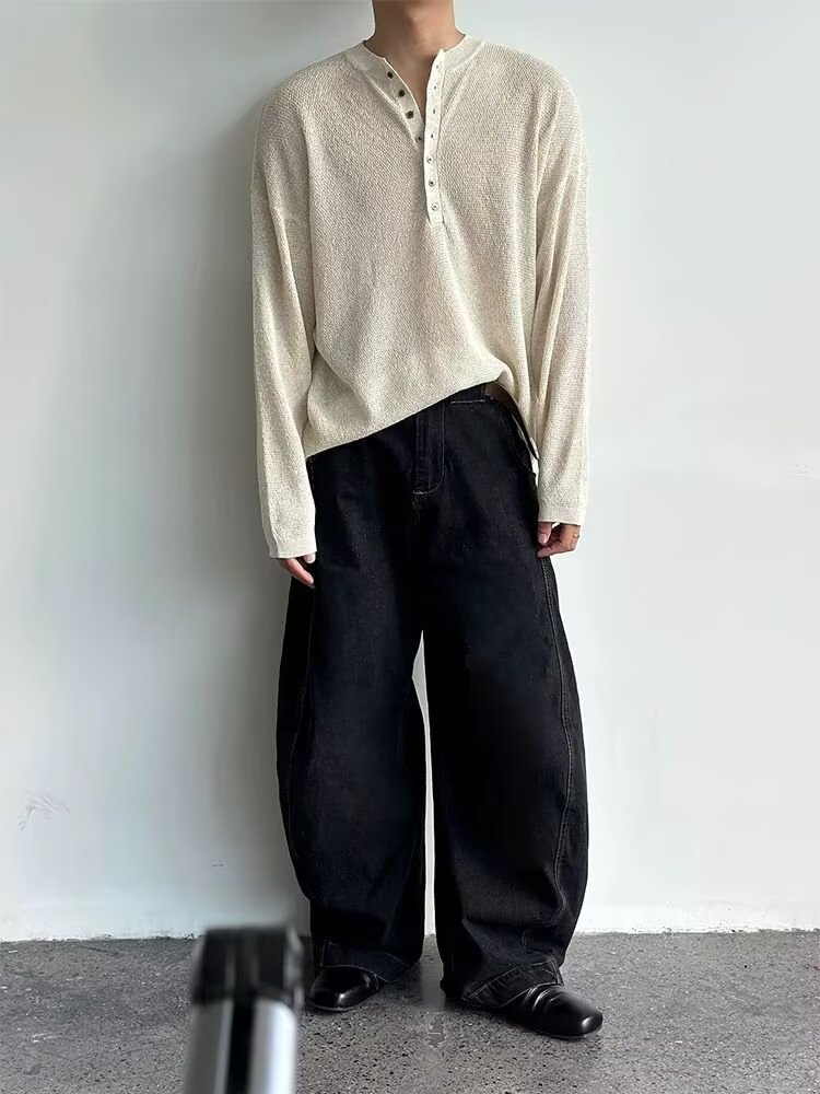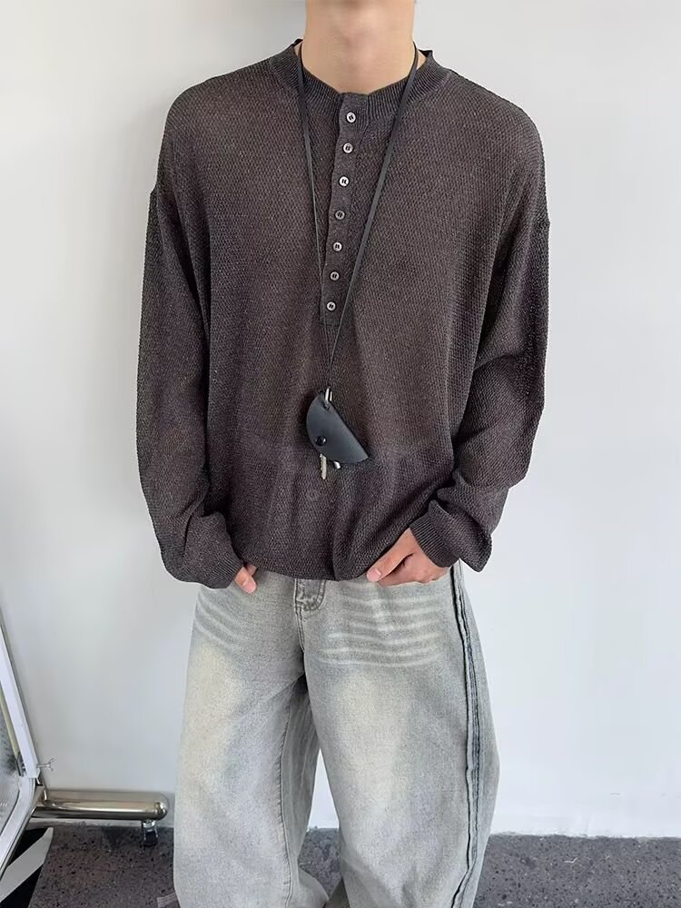 가을 겨울 새로운 스타일 중공 스웨터 남성 긴팔 얇은 블라우스 헨리 칼라 티셔츠 유행 대외 무역 국경 간 도매