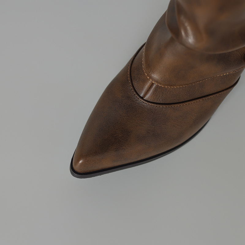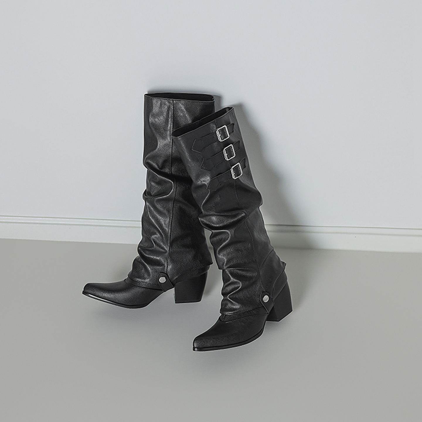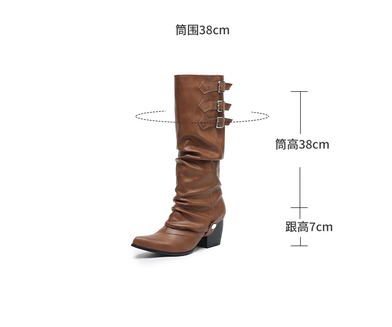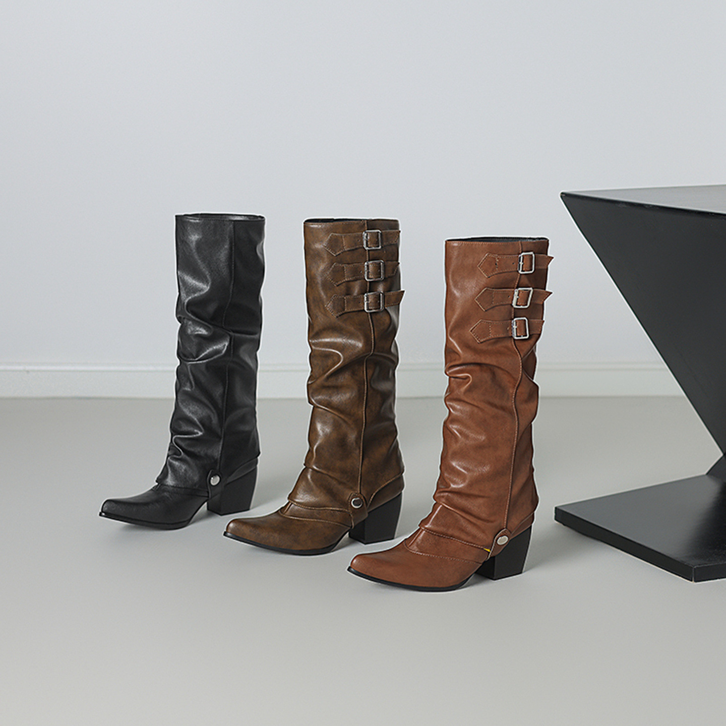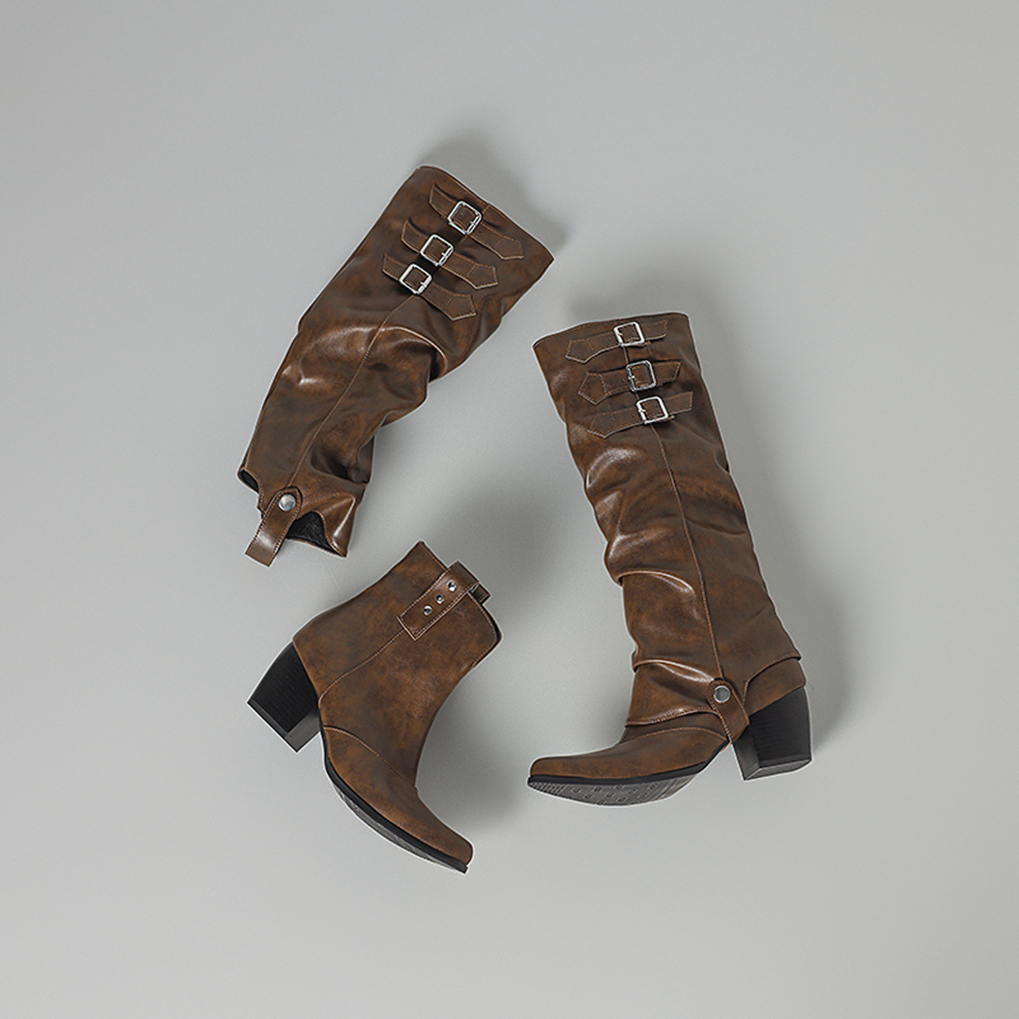 가을 겨울 여성을 위한 탈착식 두꺼운 굽 웨스턴 카우보이 부츠, 새로운 스타일의 주름 장식 하이 부츠, 벨트 버클 대외 무역 신발스토어 가기