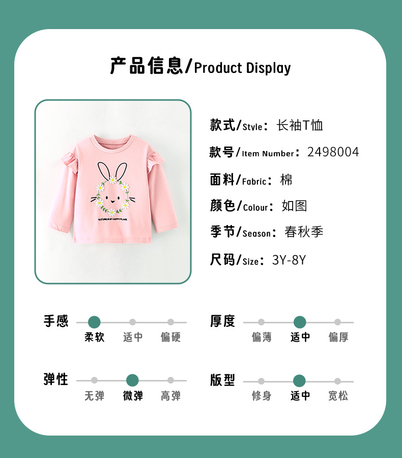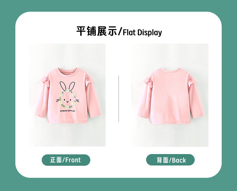 2025 봄, 가을 소녀의 새로운 만화 토끼 순수 코튼 긴팔 티셔츠 어린이 꽃 레이스 라운드 넥 탑