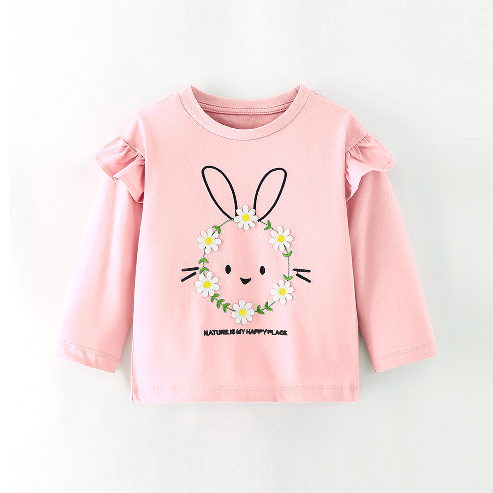 2025 봄, 가을 소녀의 새로운 만화 토끼 순수 코튼 긴팔 티셔츠 어린이 꽃 레이스 라운드 넥 탑스토어 가기