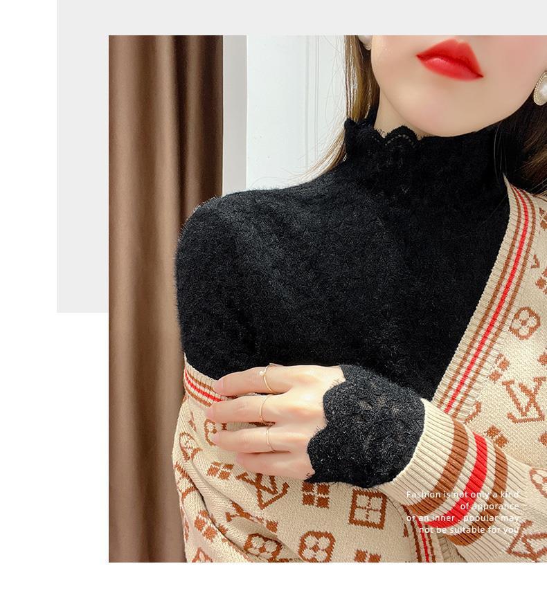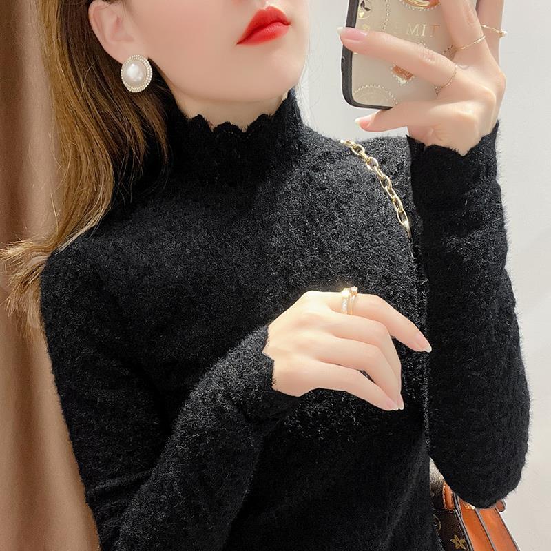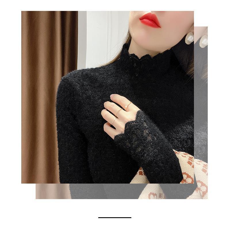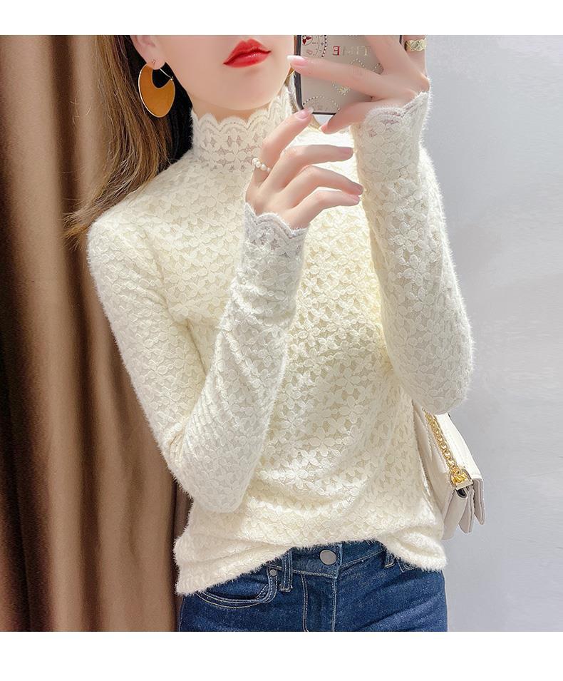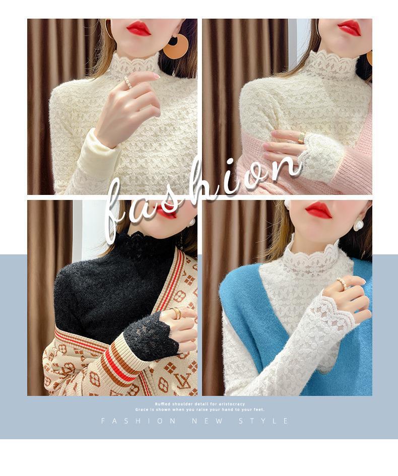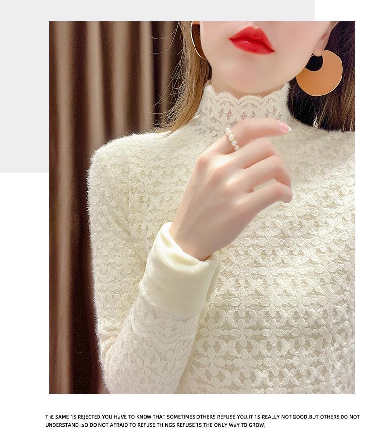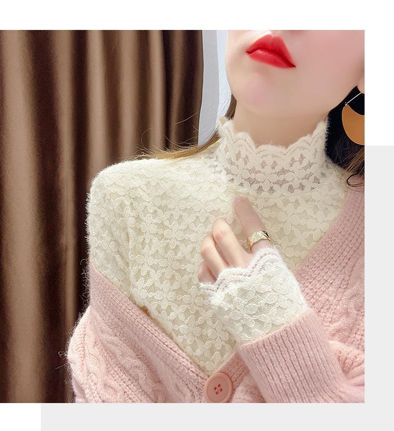 가을 겨울 여성용 벨벳 두꺼운 레이스 바닥 셔츠, 새로운 스타일의 하이 칼라 셔츠, 기모 따뜻한 메쉬 탑