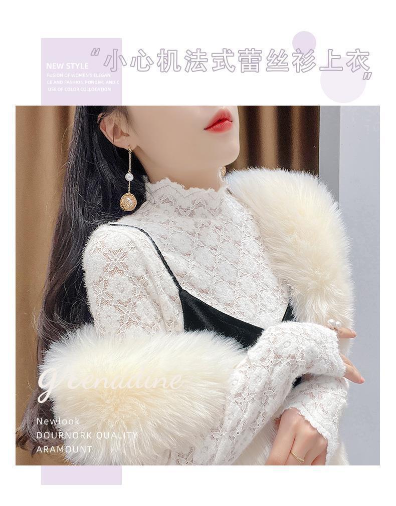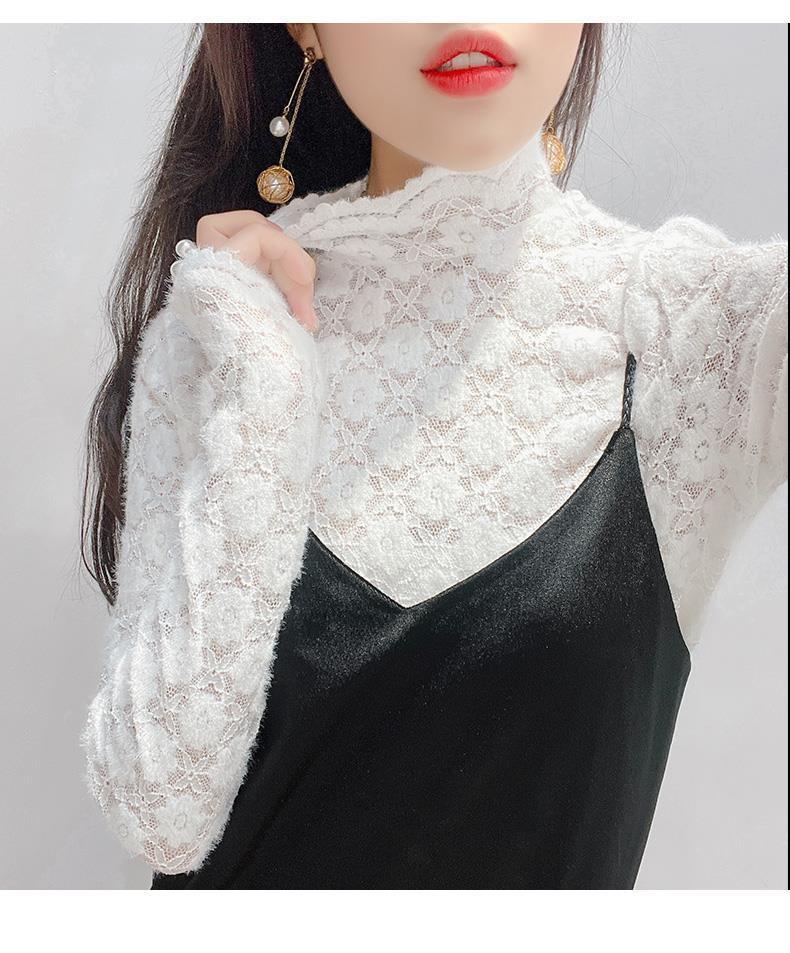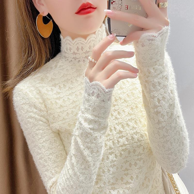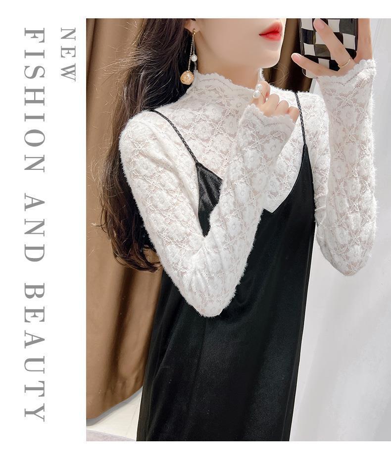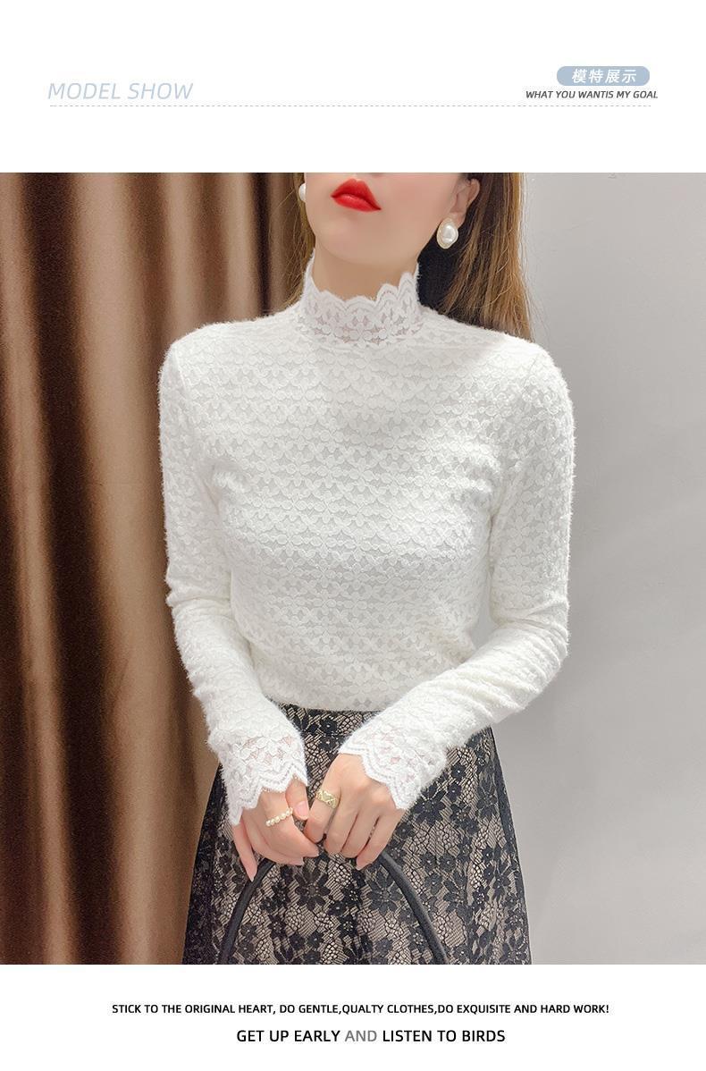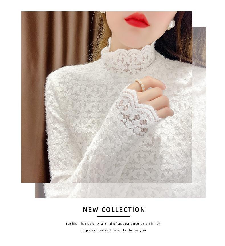 가을 겨울 여성용 벨벳 두꺼운 레이스 바닥 셔츠, 새로운 스타일의 하이 칼라 셔츠, 기모 따뜻한 메쉬 탑스토어 가기
