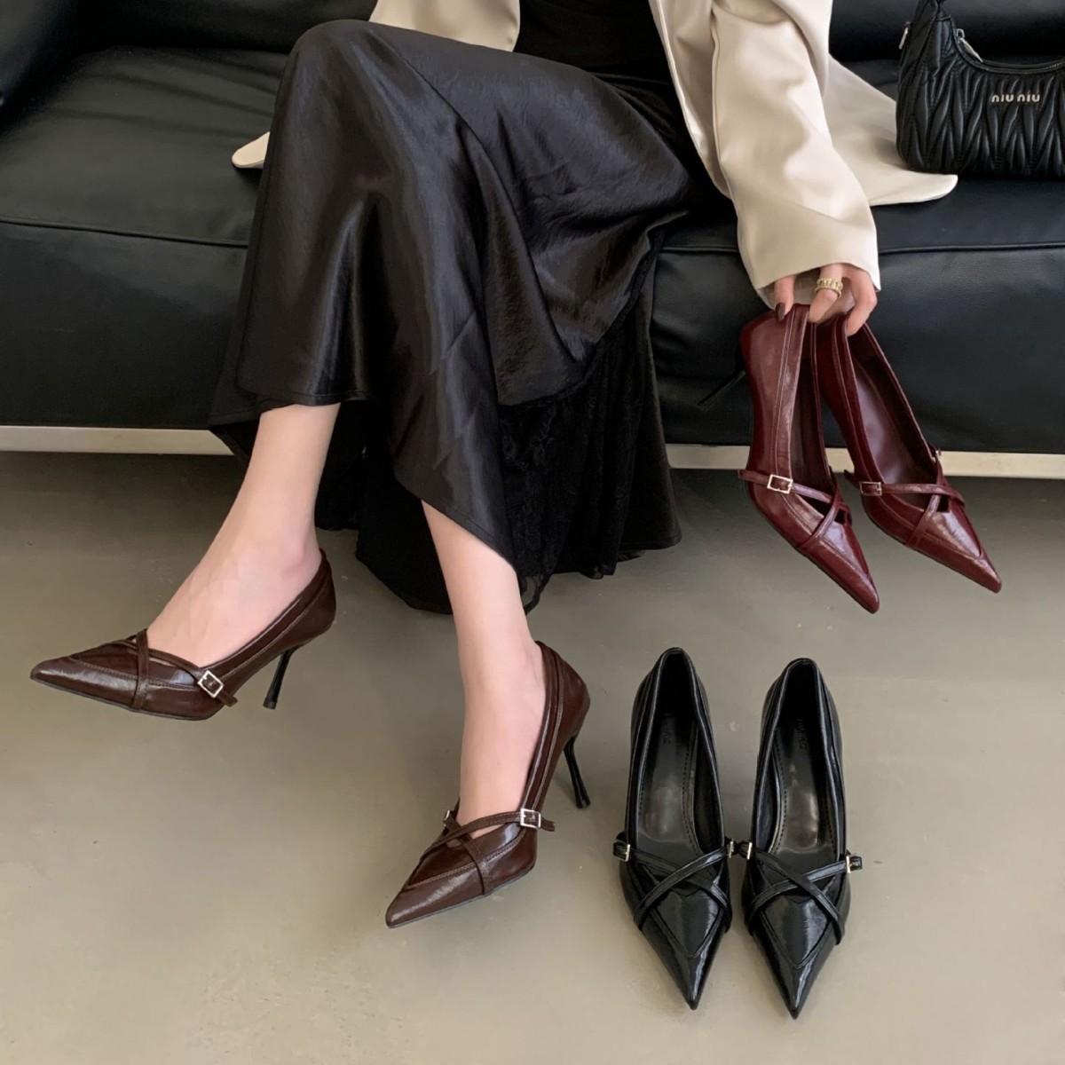 2025 봄 여름 신상 데님 펌프스 스트랩 중공 발가락 스틸레토 힐 패션 샌들 뮬스토어 가기