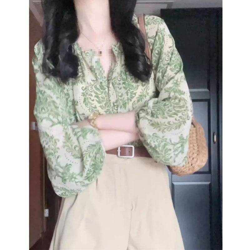 프렌치 그린 꽃 무늬 v 넥 랜턴 슬리브 자외선 차단제 긴팔 녹색 꽃 쉬폰 셔츠 여성 여름 느슨한 얇은 탑스토어 가기