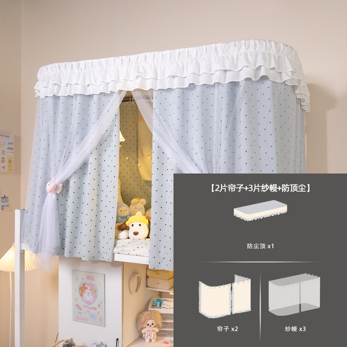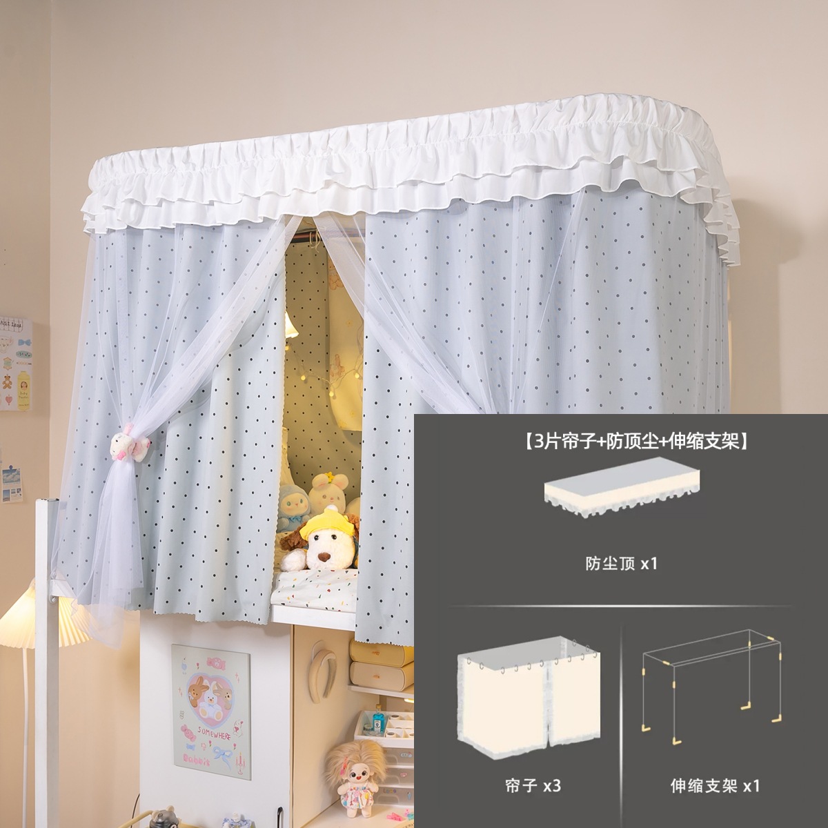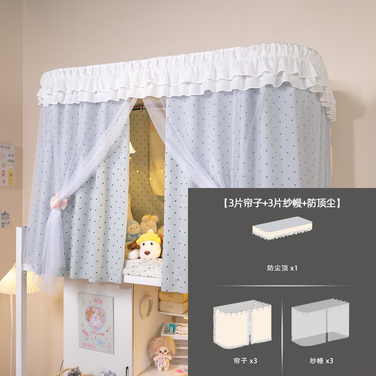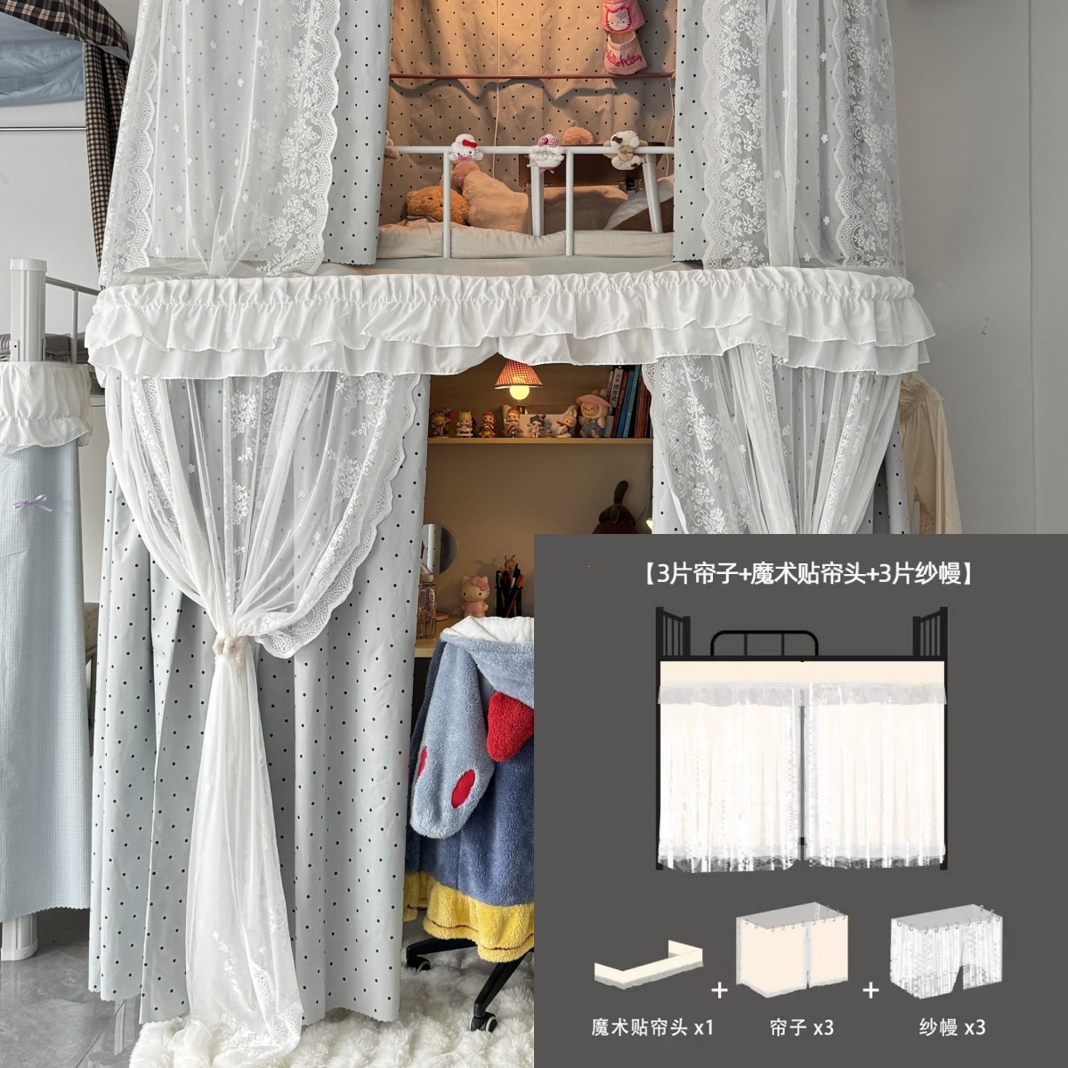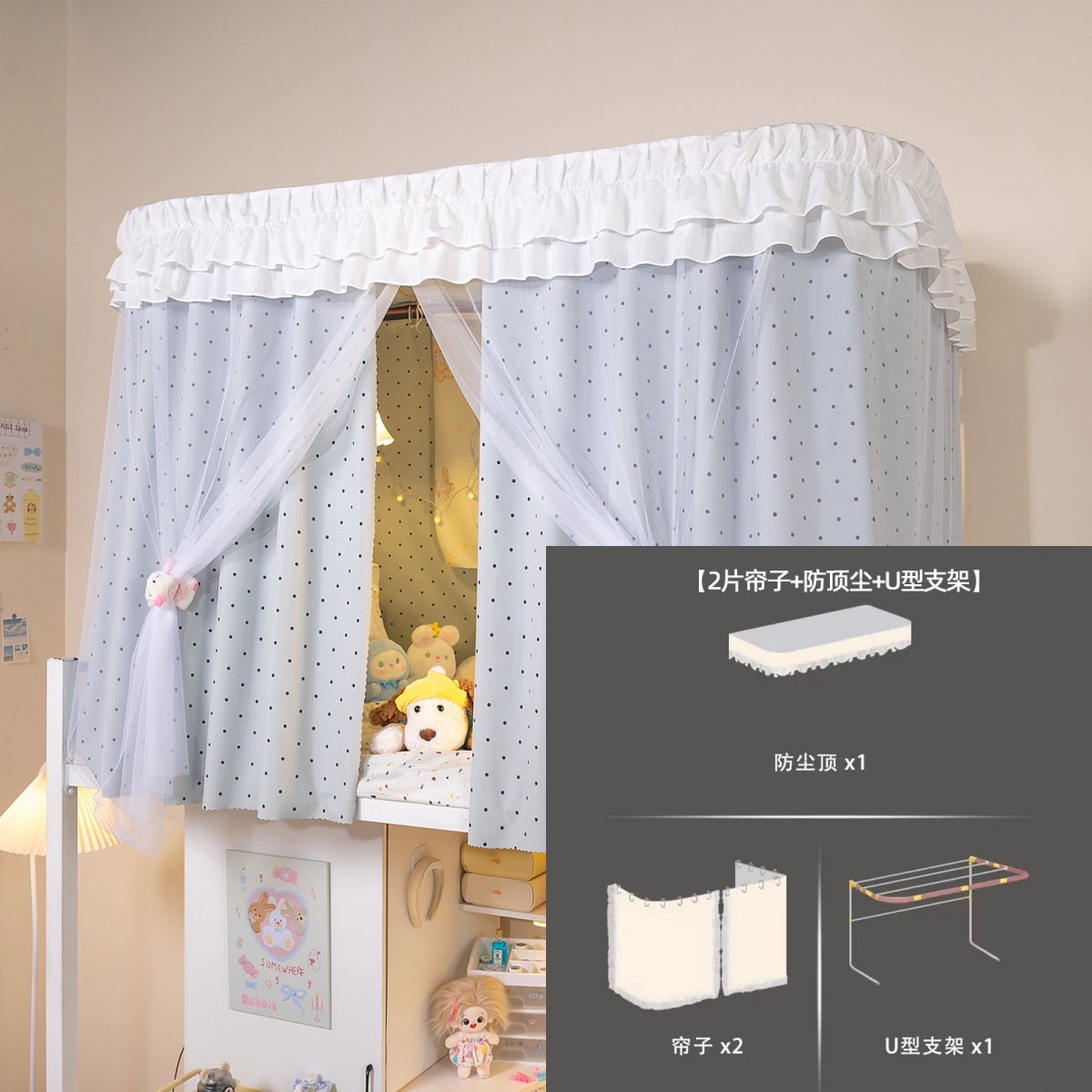 • 상부 침대 바다 소금 물방울 U자형 - 커튼 3개 + 상판 + 레이스 거즈 3개 + 브래킷