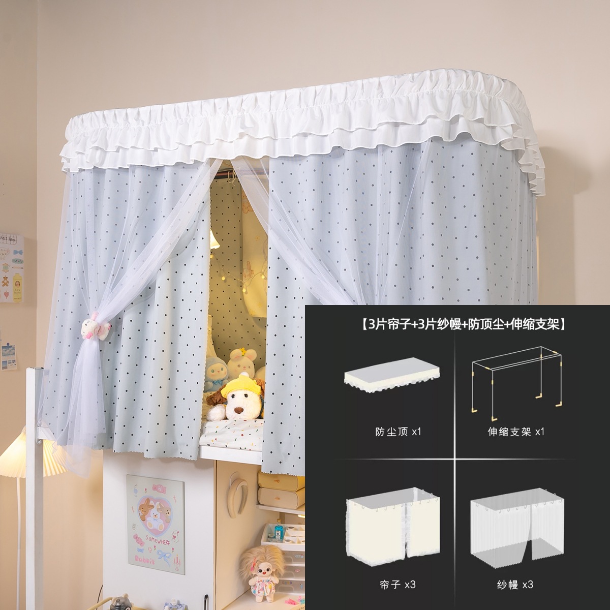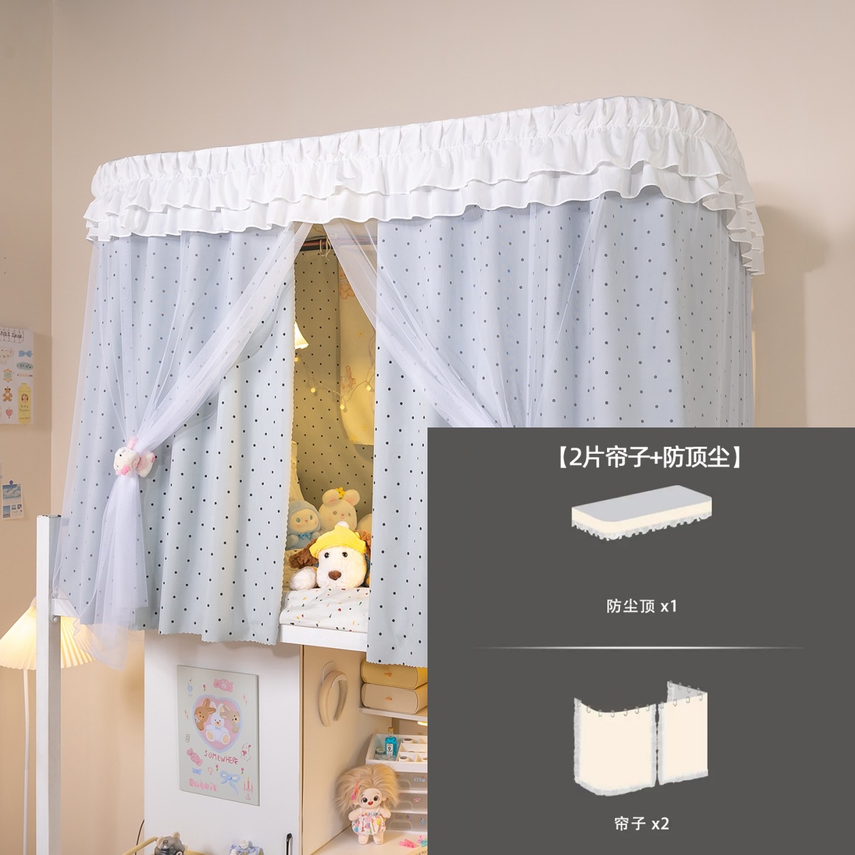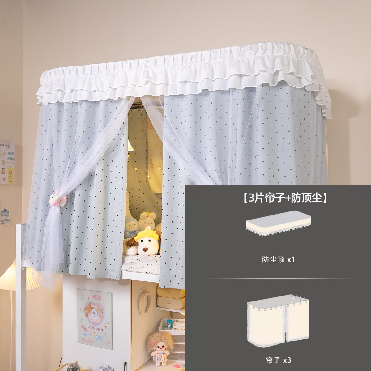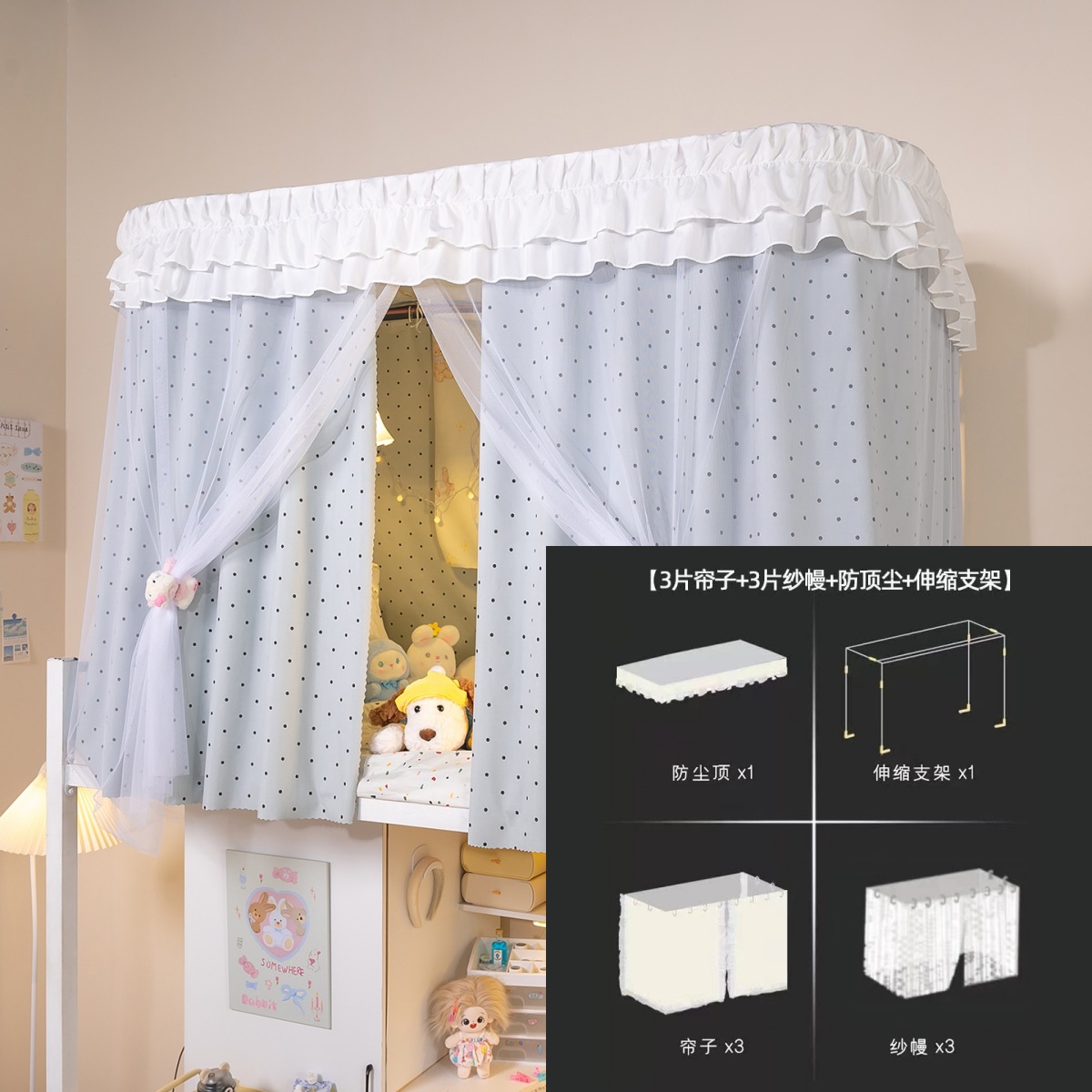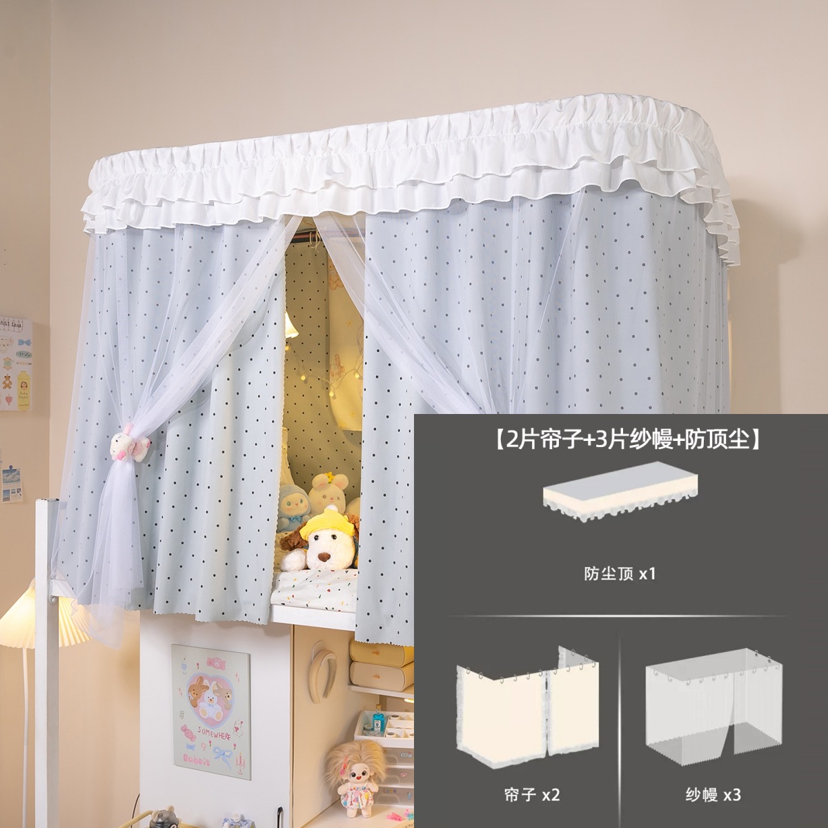 • 상부 침대 바다 소금 물방울 U자형 - 커튼 3개 + 상판 + 레이스 거즈 3개 + 브래킷