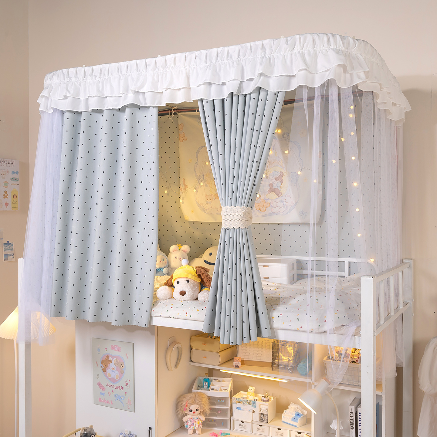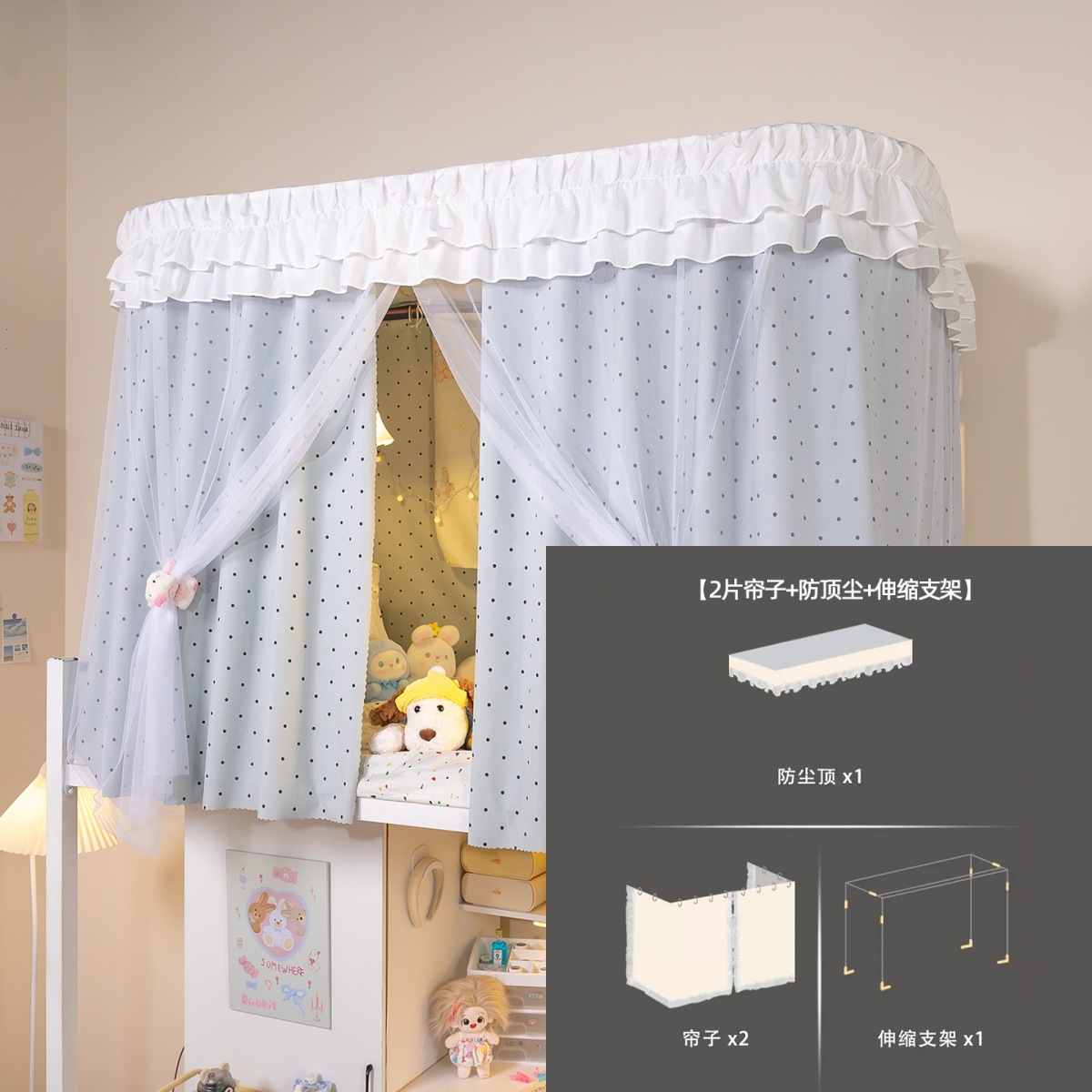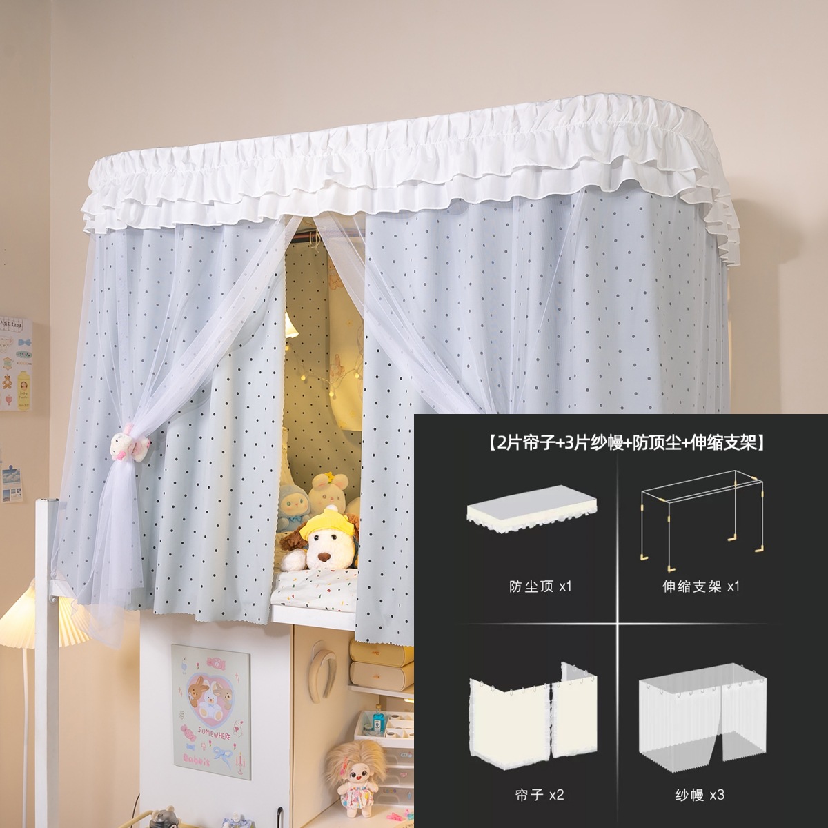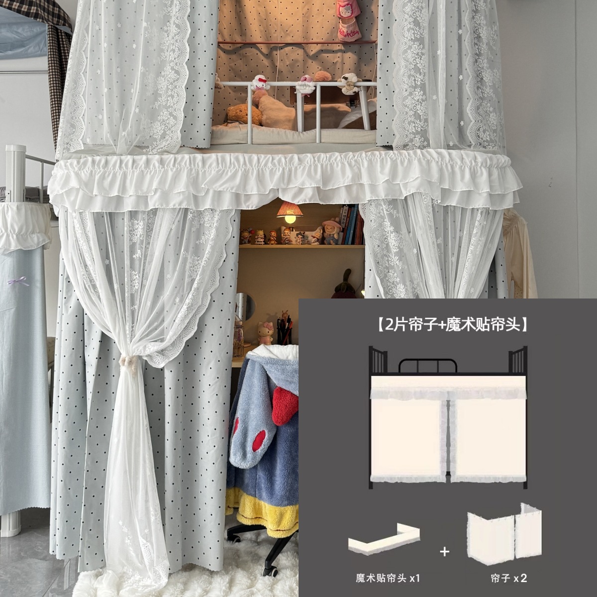 • 상부 침대 바다 소금 물방울 U자형 - 커튼 3개 + 상판 + 레이스 거즈 3개 + 브래킷
