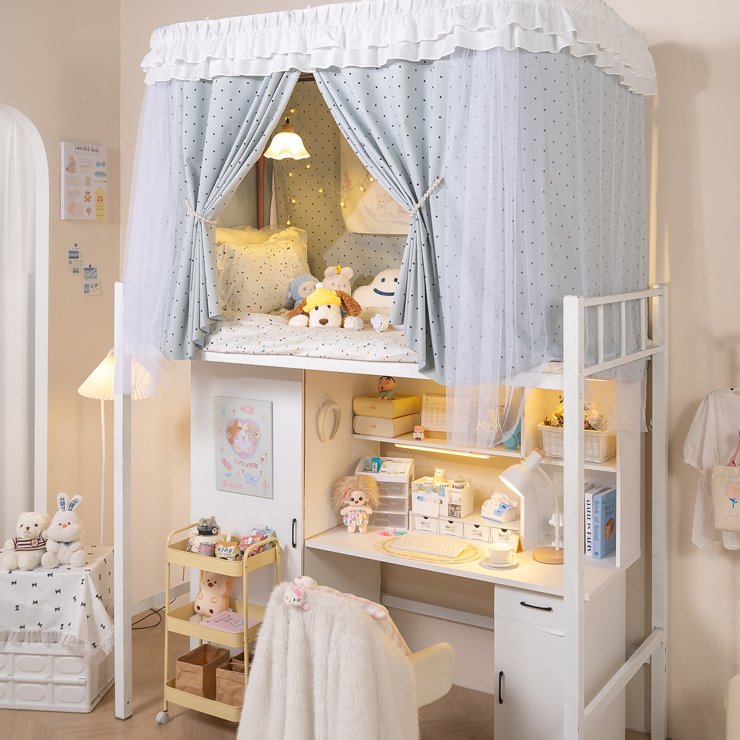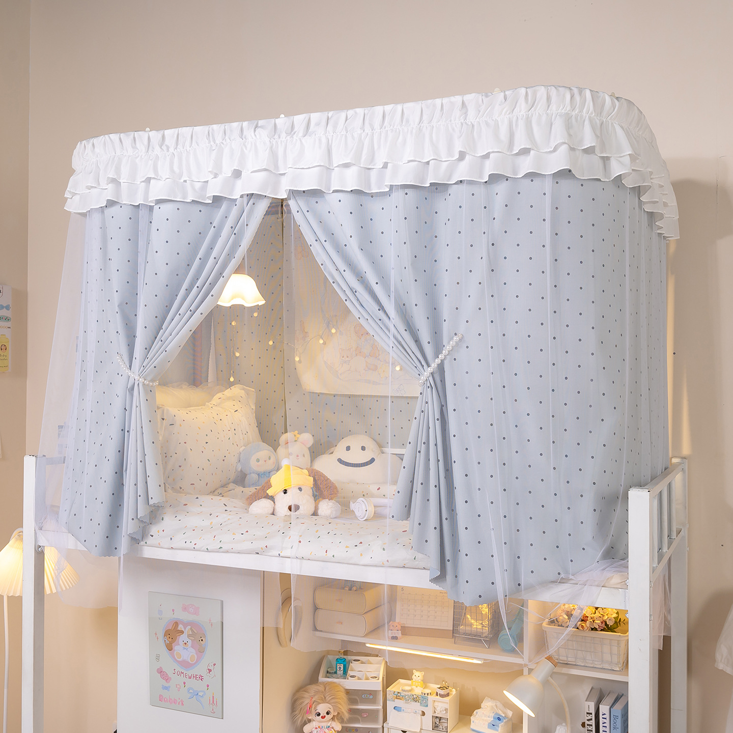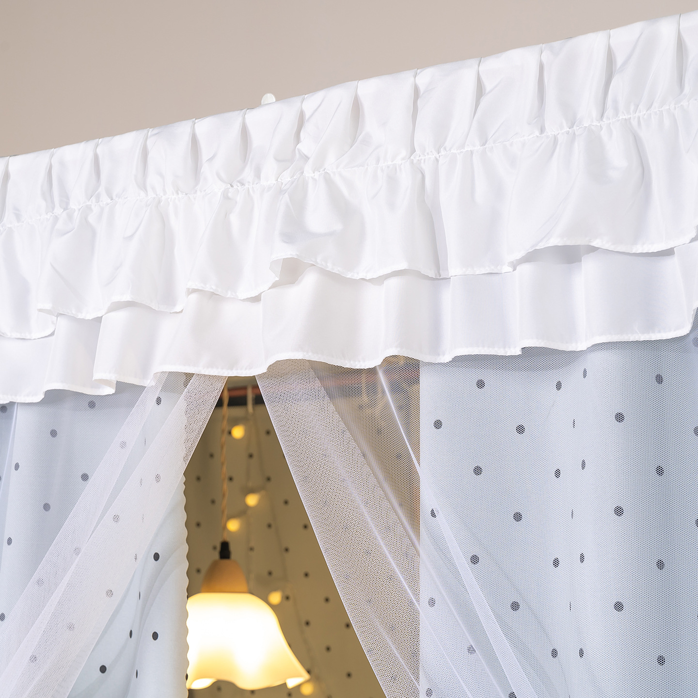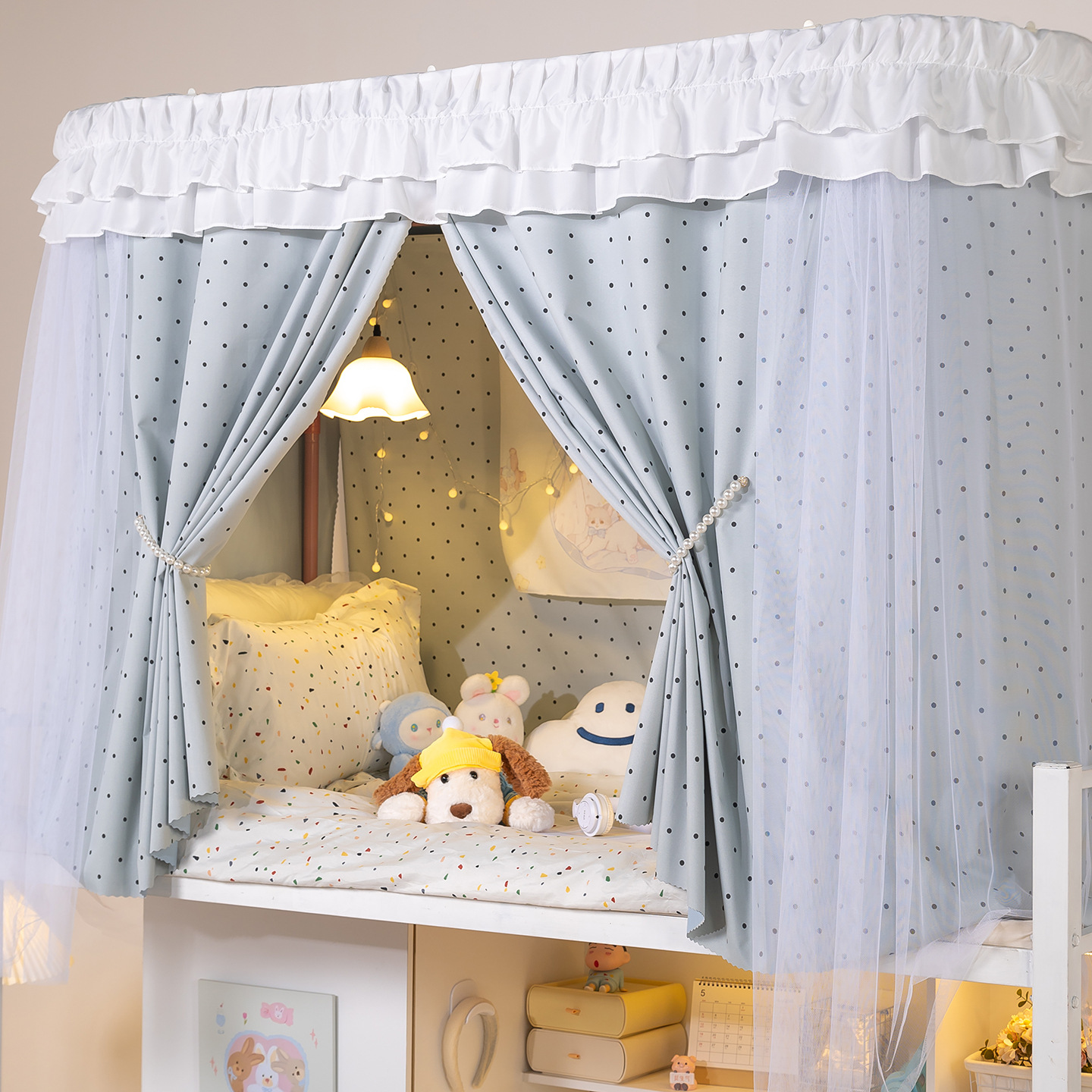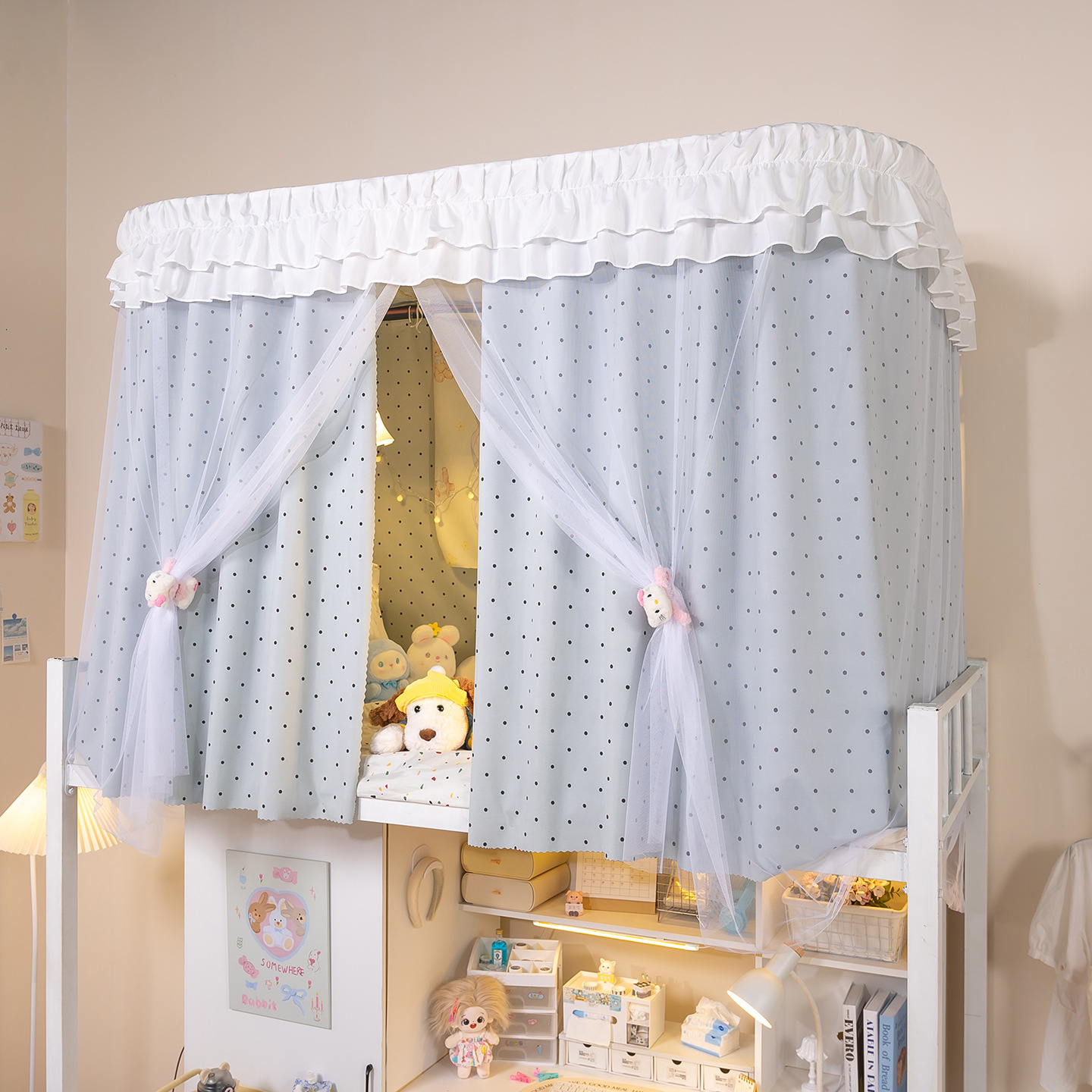 • 상부 침대 바다 소금 물방울 U자형 - 커튼 3개 + 상판 + 레이스 거즈 3개 + 브래킷