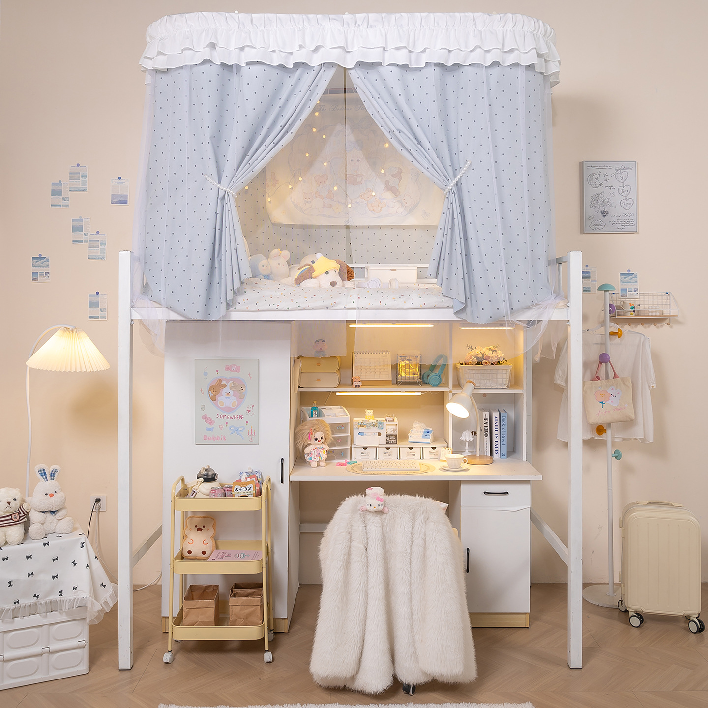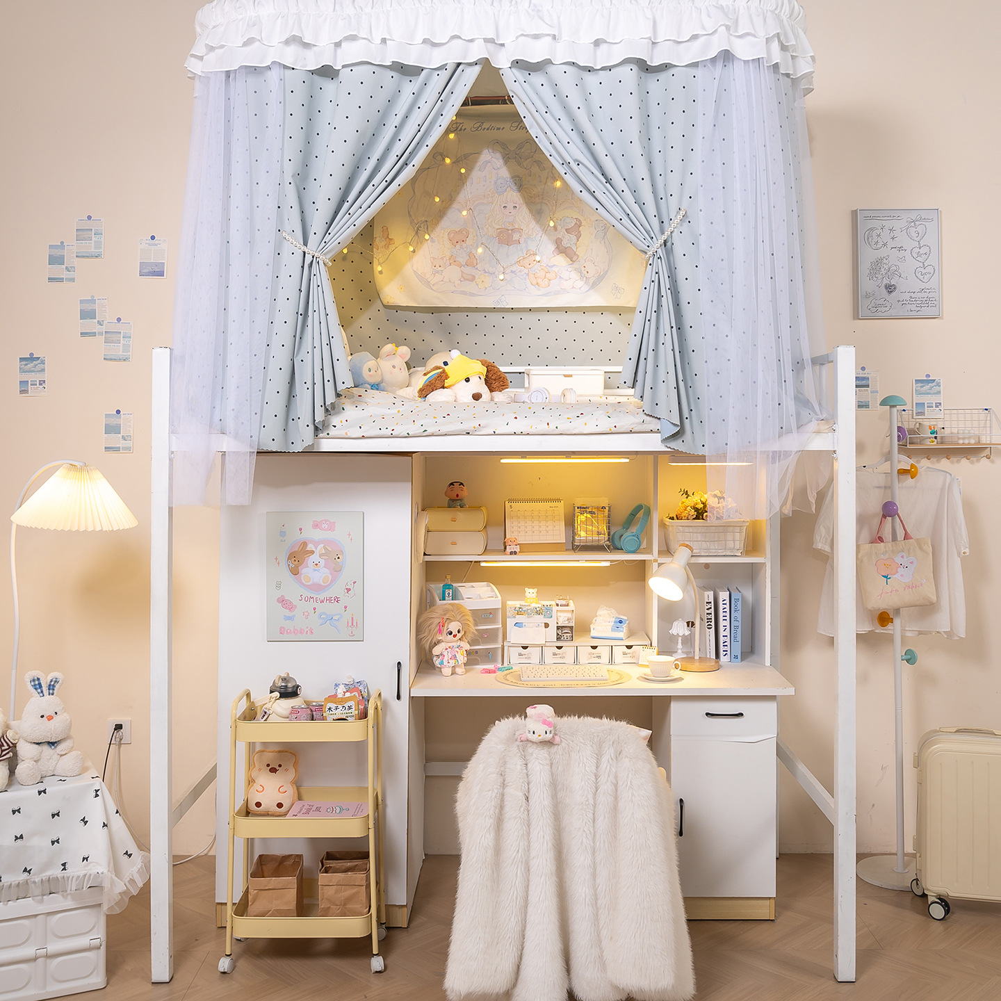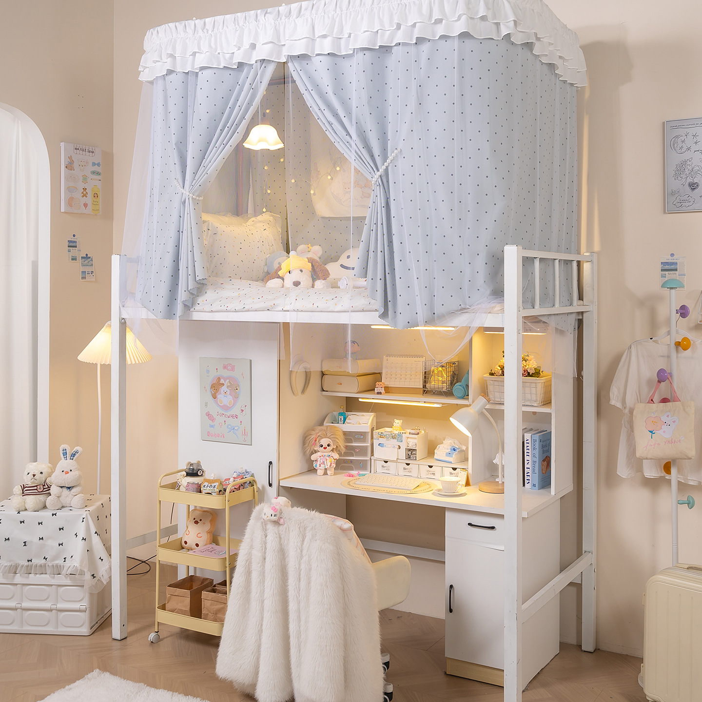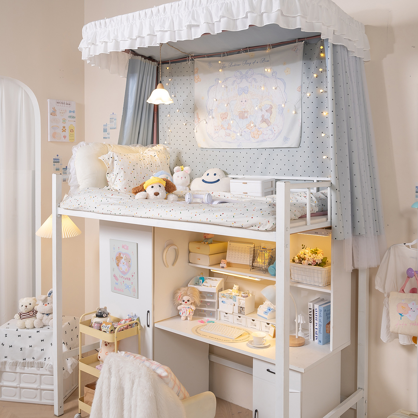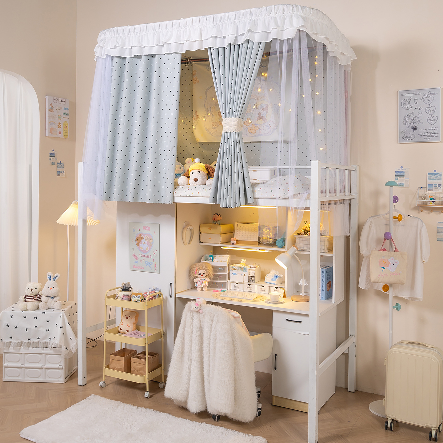 • 상부 침대 바다 소금 물방울 U자형 - 커튼 3개 + 상판 + 레이스 거즈 3개 + 브래킷