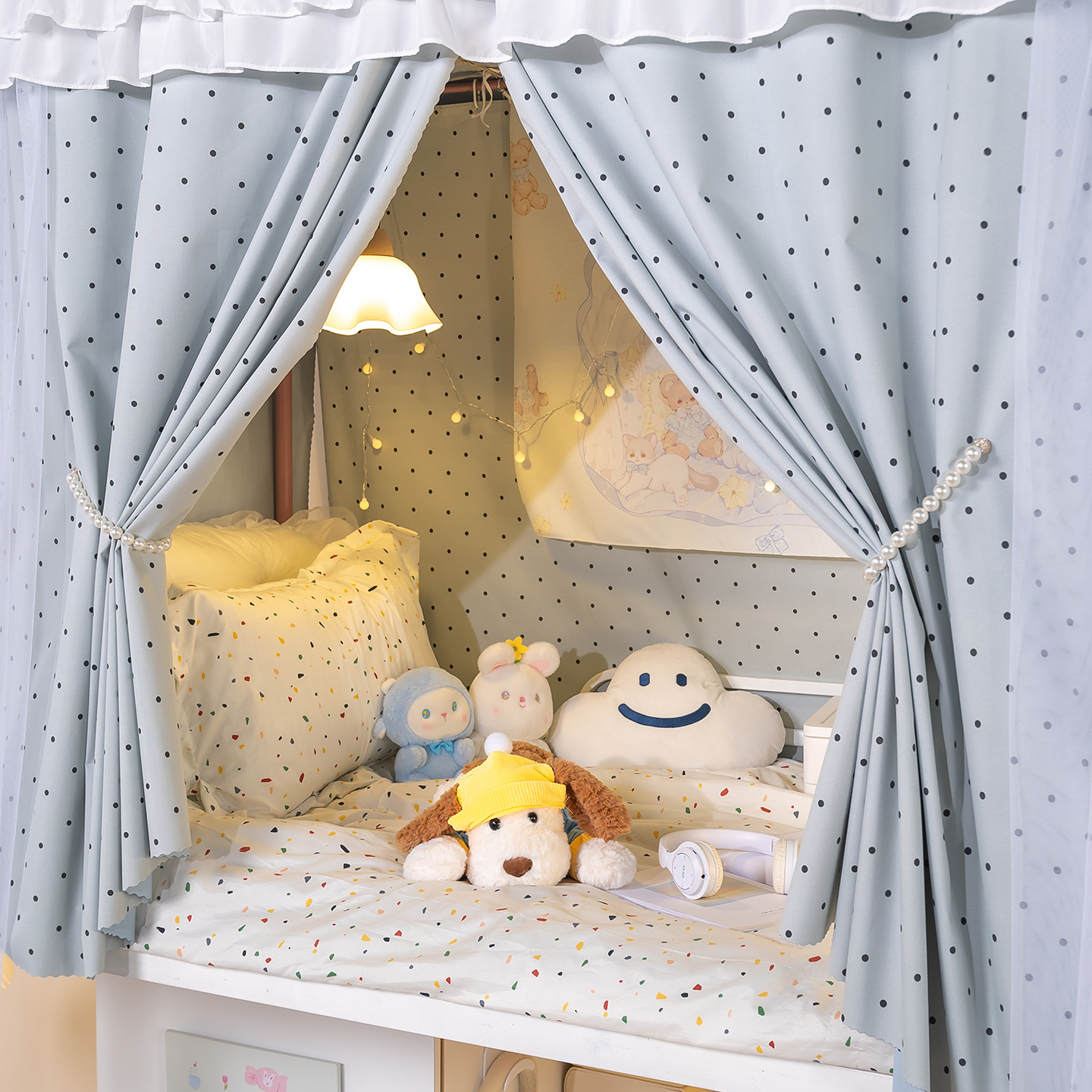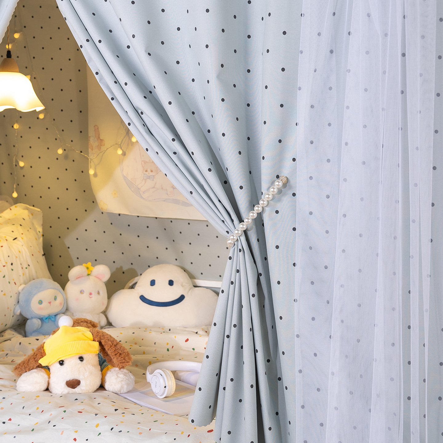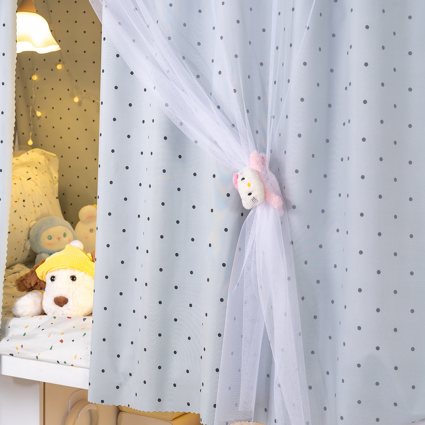 • 하부 침대 바다 소금 물방울 무늬 - 커튼 2개 + 일반 실 3개 + 벨크로 커튼 헤드