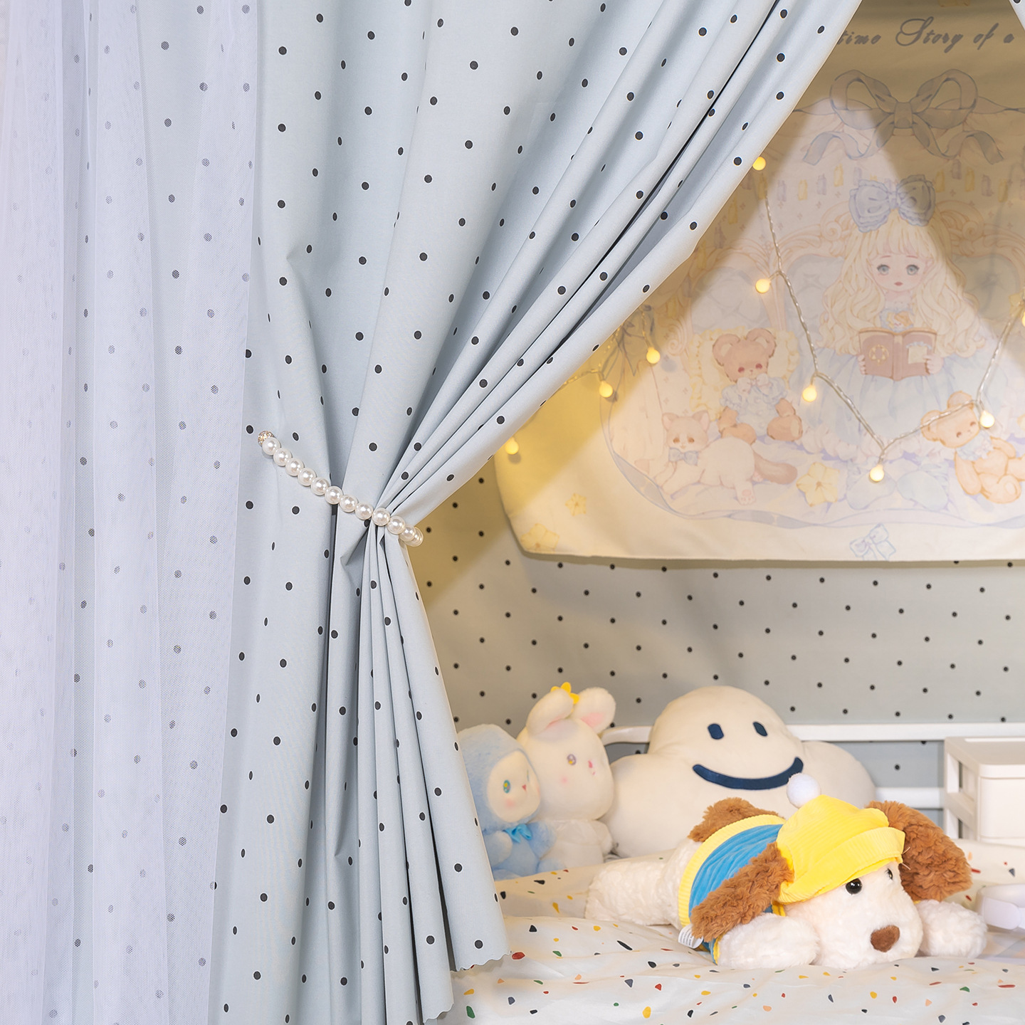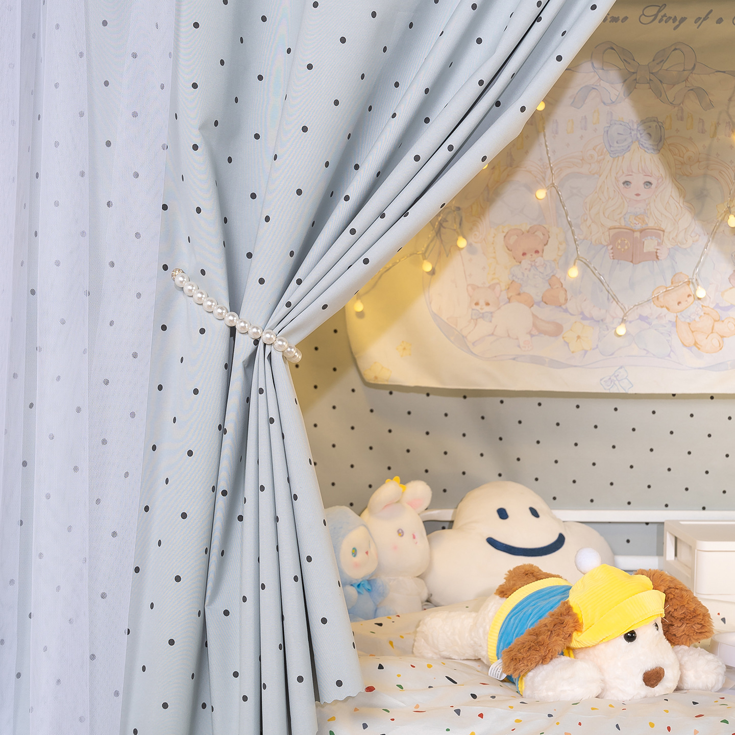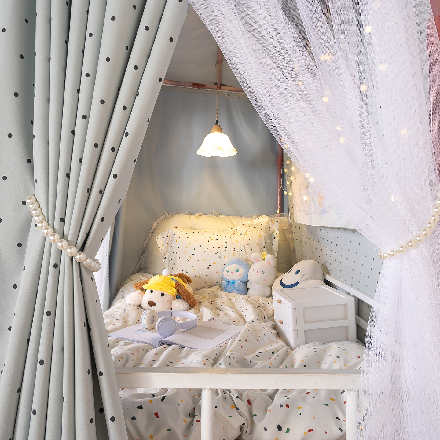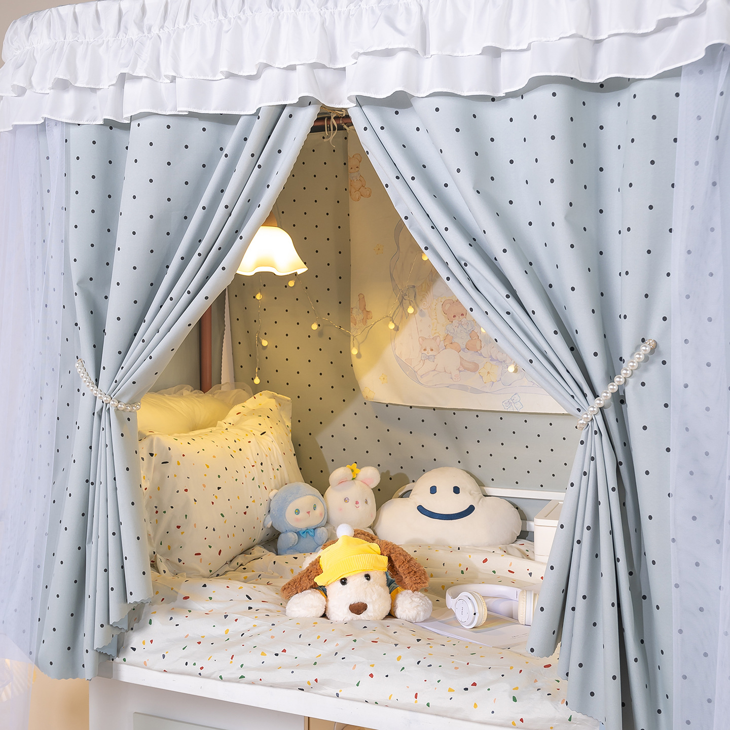 • 하부 침대 바다 소금 물방울 무늬 - 커튼 2개 + 일반 실 3개 + 벨크로 커튼 헤드