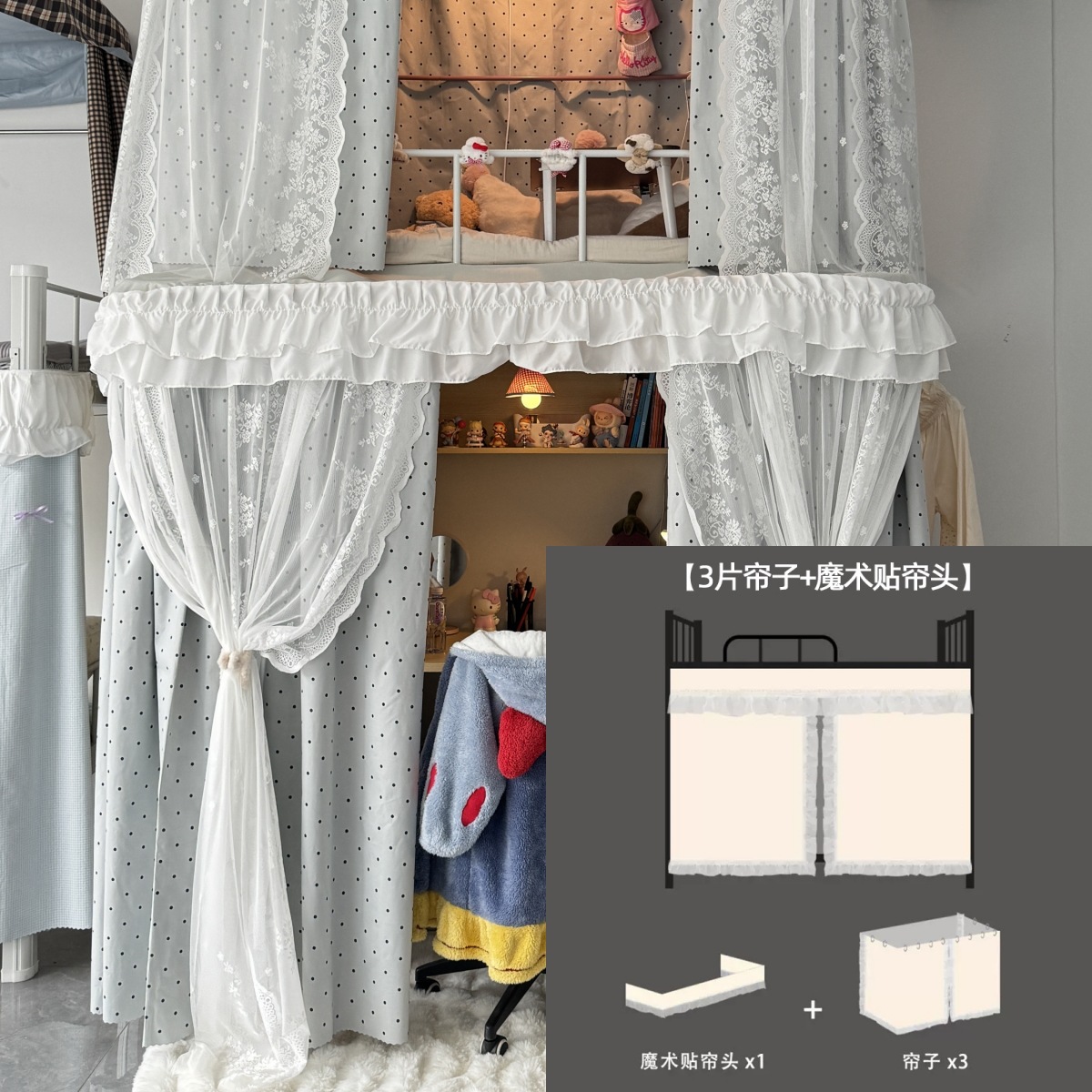 • 하부 침대 바다 소금 물방울 무늬 - 커튼 3개 + 레이스 원사 3개 + 벨크로 커튼 헤드