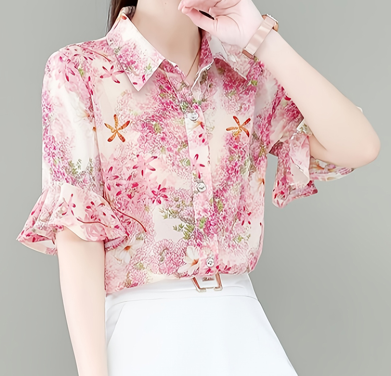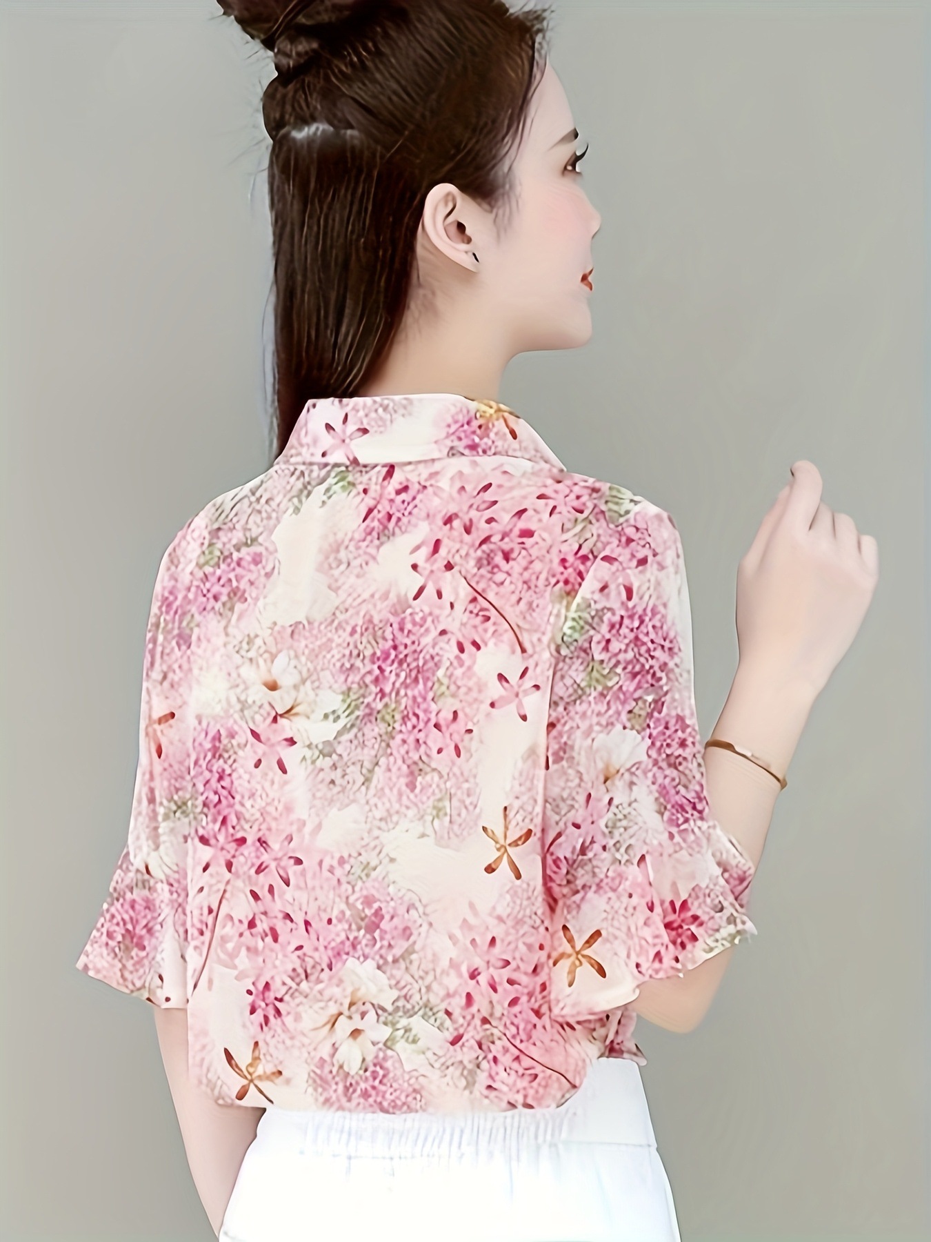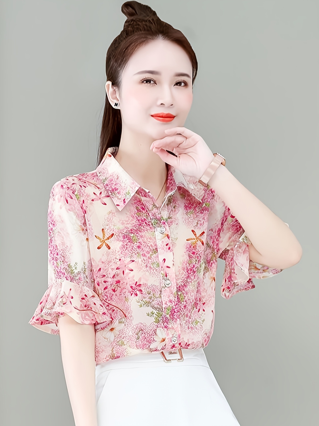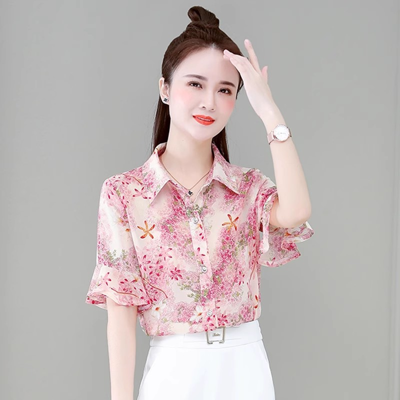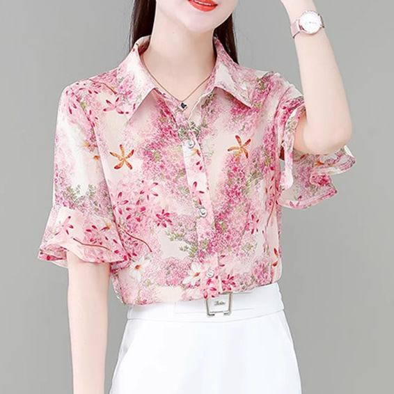 여성용 쉬폰 셔츠 2025 여름 새로운 스타일 패셔너블하고 연령을 줄여주는 스타일 탑 인기 다용도 꽃무늬 셔츠스토어 가기