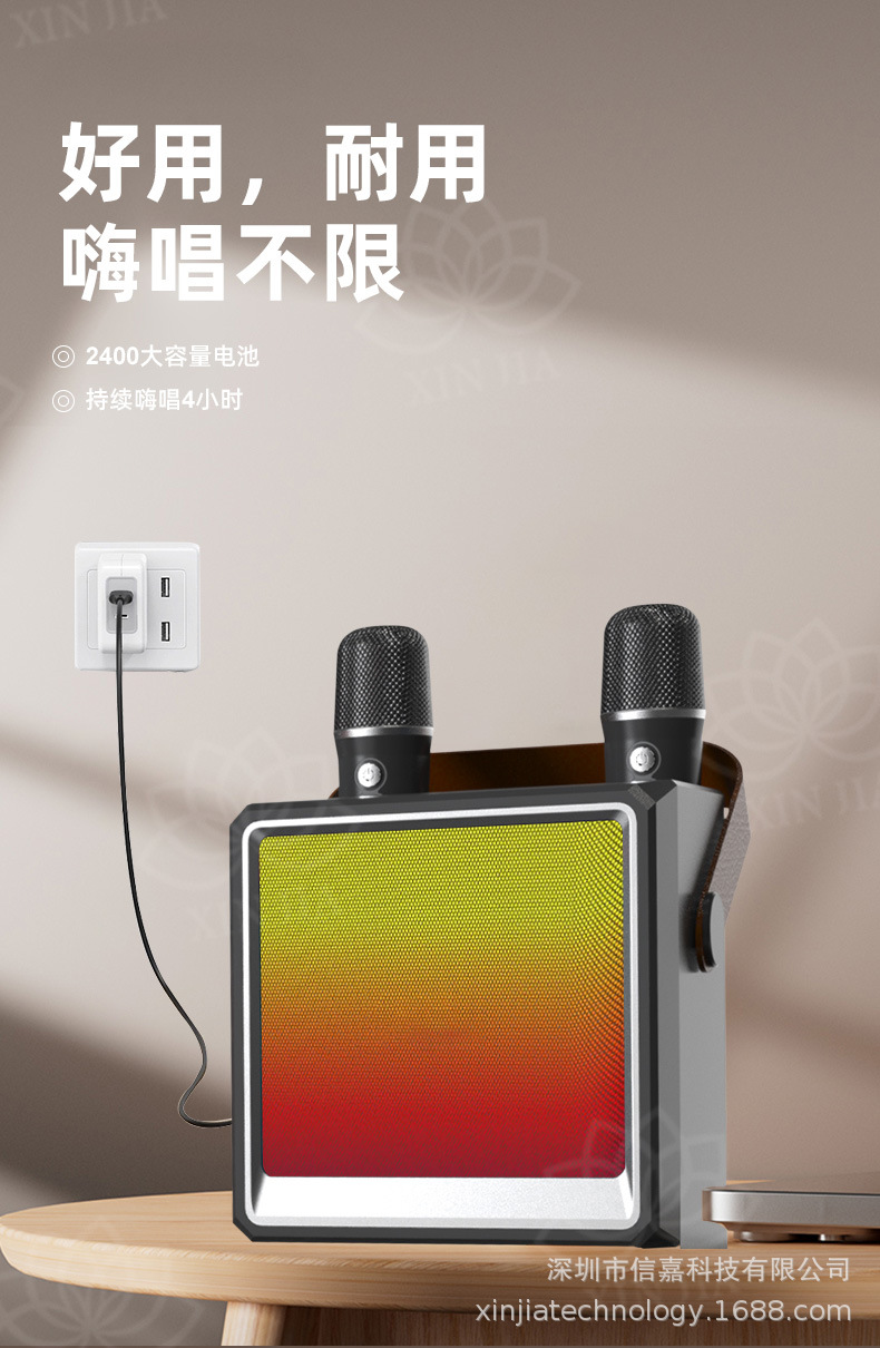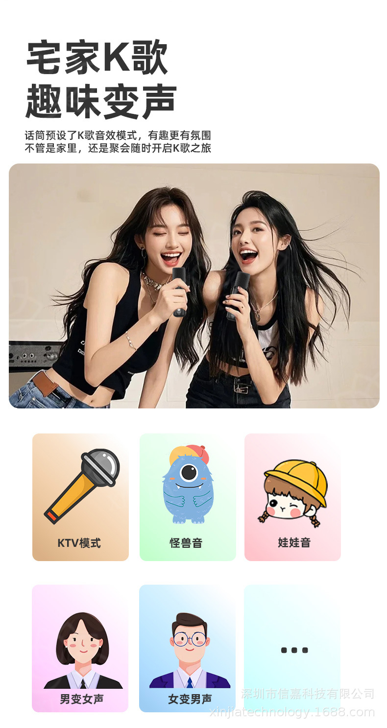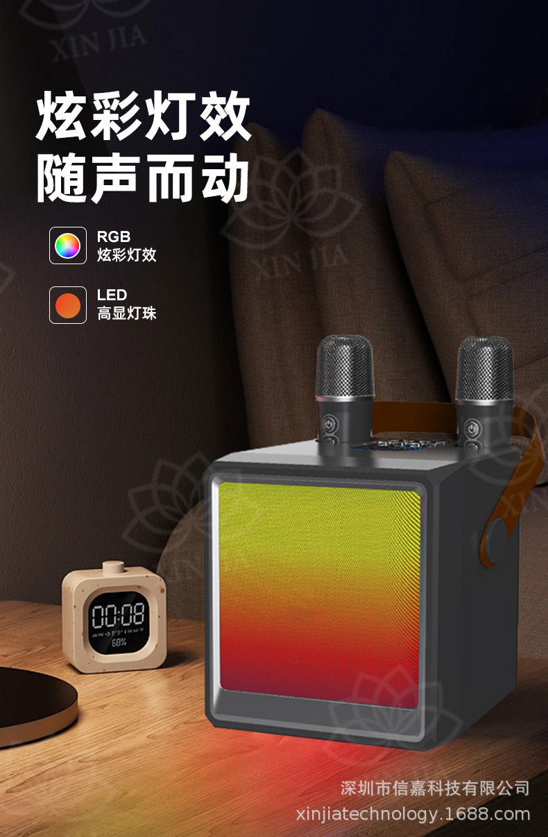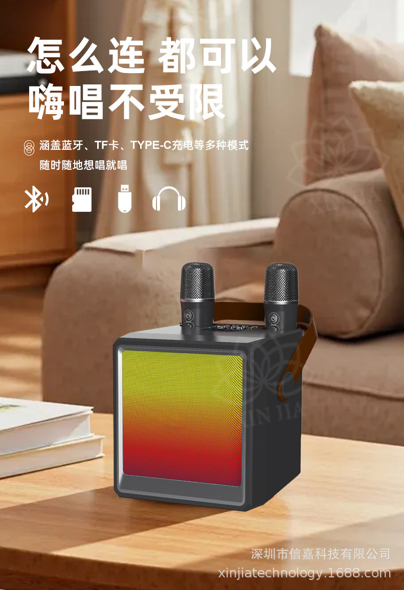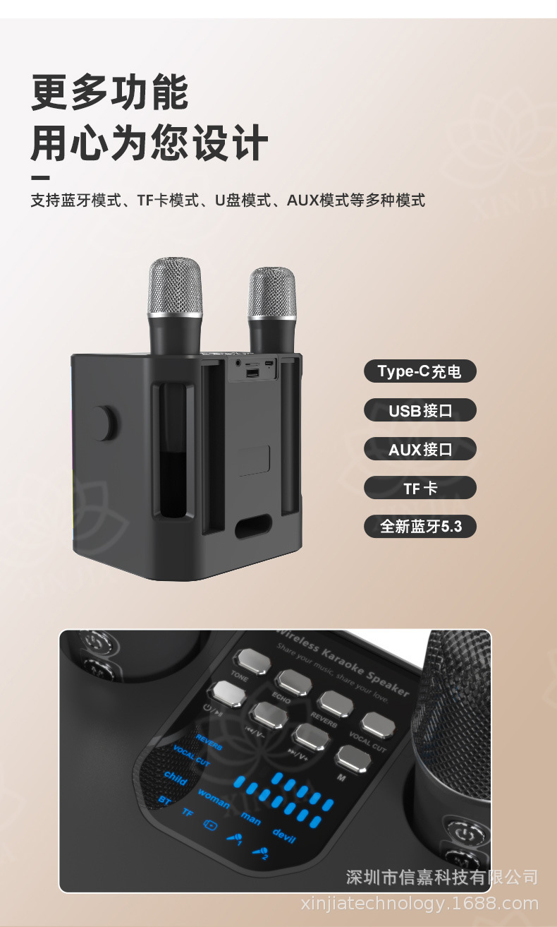 产品功能: 蓝牙、TF卡、 USB 、AUX 、 K歌、变音、魔音、消原音